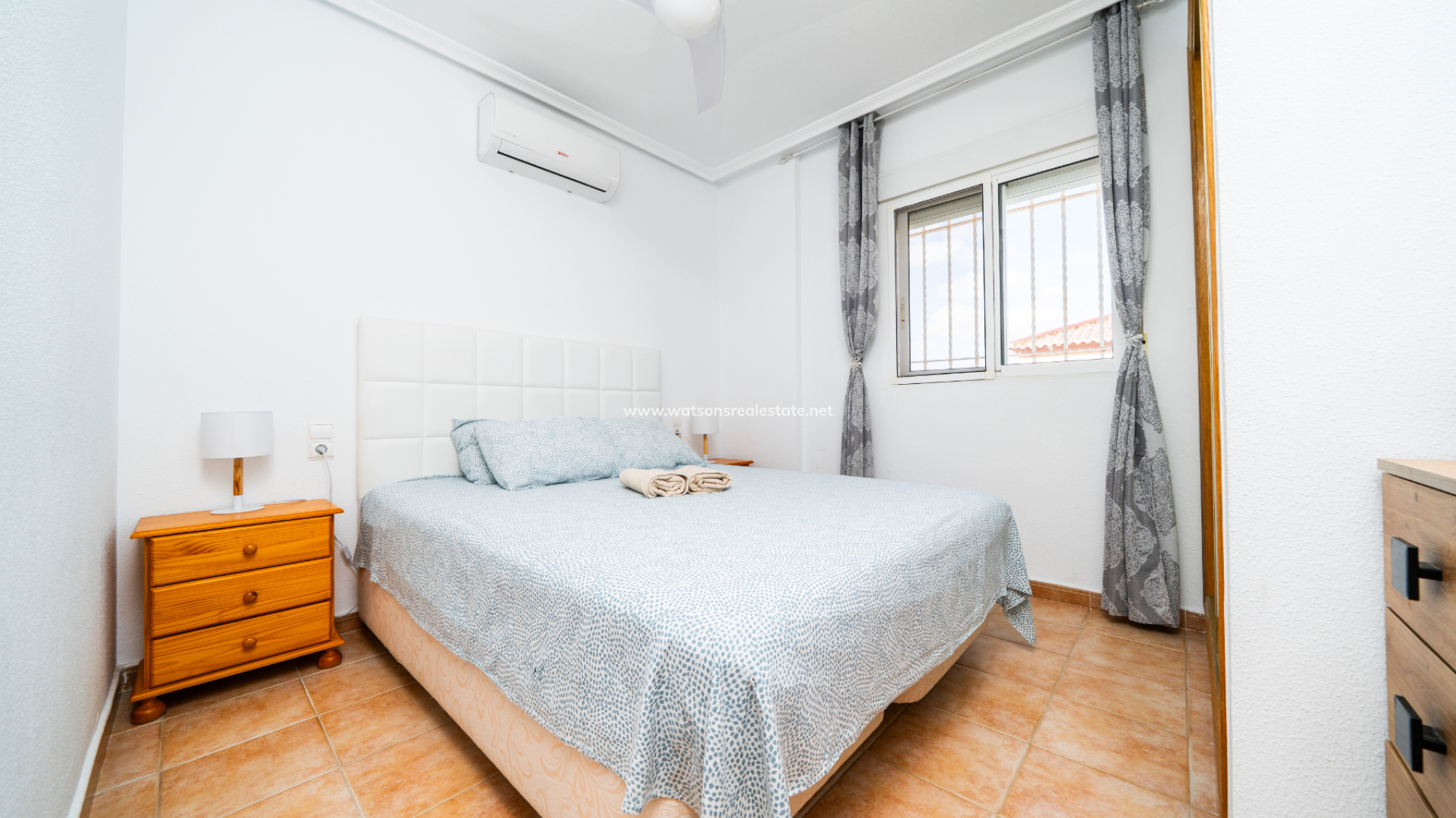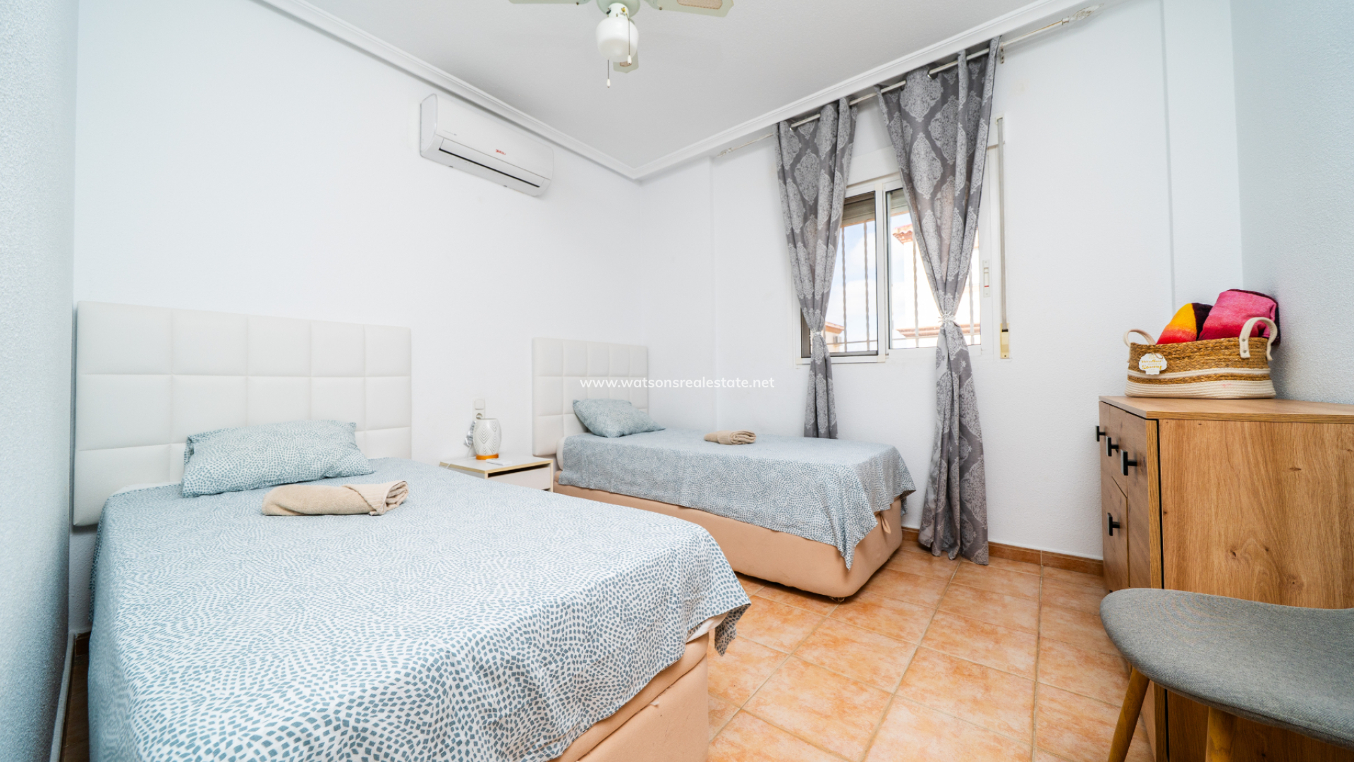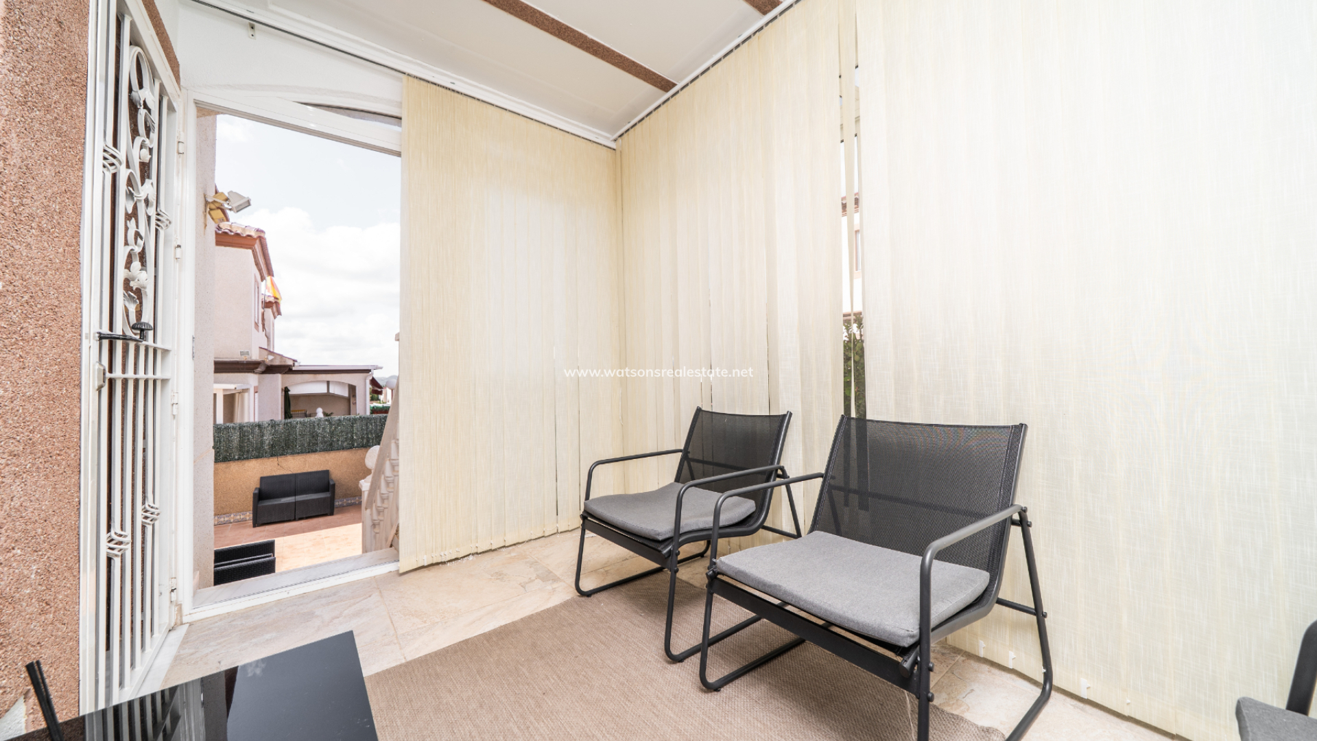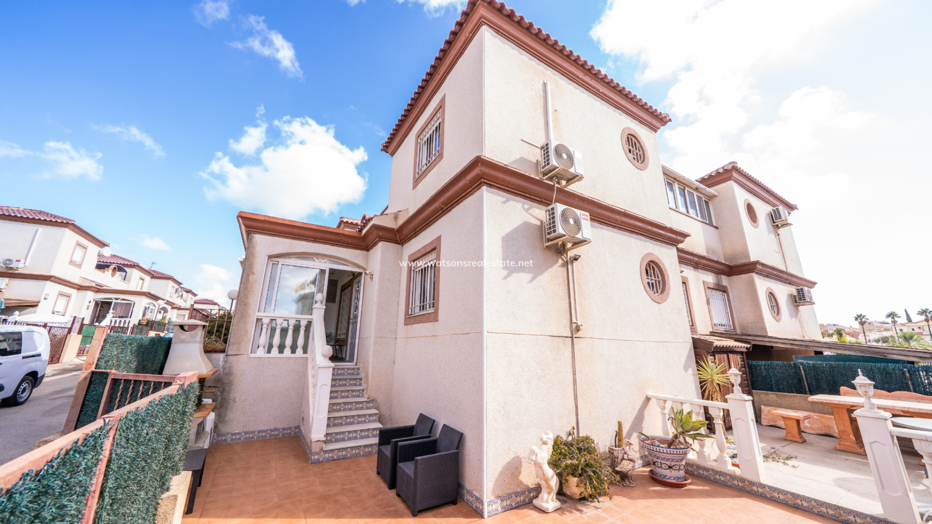 Dieses attraktive, nach Südwesten ausgerichtete Haus verfügt über eine verglaste Veranda mit einem entspannenden Sitzbereich, der zu einem geräumigen Wohnzimmer mit Klimaanlage und Deckenventilator führt, sowie eine separate, voll ausgestattete Küche mit Zugang zu einem Hauswirtschafts- und Abstellraum. Es gibt drei Schlafzimmer, alle mit Einbauschränken, Deckenventilatoren und Klimaanlage. Zwei der Schlafzimmer befinden sich im Erdgeschoss zusammen mit einem der Badezimmer, das eine Badewanne in voller Größe aufweist. Im ersten Stock finden wir das dritte Schlafzimmer, das Hauptschlafzimmer, das geschmackvolle Einbauschränke mit Spiegeln hat. Das Badezimmer auf dieser Ebene hat eine ebenerdige Dusche.