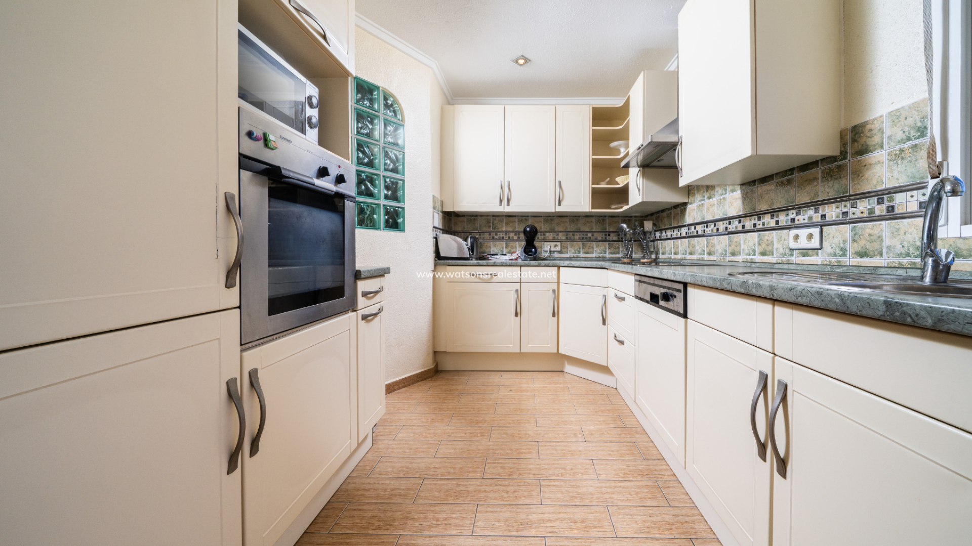 Una terraza soleada elevada con zona de estar conduce a un vestíbulo cubierto y al interior de la propiedad, donde nos recibe un espacioso y luminoso salón-comedor que lleva a una cocina independiente equipada con un elegante arco de bloques de vidrio y focos. Desde aquí, una puerta de acceso conduce a la terraza trasera con zona de comedor y vistas a la zona verde comunitaria.