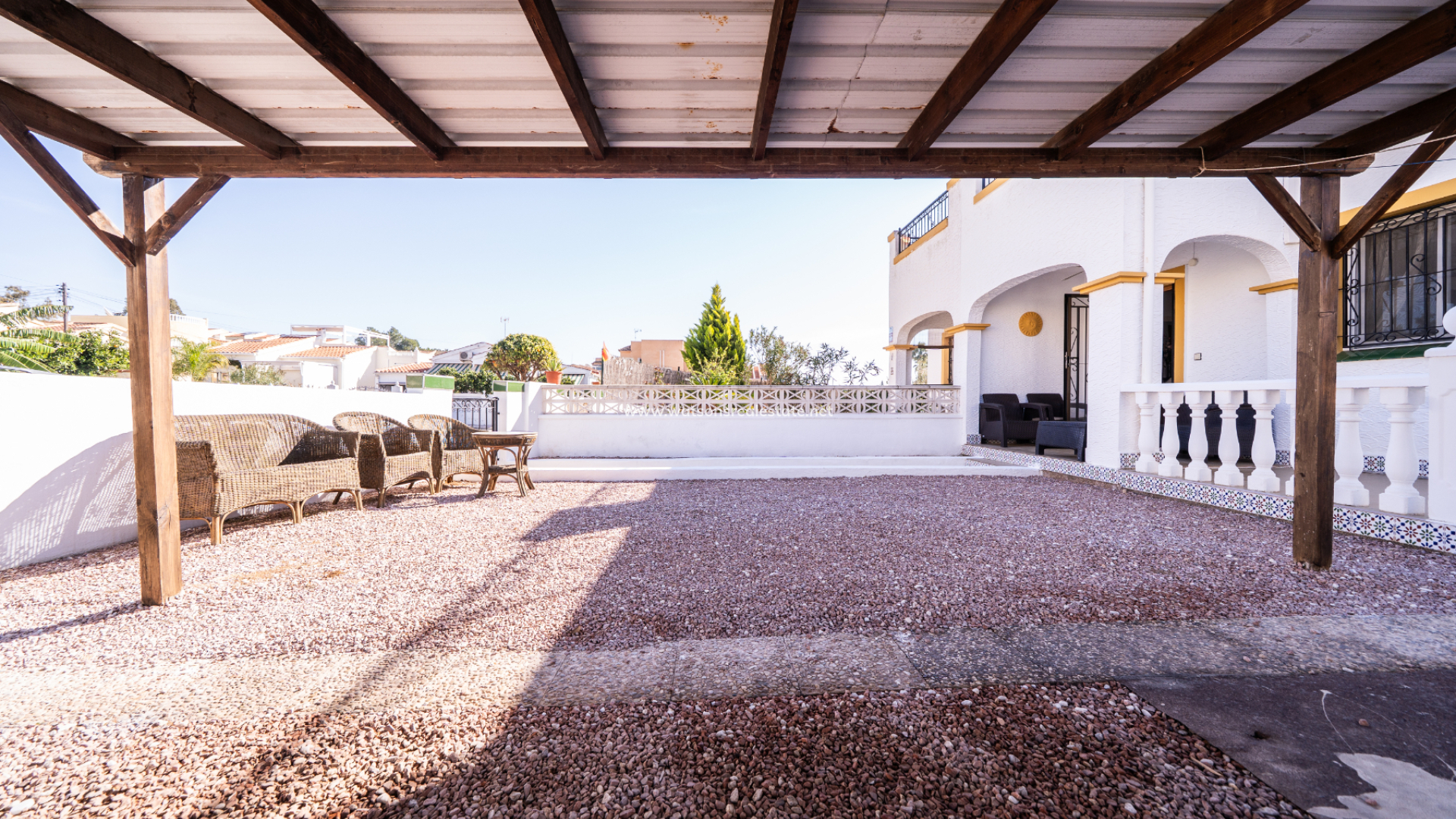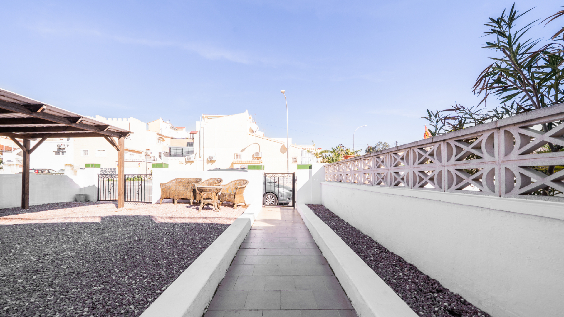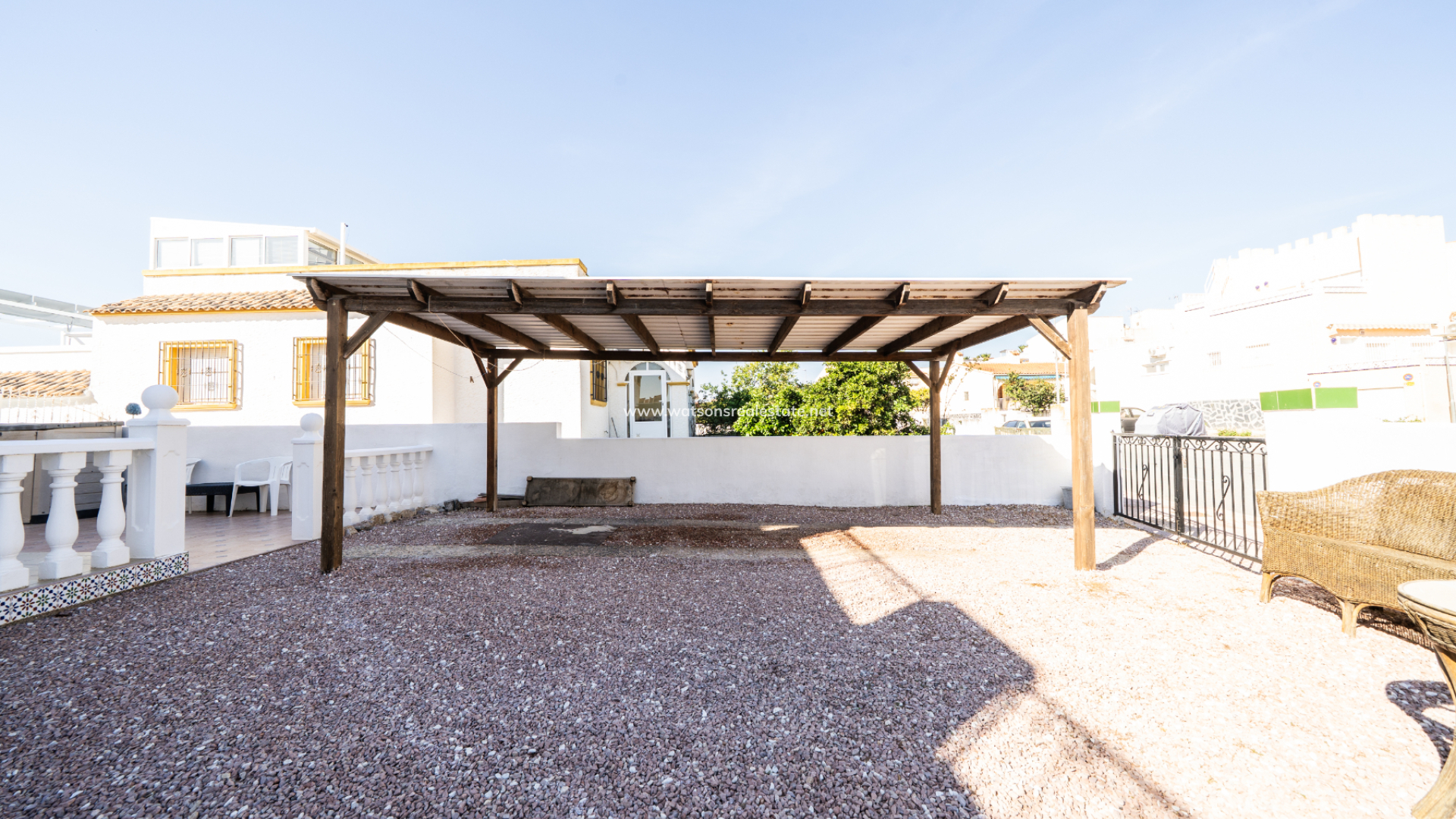 En la parte delantera, hay un jardín de grava de bajo mantenimiento que cuenta con una pérgola de madera y un área dedicada a la preparación exterior con espacio para comedor y barbacoa, ideal para recibir a familiares y amigos. ➡️ Un garaje techado de madera (carport) proporciona un cómodo aparcamiento privado, y un porche cubierto crea una entrada acogedora y un lugar agradable para relajarse a la sombra.