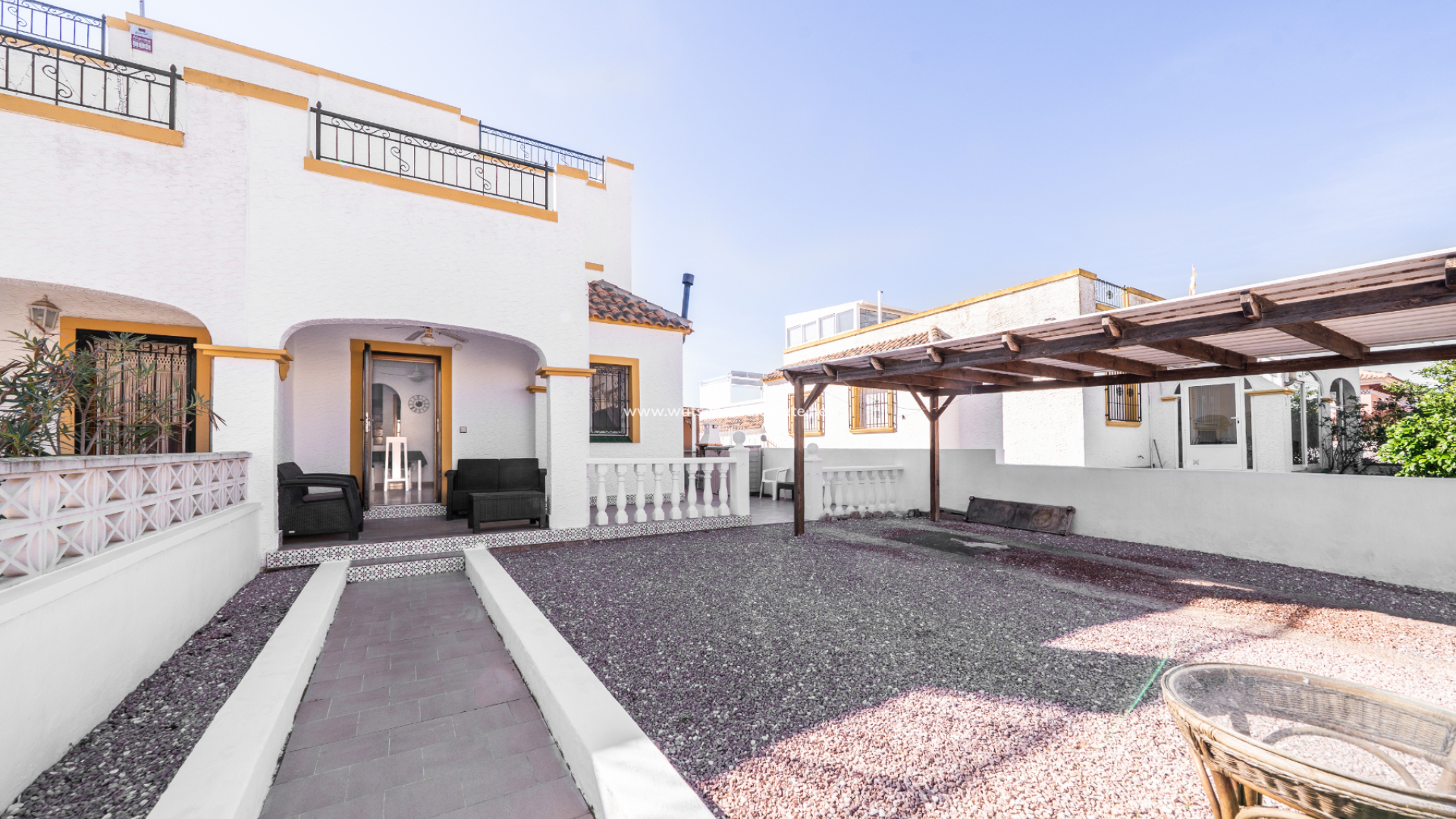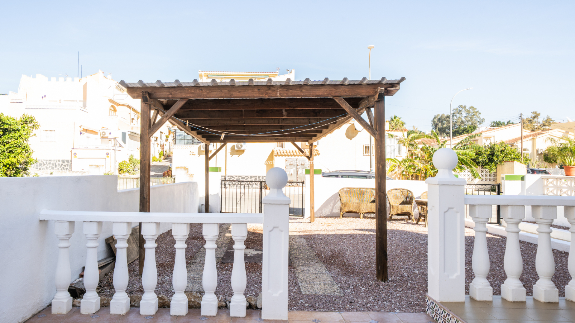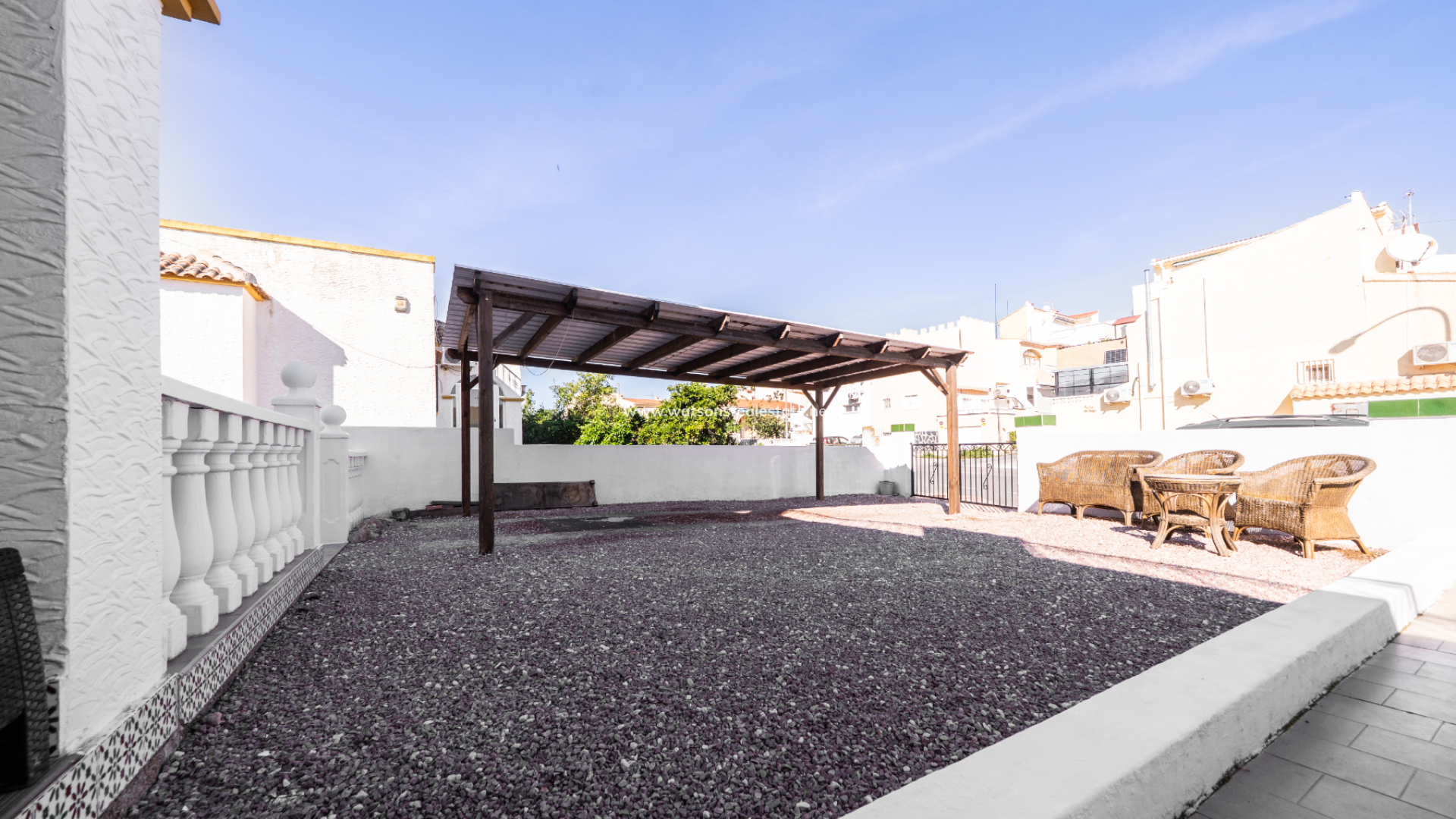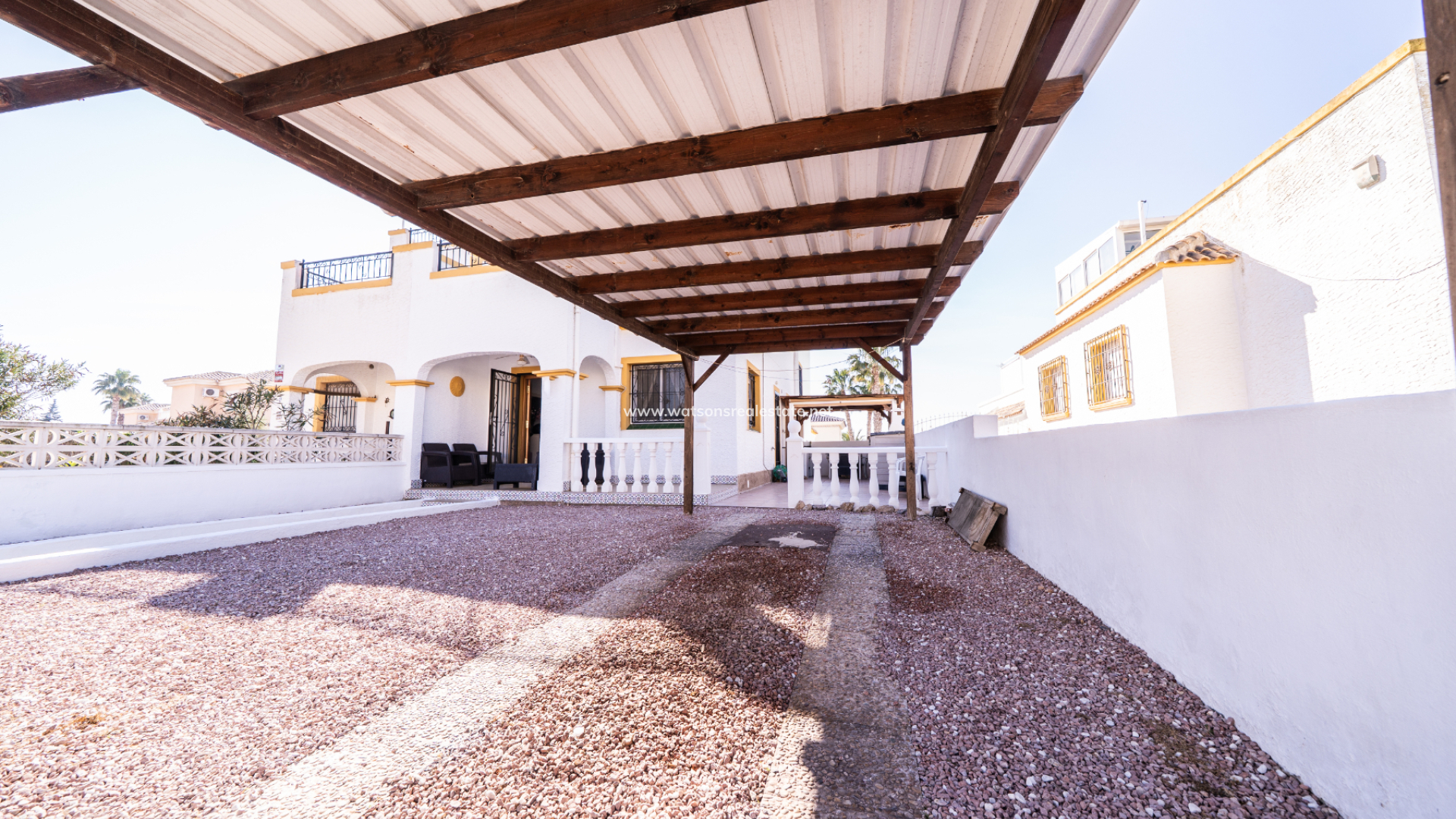 En la parte delantera, hay un jardín de grava de bajo mantenimiento que cuenta con una pérgola de madera y un área dedicada a la preparación exterior con espacio para comedor y barbacoa, ideal para recibir a familiares y amigos. ➡️ Un garaje techado de madera (carport) proporciona un cómodo aparcamiento privado, y un porche cubierto crea una entrada acogedora y un lugar agradable para relajarse a la sombra.