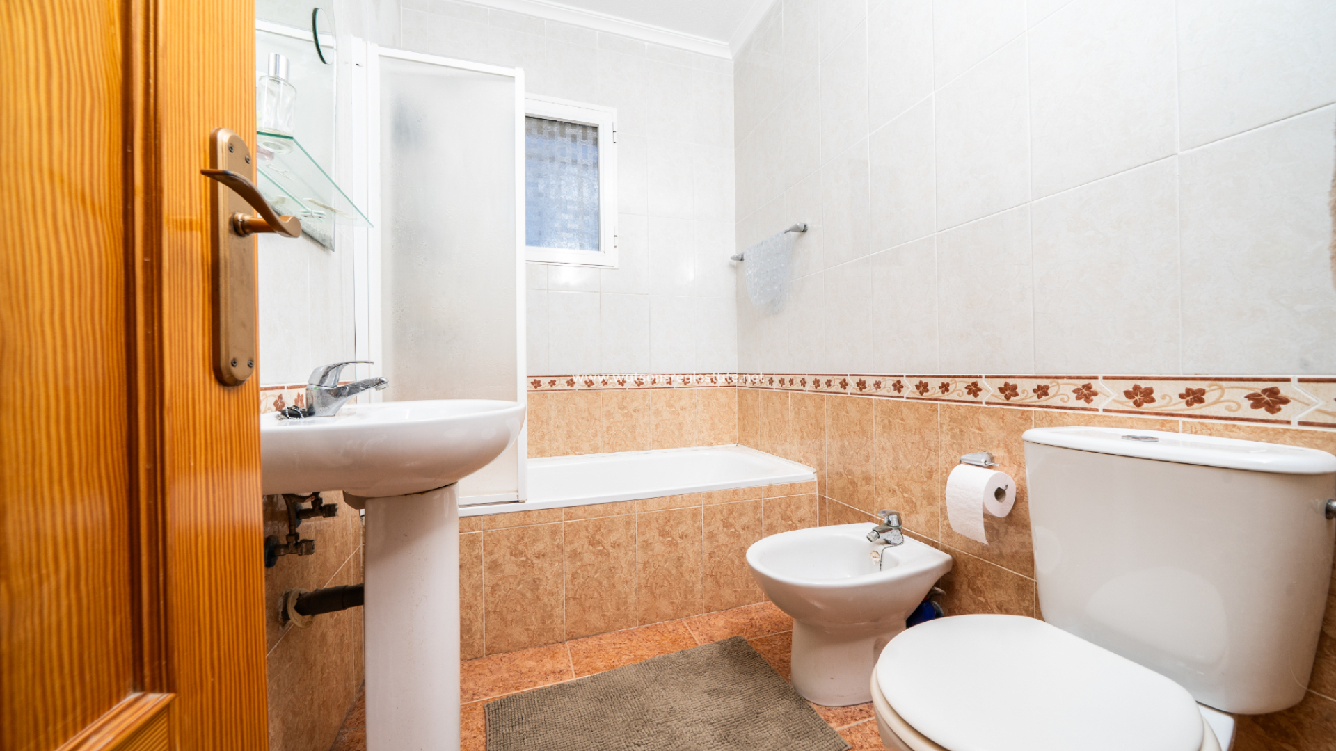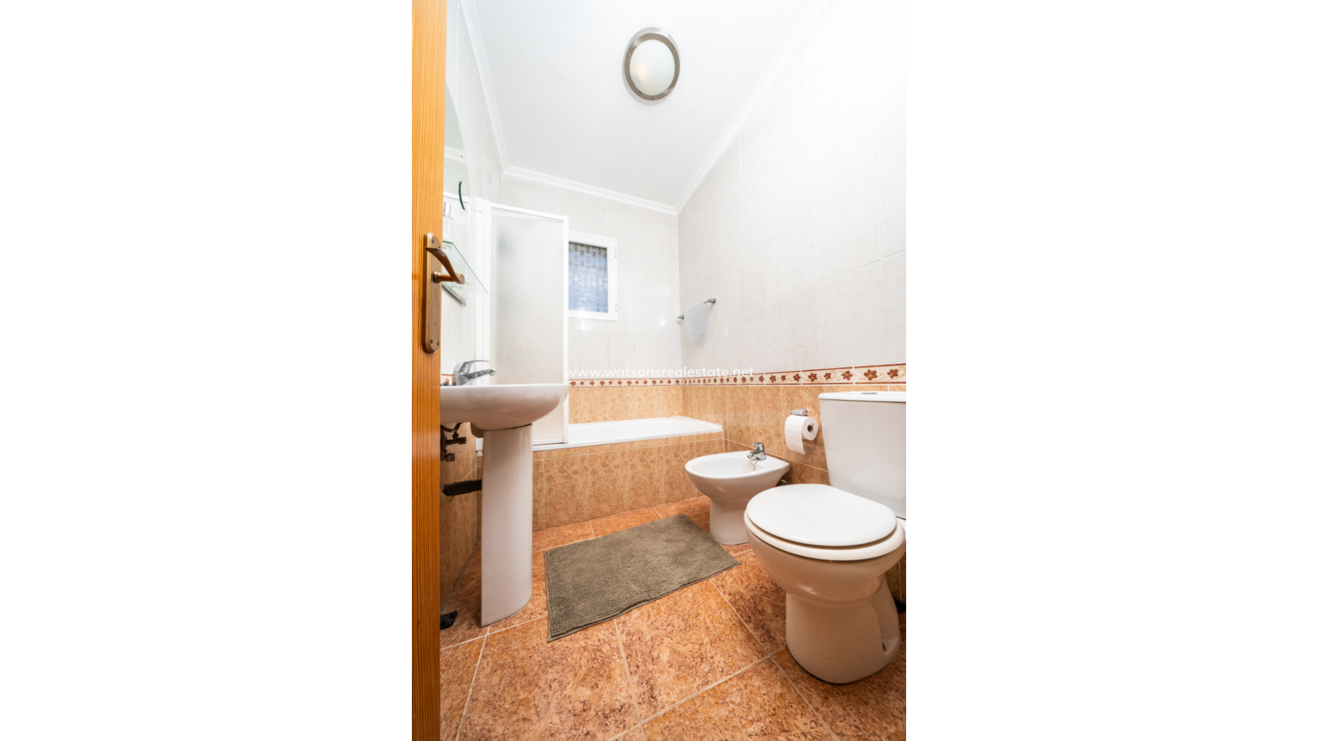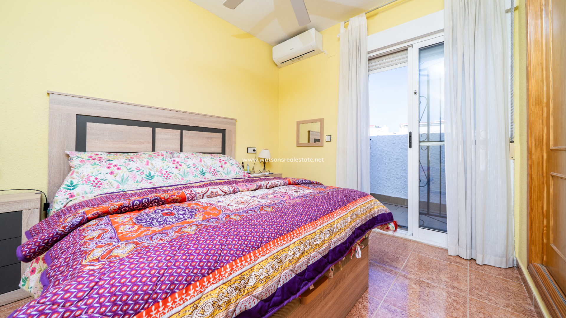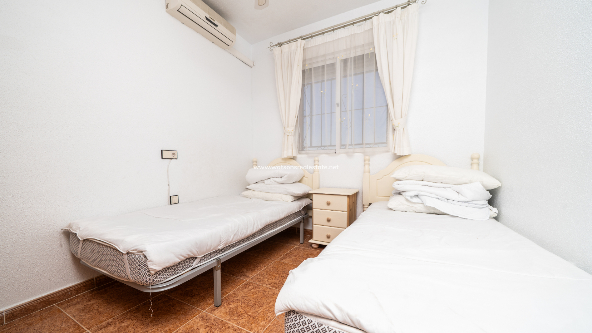La propiedad ofrece tres dormitorios, todos con armarios empotrados, aire acondicionado y ventilador de techo. El primero es una habitación doble, el segundo es una habitación con dos camas individuales y, finalmente, el dormitorio principal, que cuenta con puertas de patio que dan a un balcón privado. Hay un cuarto de ducha con inodoro y lavabo, así como un baño familiar equipado con bañera con ducha, bidé, inodoro y lavabo.