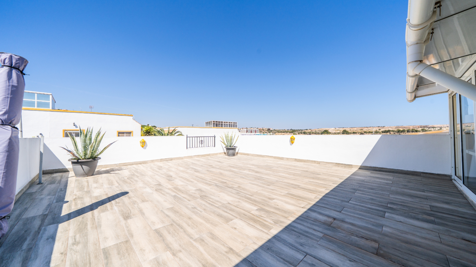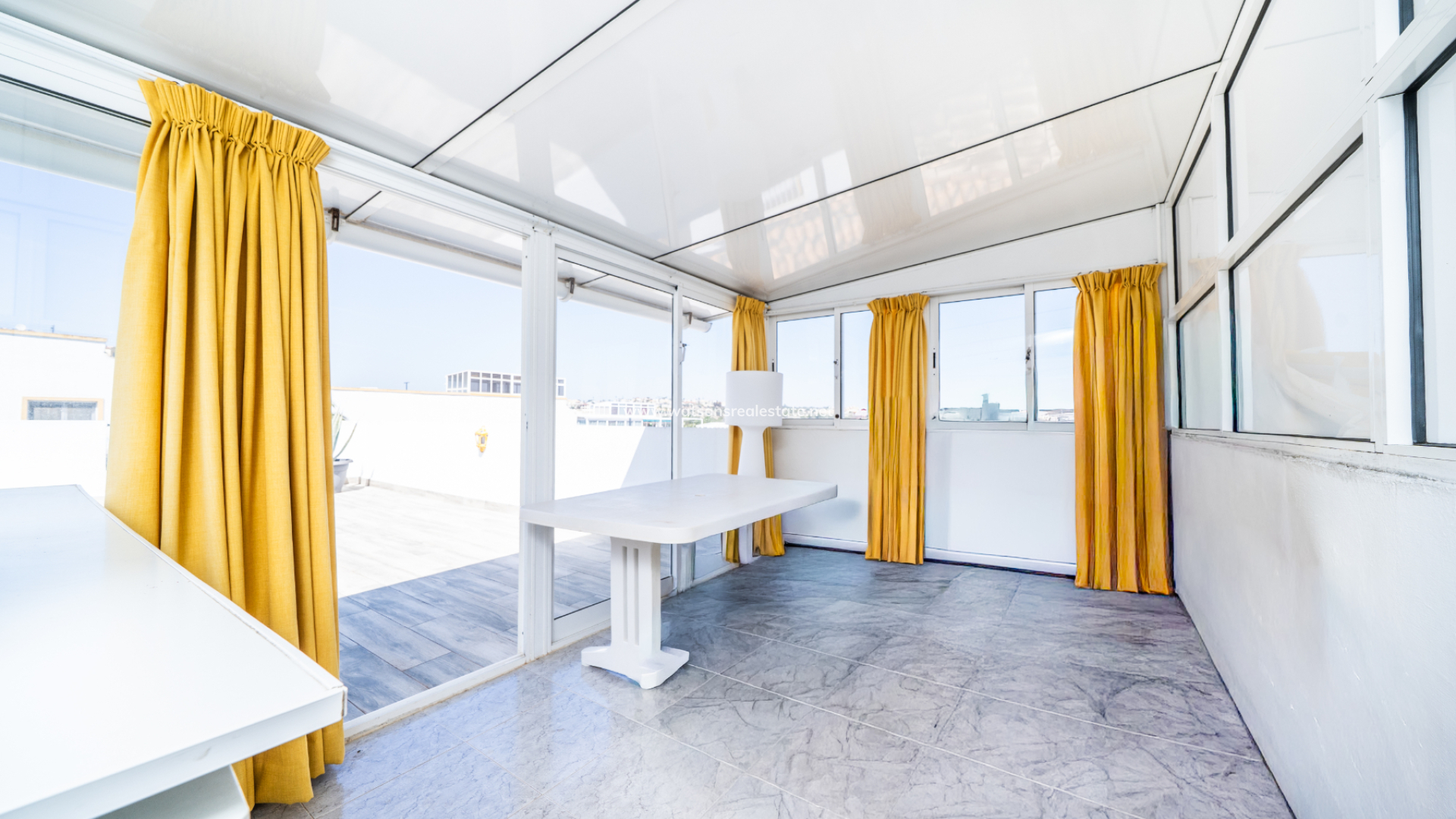 Desde la cocina, encontramos un área de galería/almacenamiento donde las escaleras conducen a un porche acristalado con puertas de patio que se abren a un generoso solárium en la azotea, que ofrece vistas despejadas de los alrededores.
