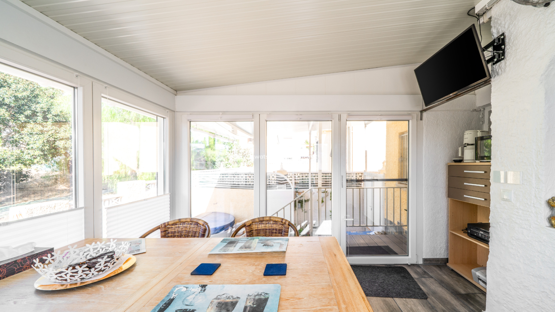Het huis beschikt over een uitnodigende hal die uitkomt op een lichte en comfortabele woonkamer met een houtkachel en dubbele beglazing. De hoofdslaapkamer is een royale tweepersoonskamer met airconditioning en een infraroodverwarming, terwijl de tweede slaapkamer momenteel is ingericht als een inloopkast. De badkamer is uitgerust met een bad / douche, WC en een wastafelmeubel. De lichte, modern ogende keuken leidt naar ➡️ een grote serre / wintertuin met elektrische rolluiken, die momenteel wordt gebruikt als eetkamer, en die extra leefruimte en toegang tot opbergruimte eronder biedt.
