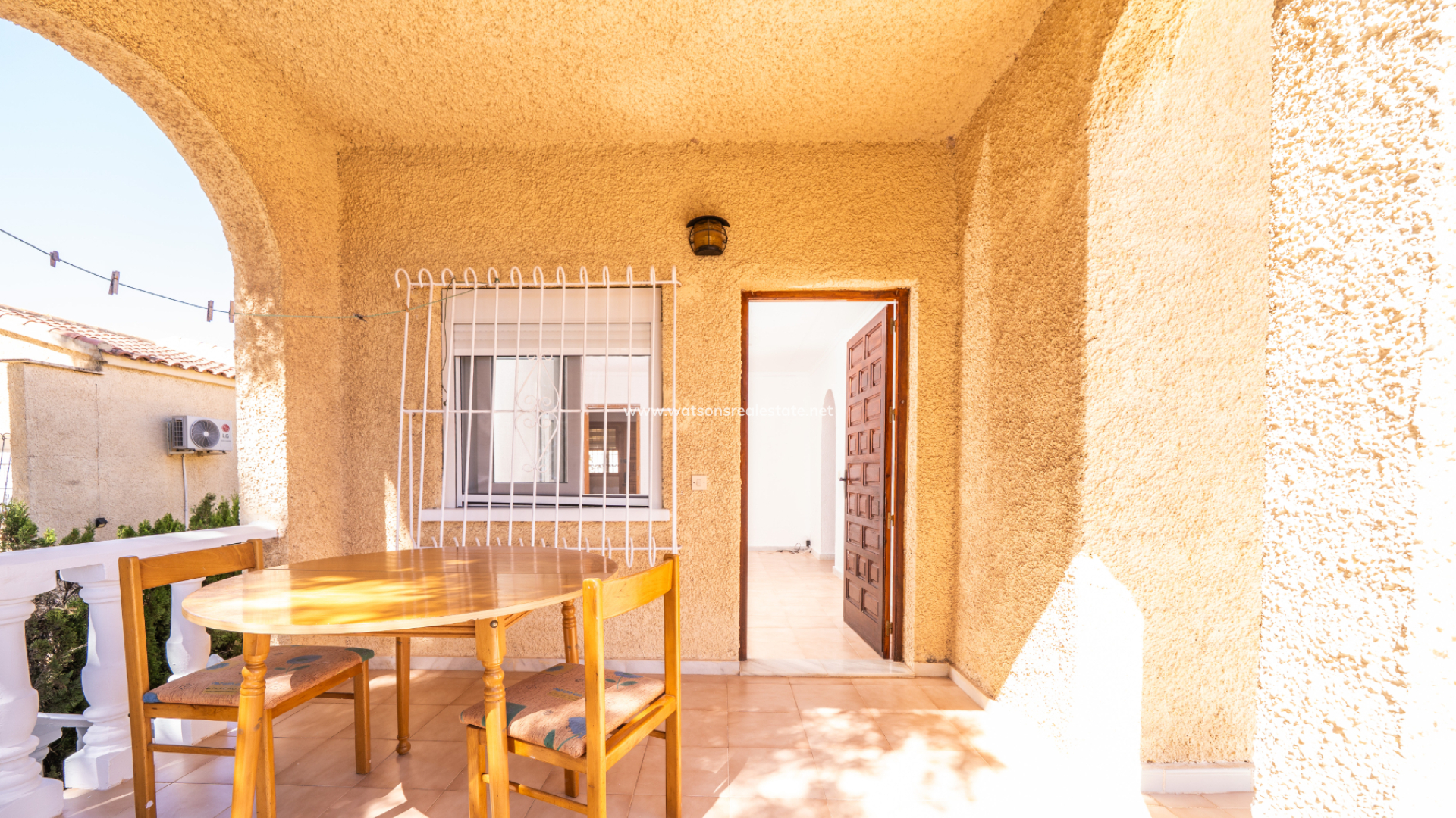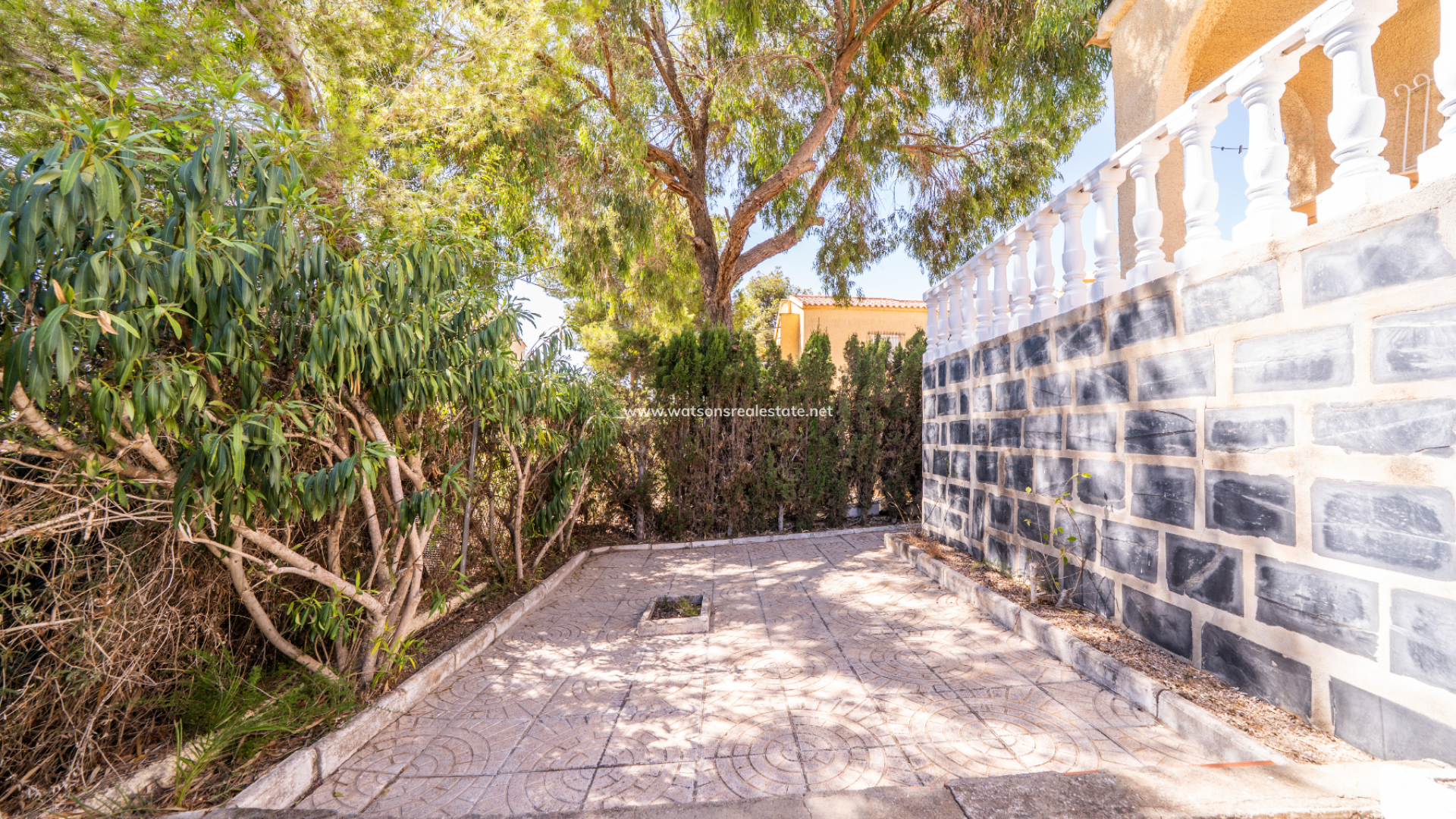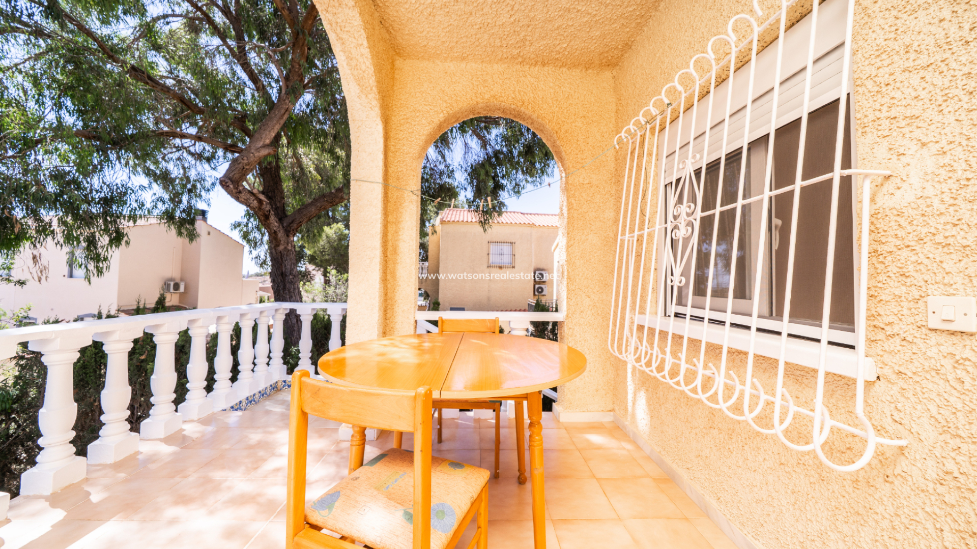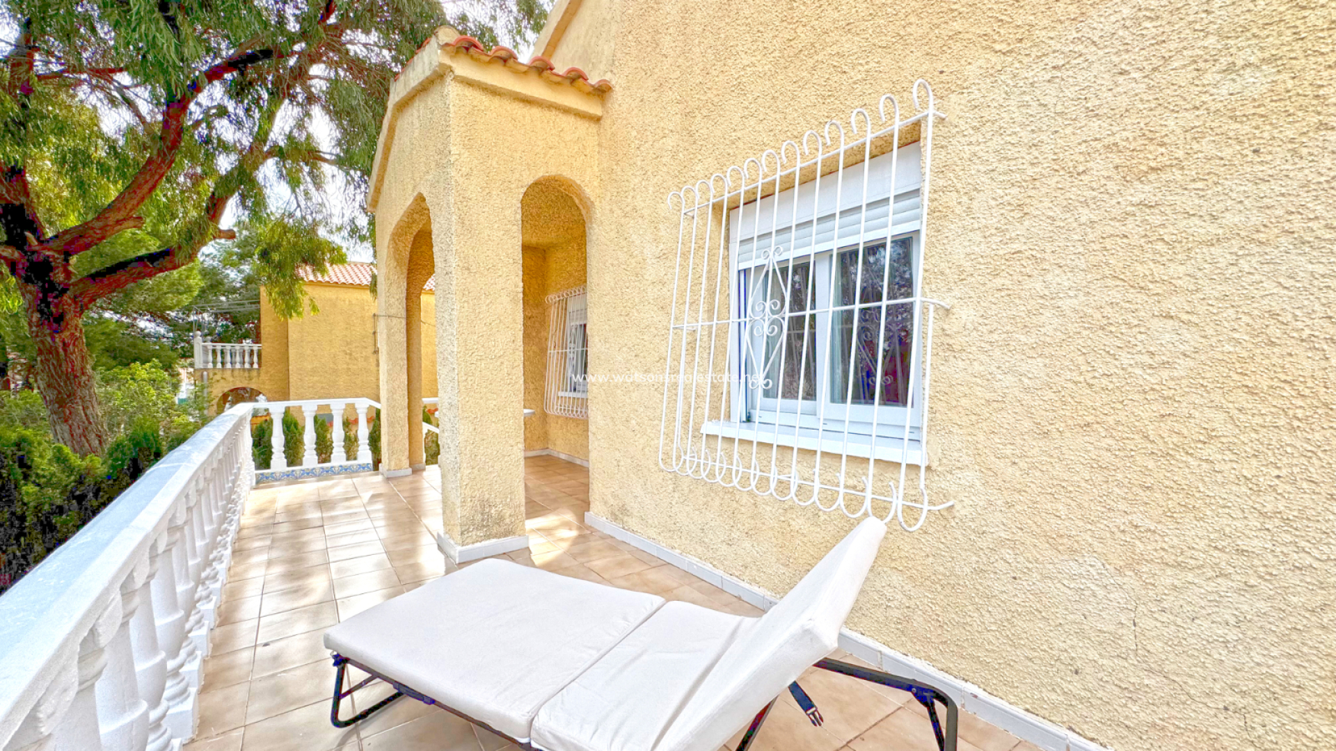 De woning profiteert van een verhoogd achterterras en een overdekte veranda met balustrades. Dit gedeelte biedt niet alleen een heerlijke plek om te zitten en te ontspannen, maar ook praktische bergruimte eronder. Vanaf het terras geniet u van uitzicht richting Guardamar del Segura.