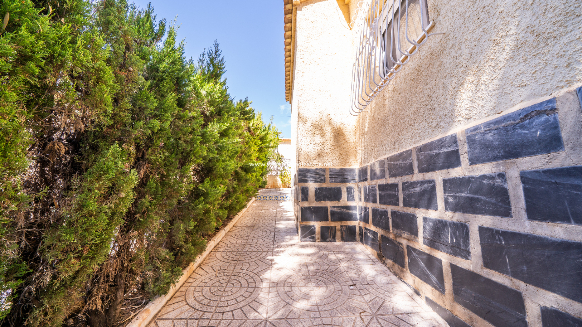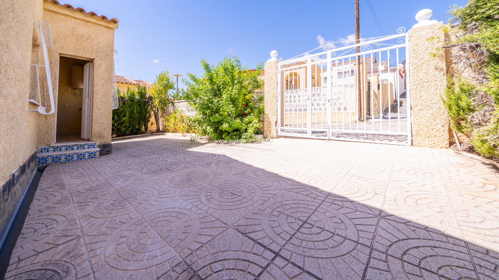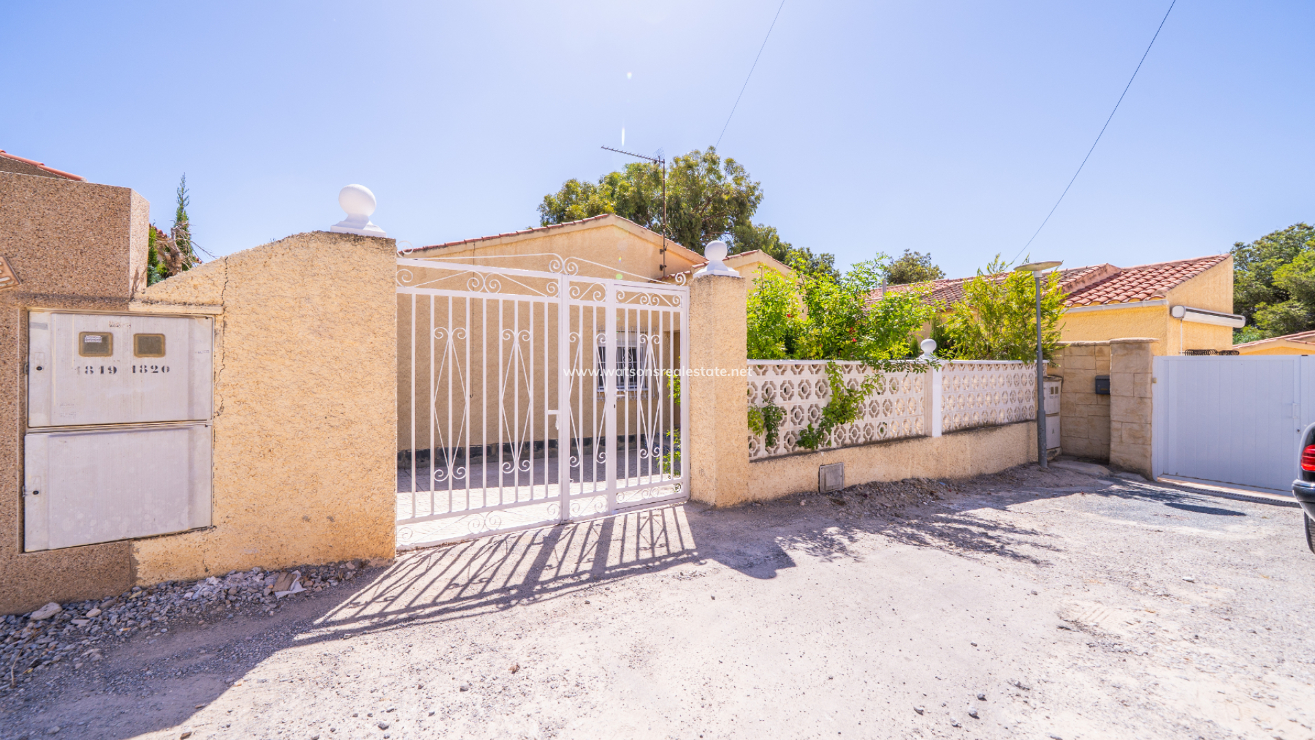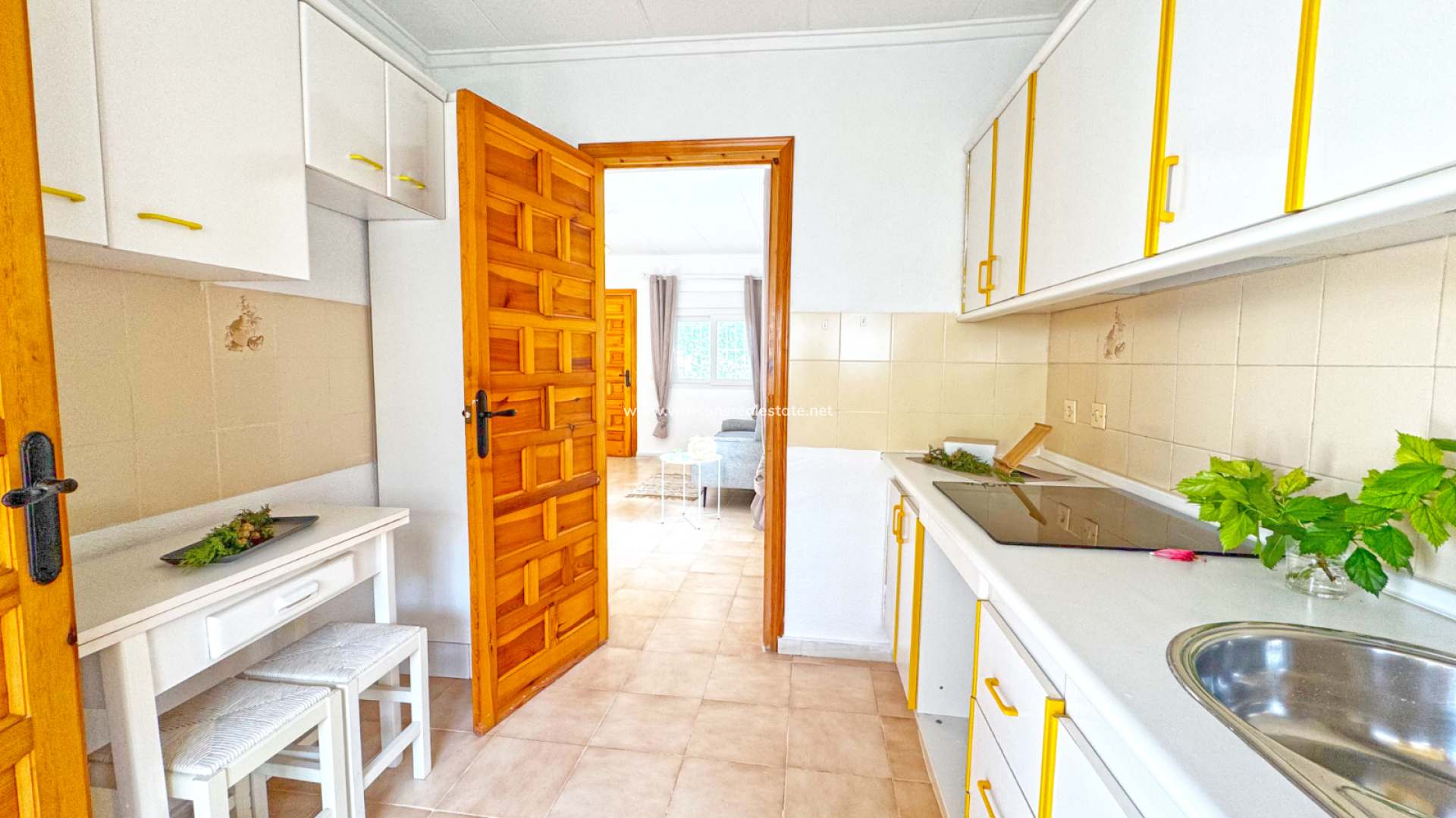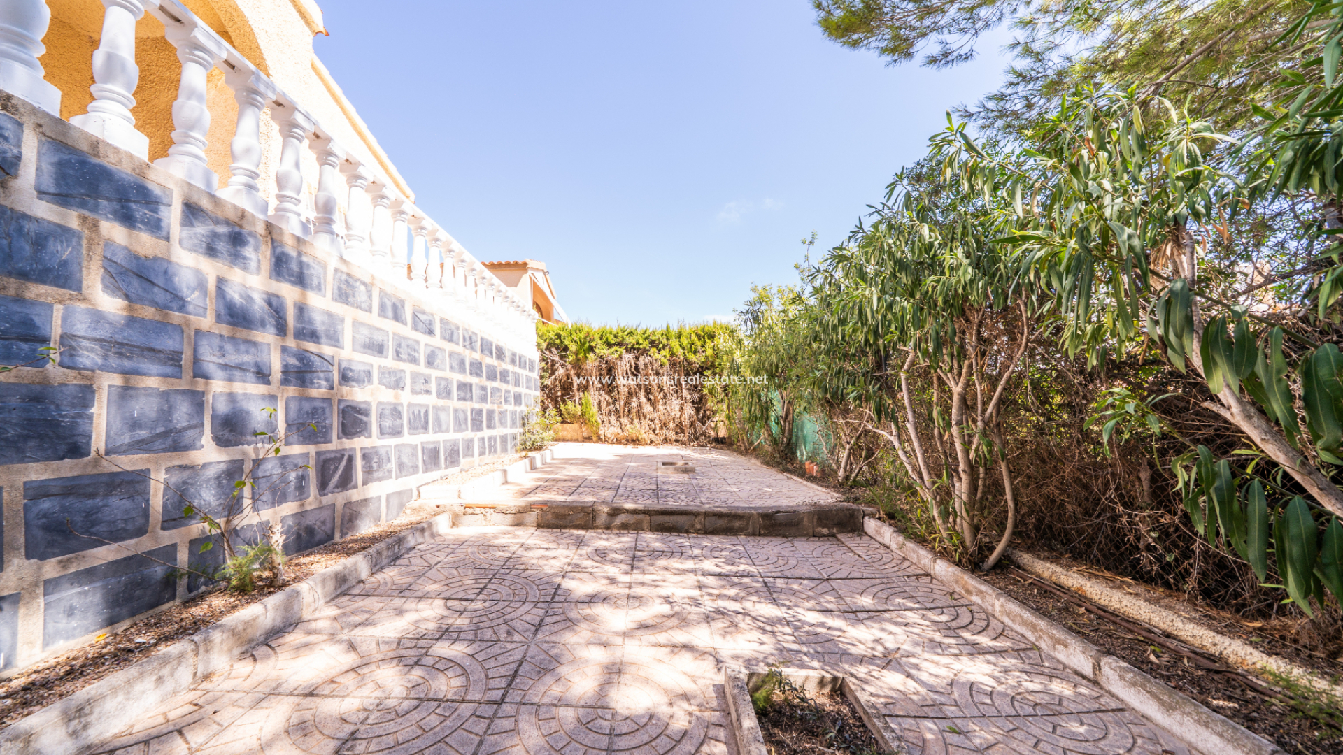 De woning profiteert van een verhoogd achterterras en een overdekte veranda met balustrades. Dit gedeelte biedt niet alleen een heerlijke plek om te zitten en te ontspannen, maar ook praktische bergruimte eronder. Vanaf het terras geniet u van uitzicht richting Guardamar del Segura.