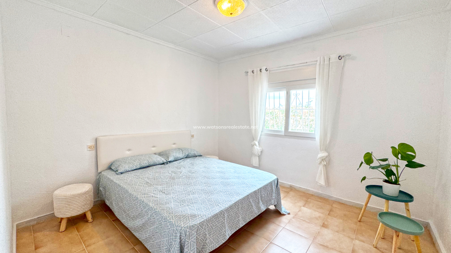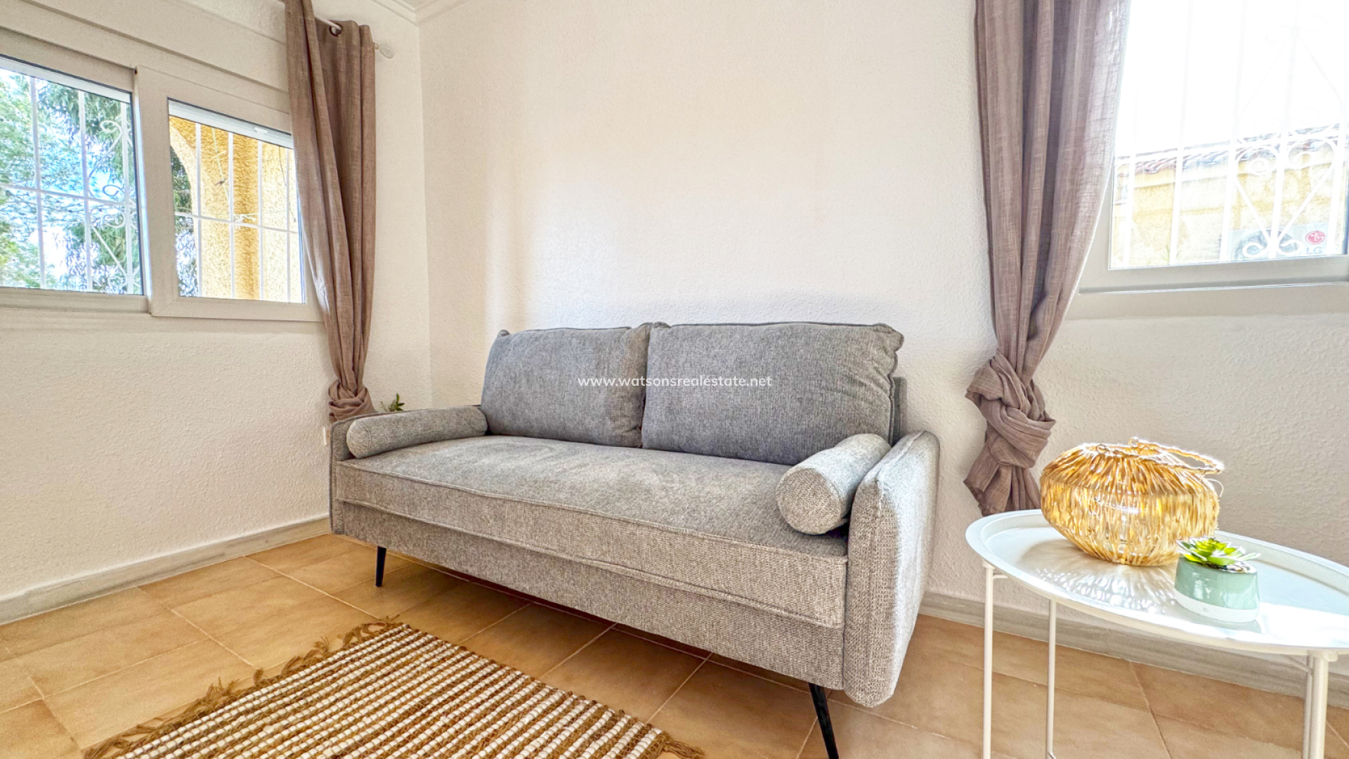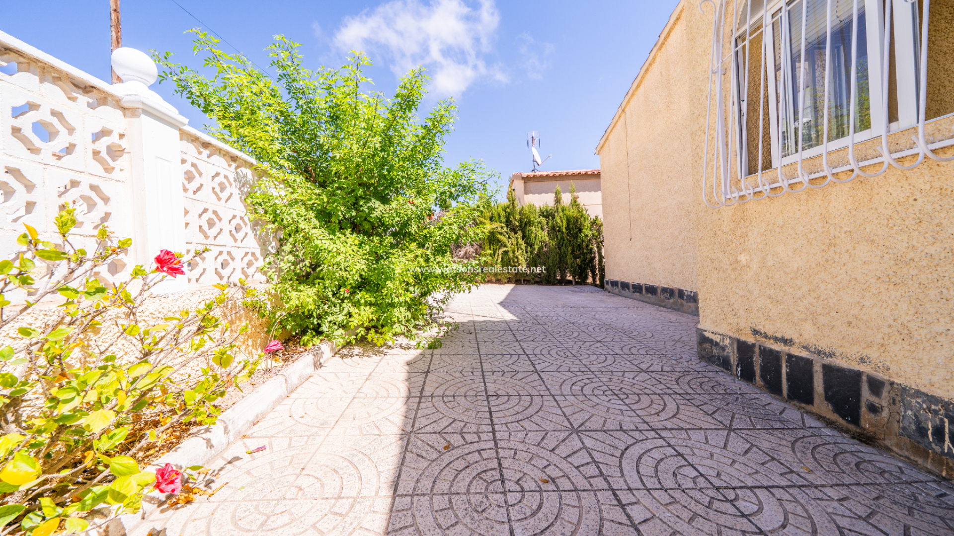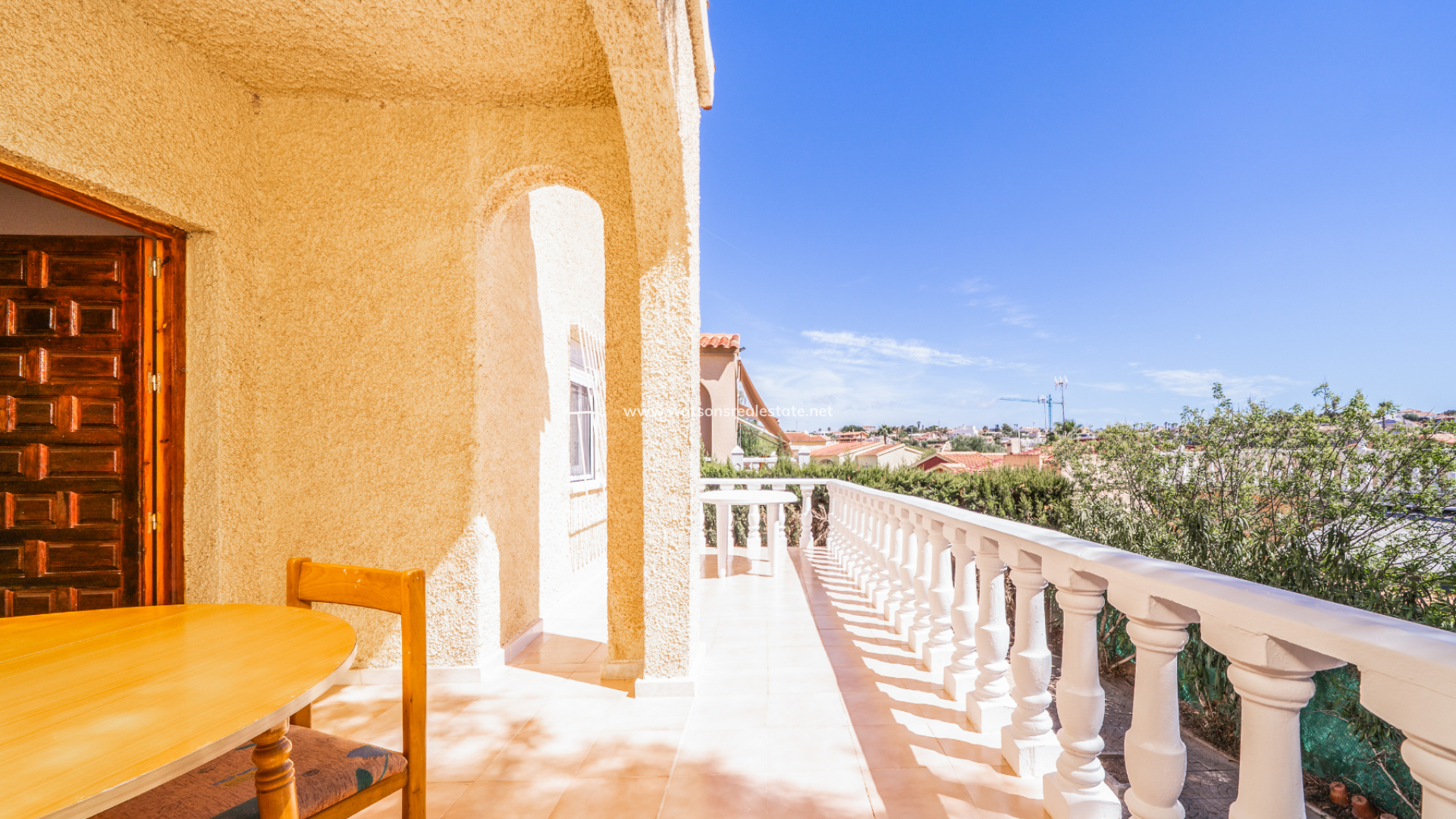 De woning profiteert van een verhoogd achterterras en een overdekte veranda met balustrades. Dit gedeelte biedt niet alleen een heerlijke plek om te zitten en te ontspannen, maar ook praktische bergruimte eronder. Vanaf het terras geniet u van uitzicht richting Guardamar del Segura.