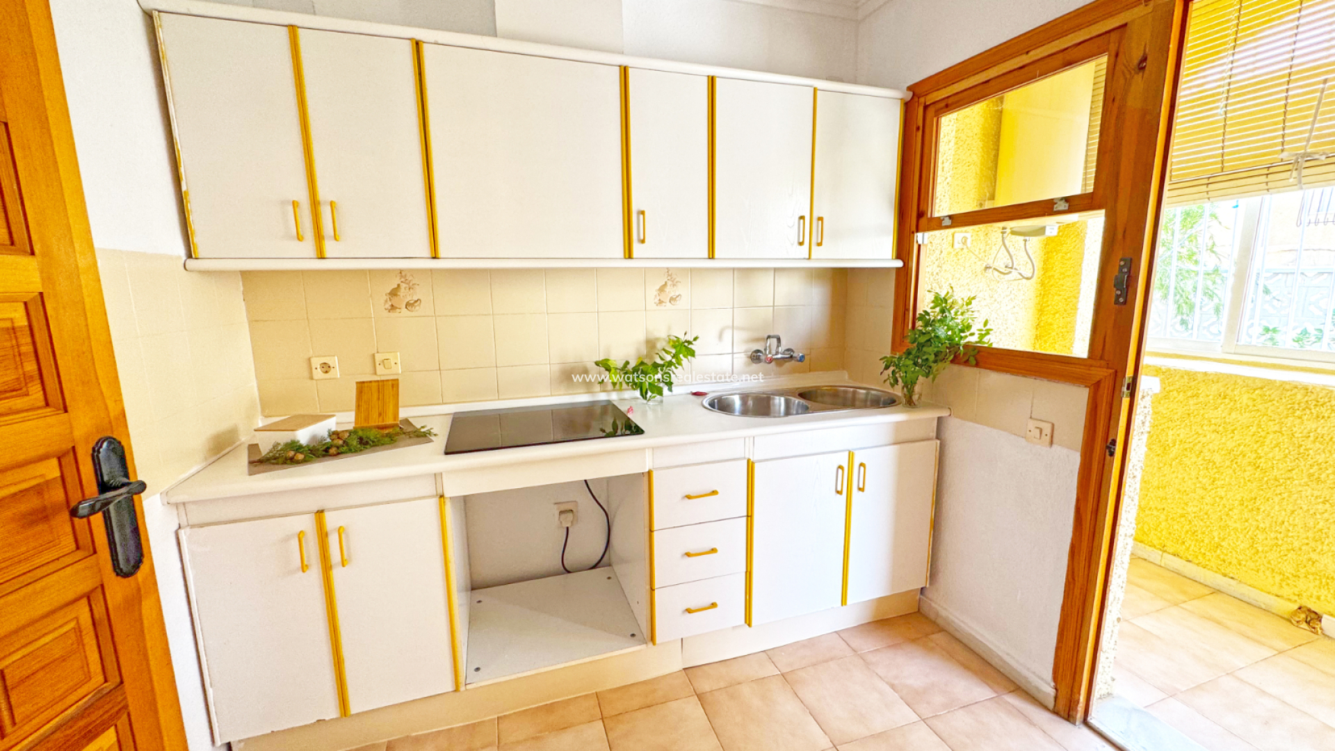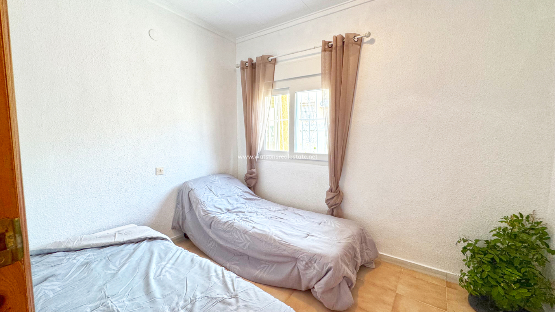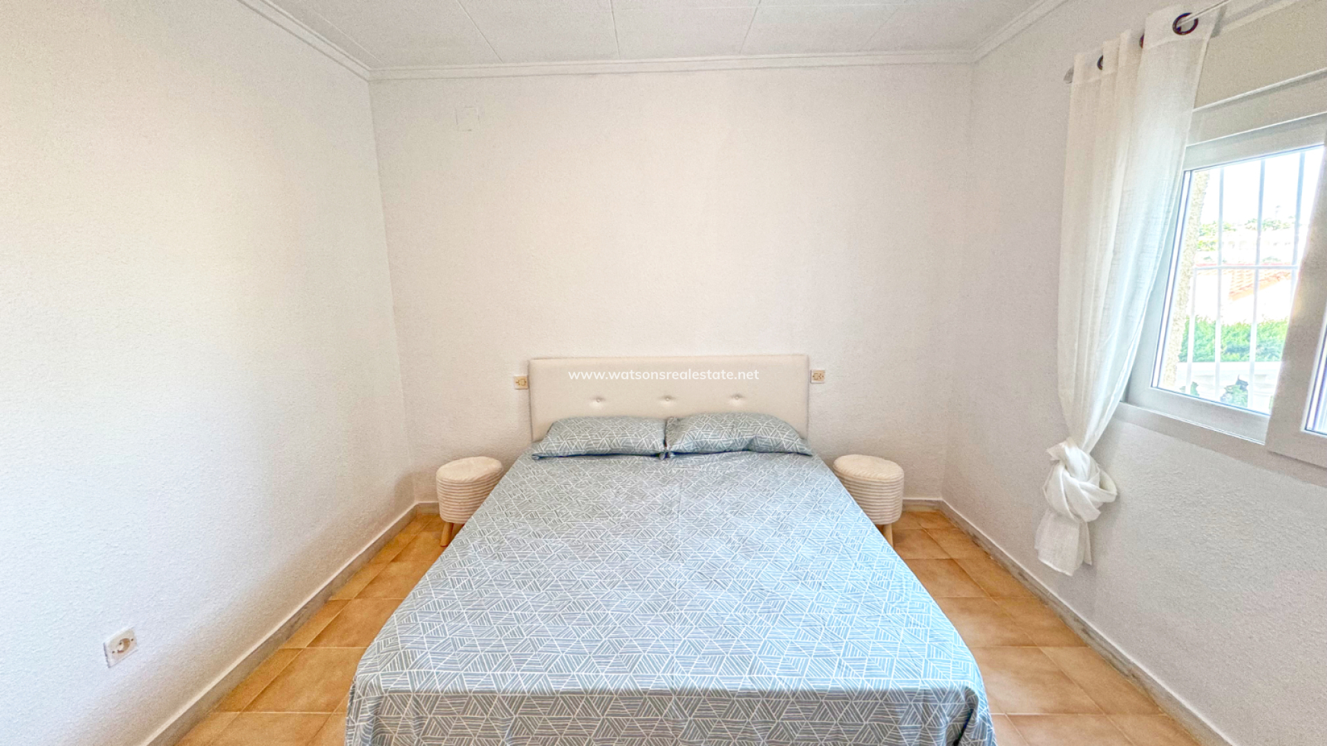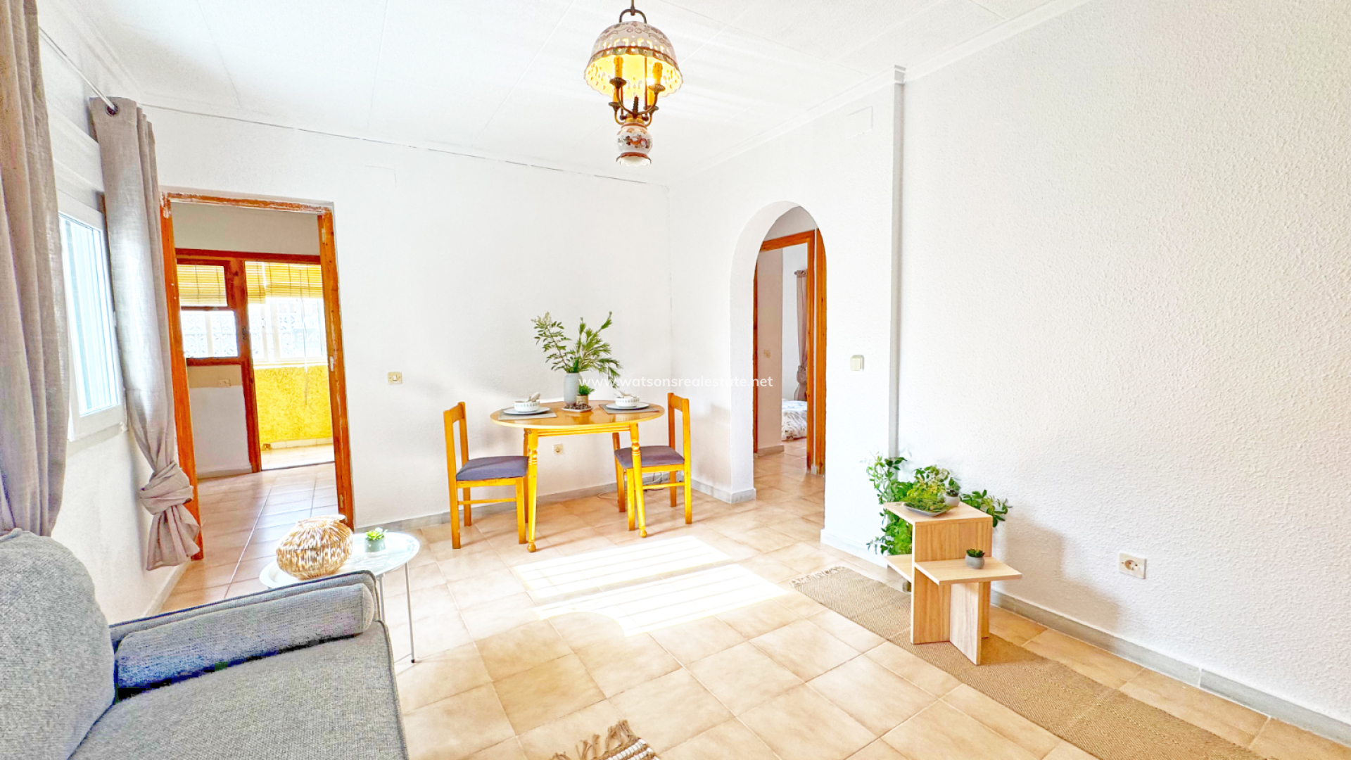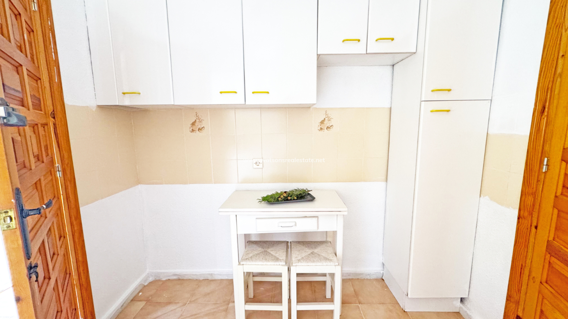 De woning profiteert van een verhoogd achterterras en een overdekte veranda met balustrades. Dit gedeelte biedt niet alleen een heerlijke plek om te zitten en te ontspannen, maar ook praktische bergruimte eronder. Vanaf het terras geniet u van uitzicht richting Guardamar del Segura.