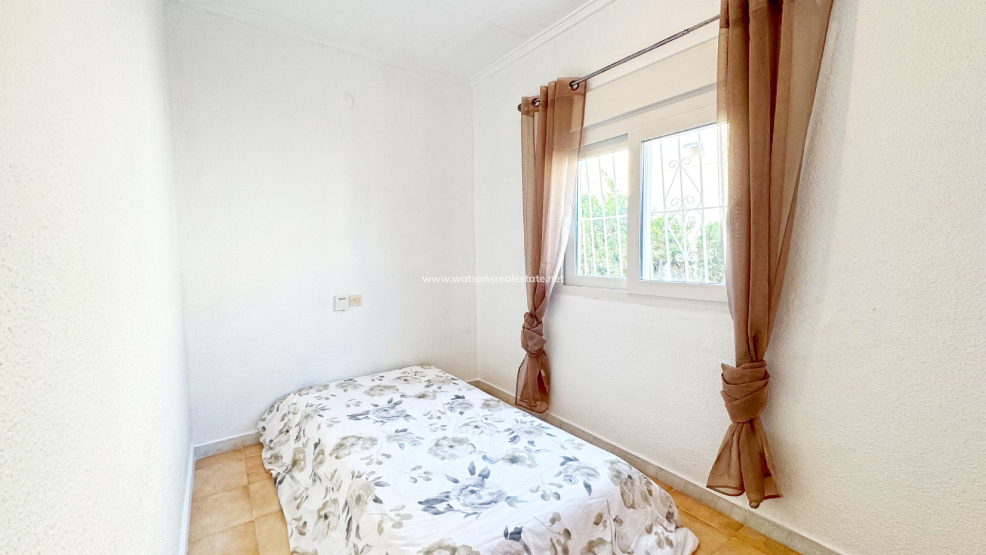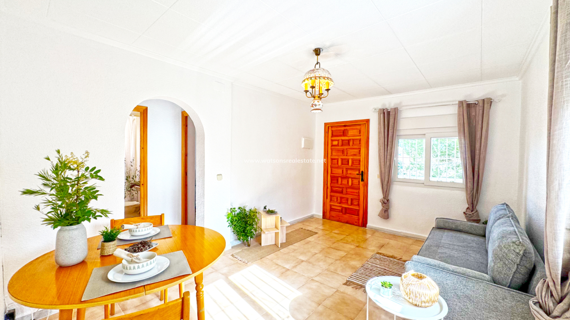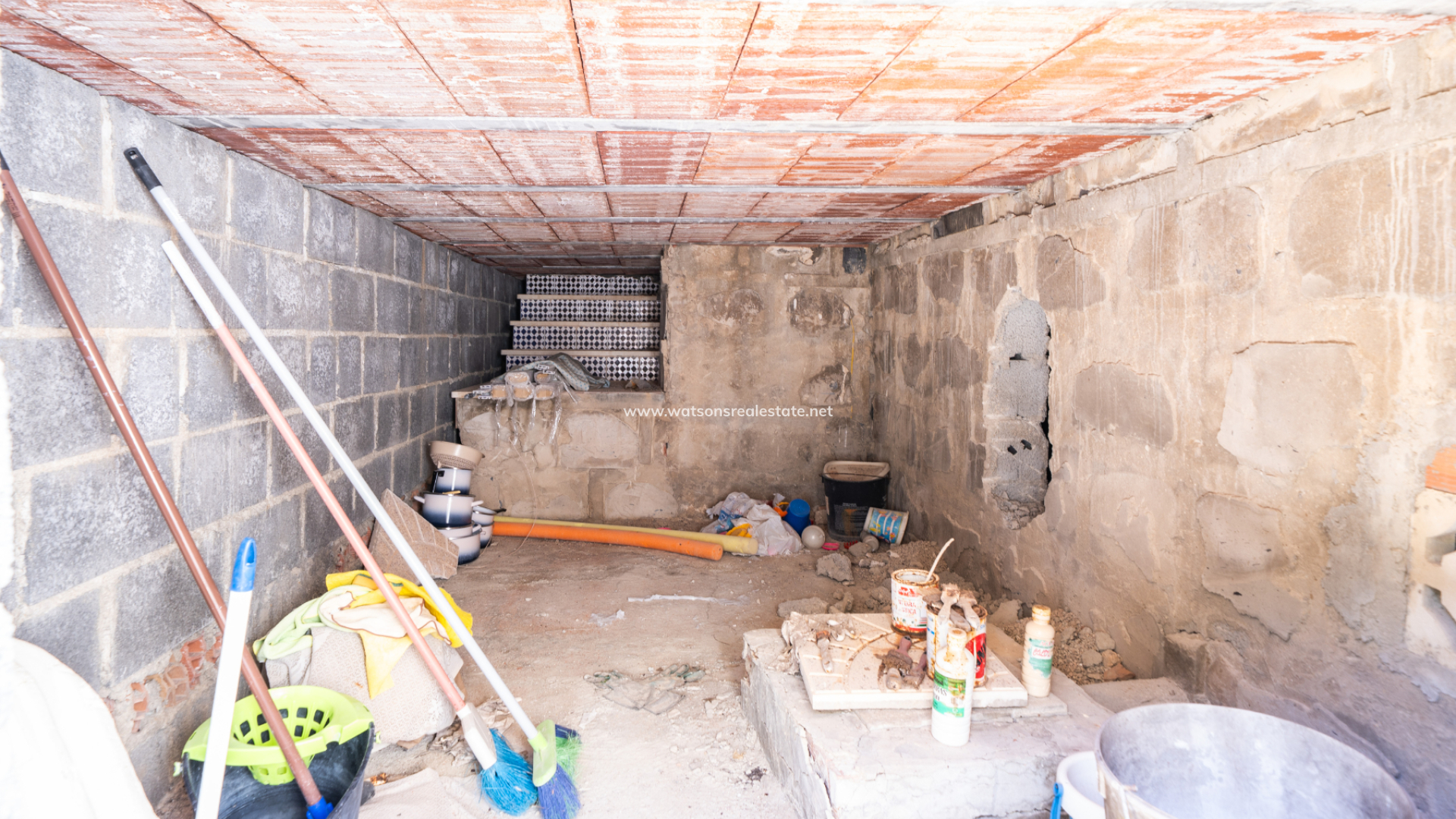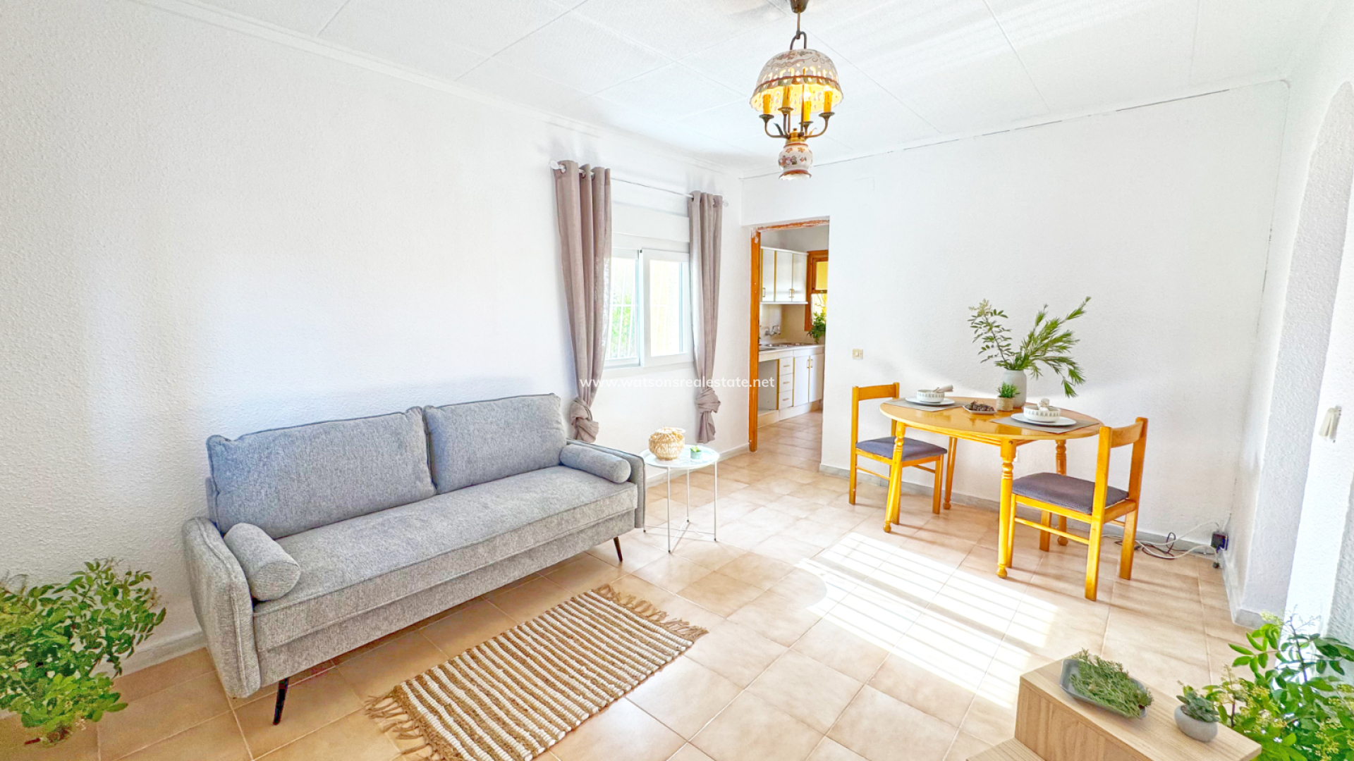 De woning profiteert van een verhoogd achterterras en een overdekte veranda met balustrades. Dit gedeelte biedt niet alleen een heerlijke plek om te zitten en te ontspannen, maar ook praktische bergruimte eronder. Vanaf het terras geniet u van uitzicht richting Guardamar del Segura.