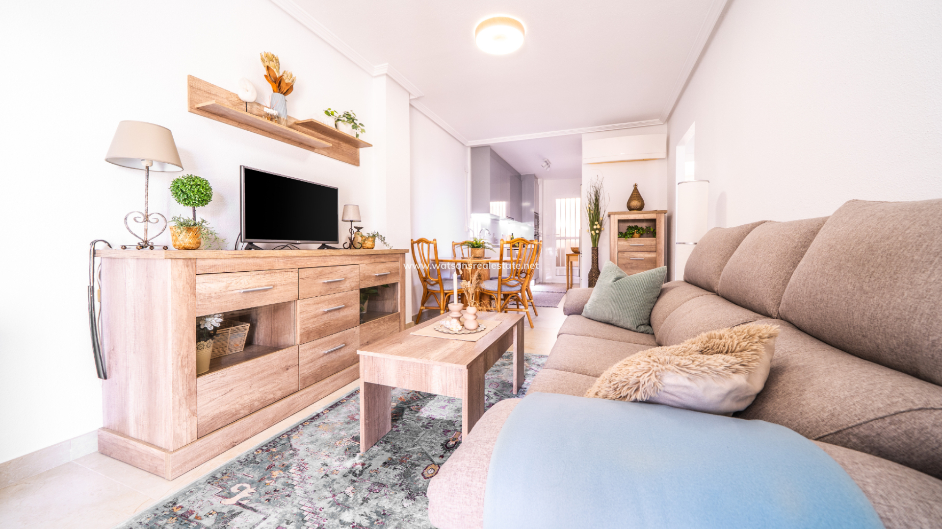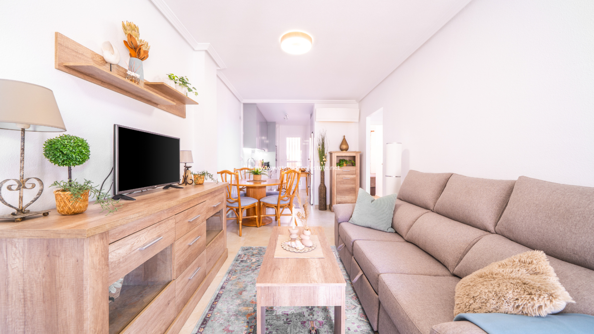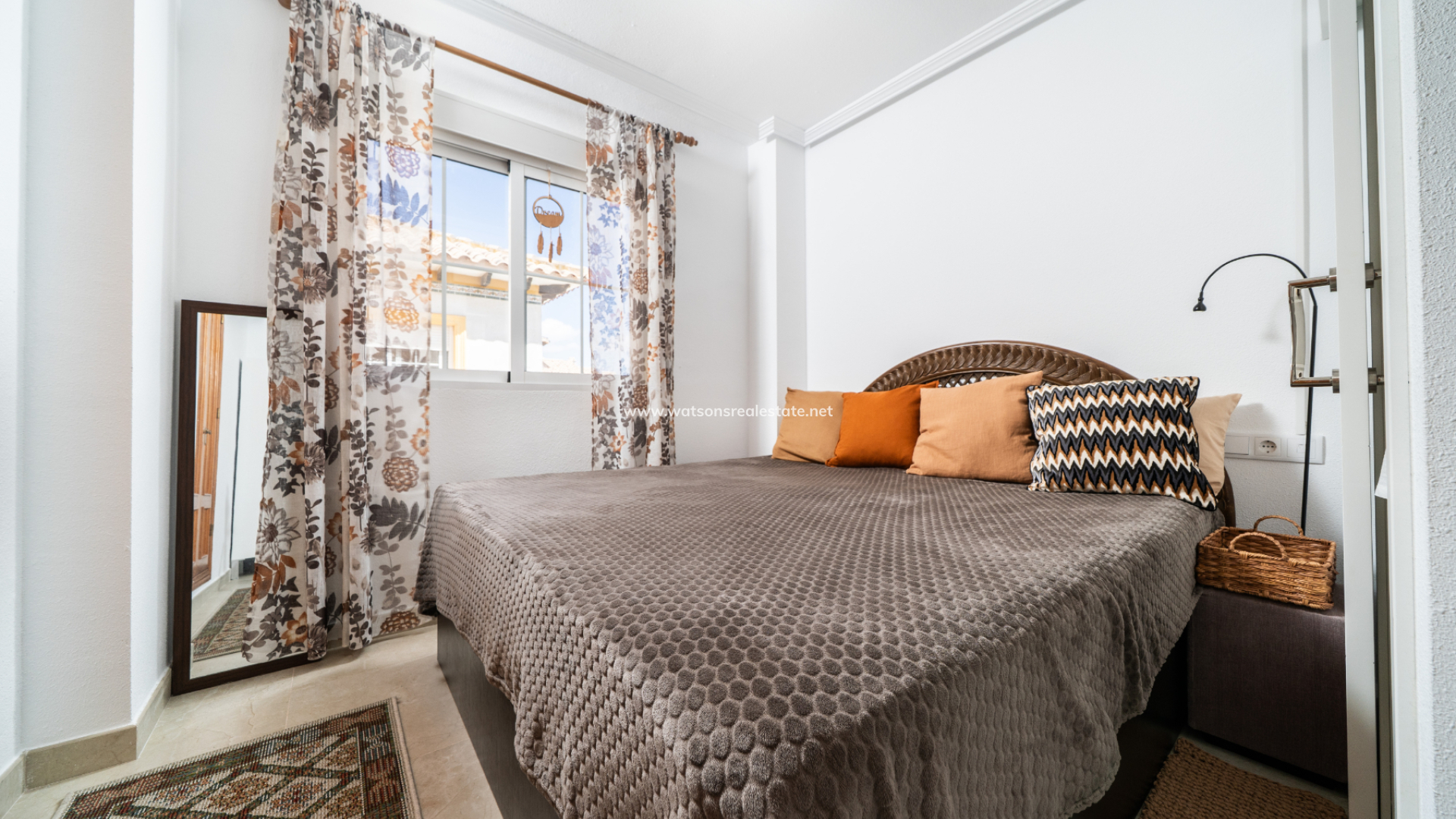 Binnenin loopt de lichte, uitnodigende woonkamer met airconditioning en een aparte eetruimte over in een open, moderne, volledig elektrische keuken met een toegangsdeur tot een aparte bijkeuken die ruimte biedt voor de boiler en de wasmachine. De hoofdslaapkamer beschikt over ingebouwde kasten en een eigen badkamer met douche, wastafel en wc. De tweede slaapkamer is een tweepersoonskamer en er is een aparte badkamer met douche, wastafel en wc.