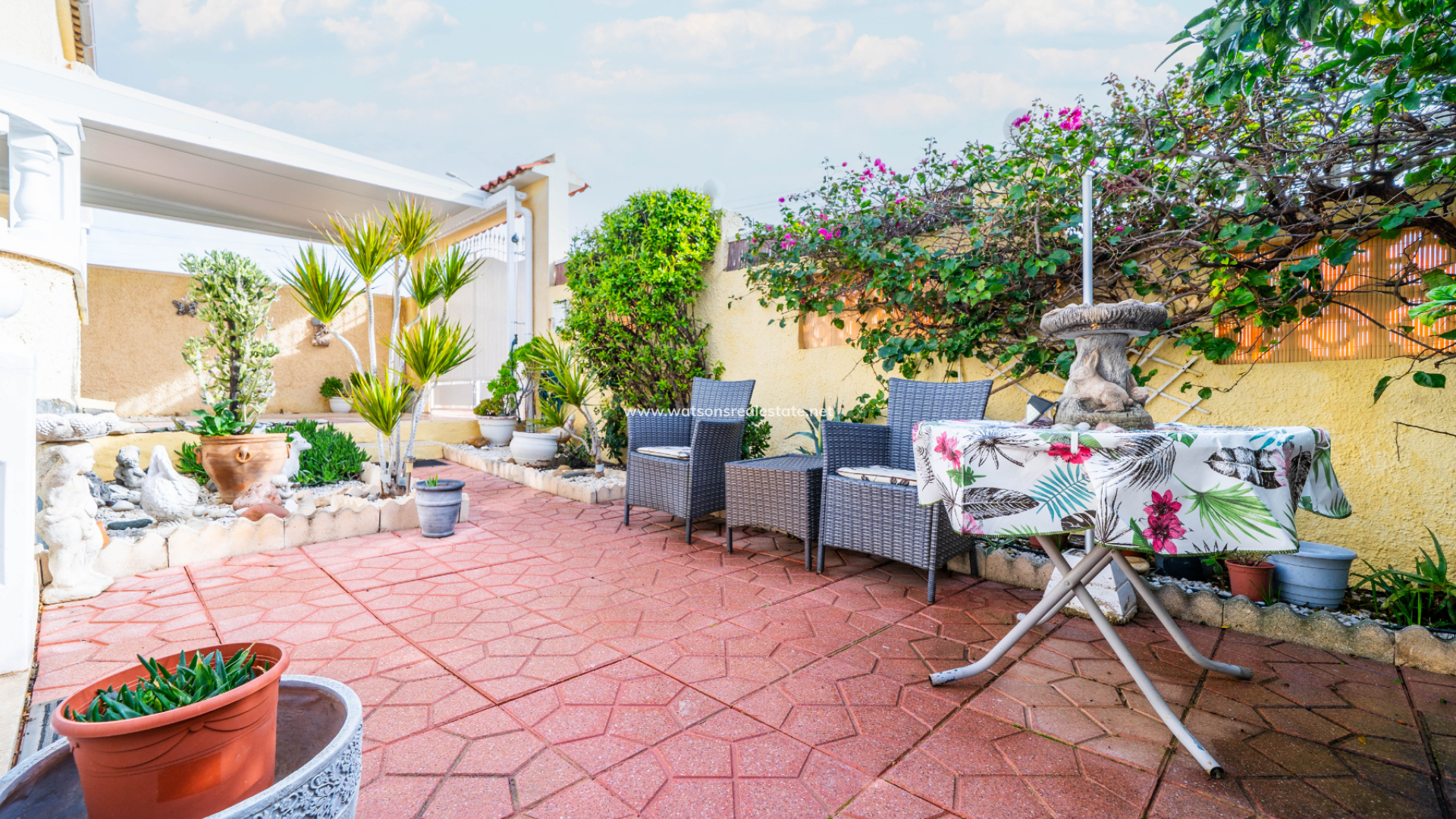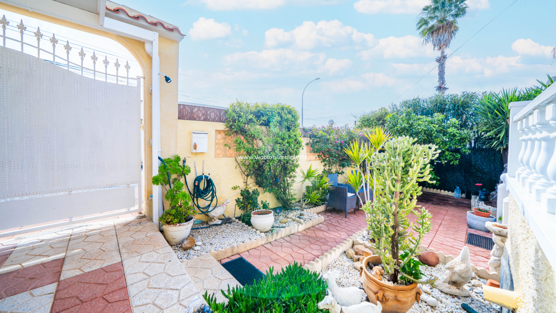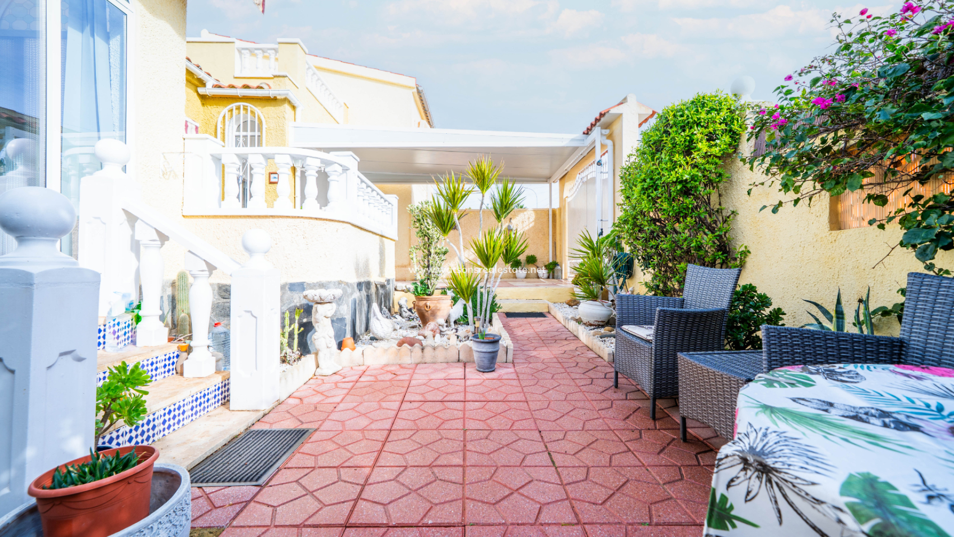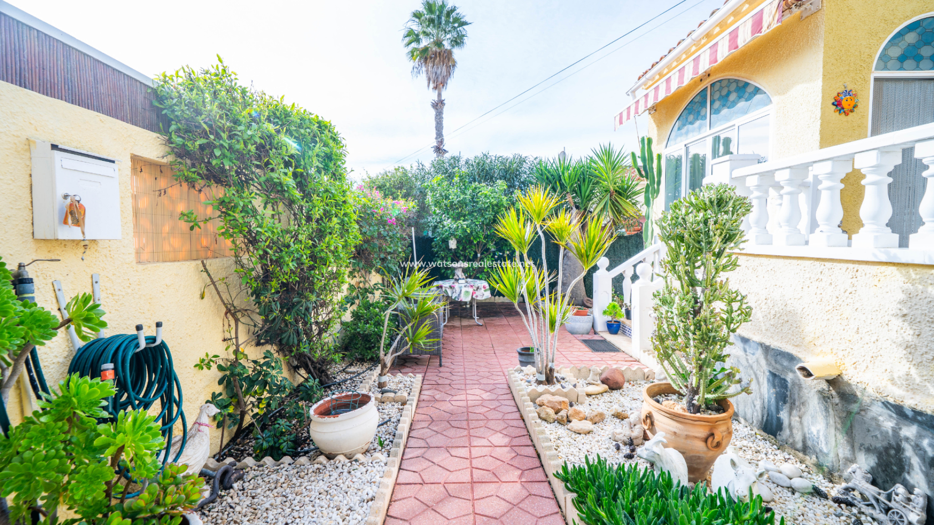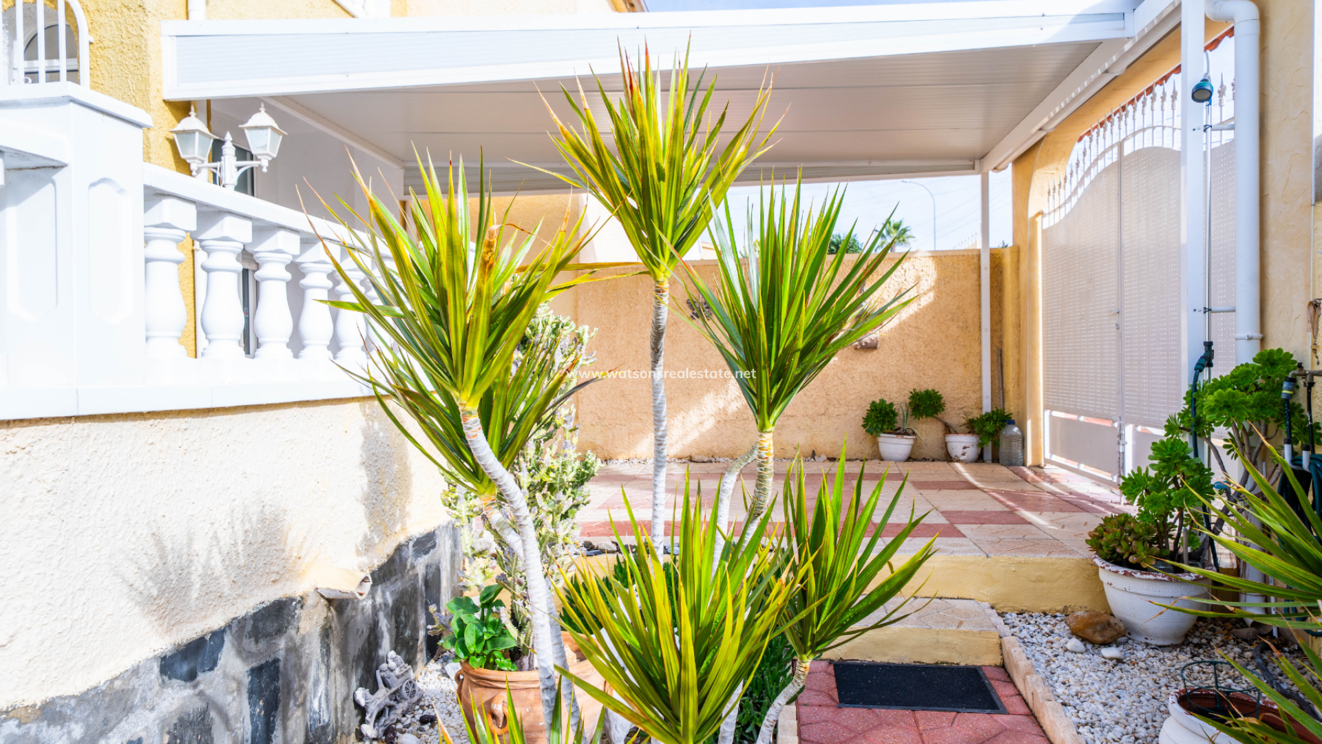 De onderhoudsvriendelijke tuinen aan de voorzijde bieden parkeergelegenheid op eigen terrein met een carport. De buitenruimte aan de voorzijde is afgewerkt met hoge muren voor privacy, zonneschermen, een berging en een handige ➡️ onderbouw bergruimte. Aan de achterzijde leiden trappen naar het solarium waar u kunt genieten van een prachtig uitzicht over het landschap.