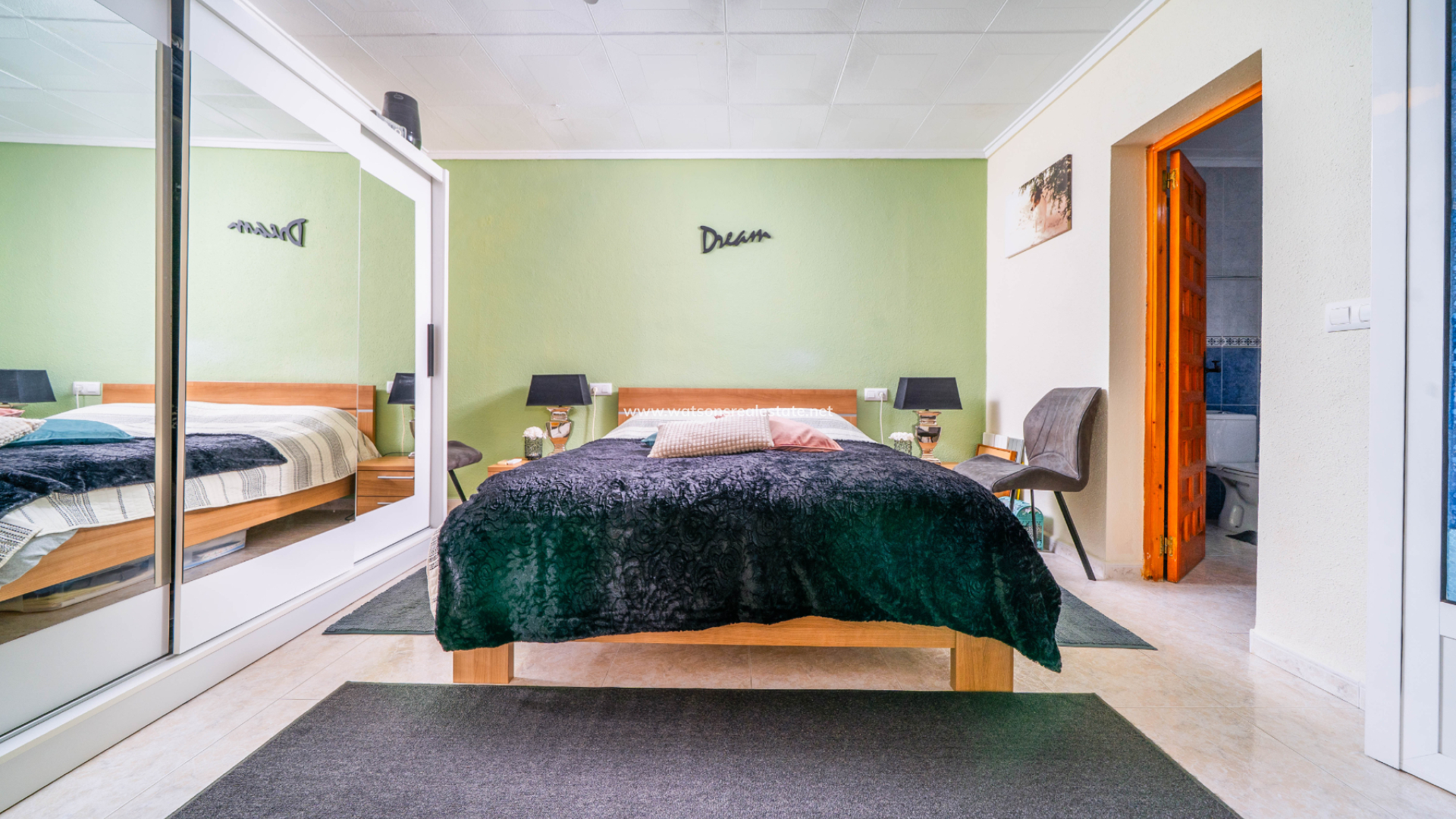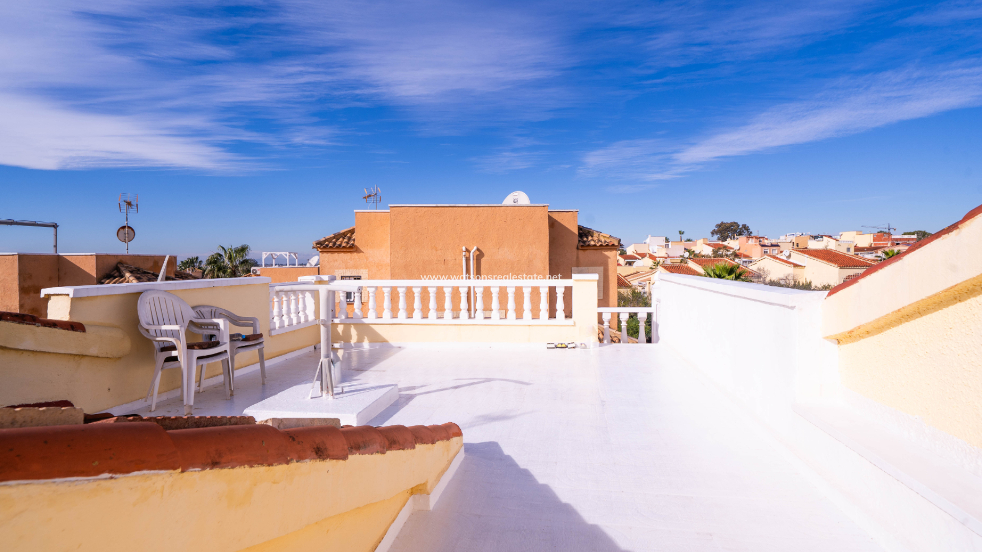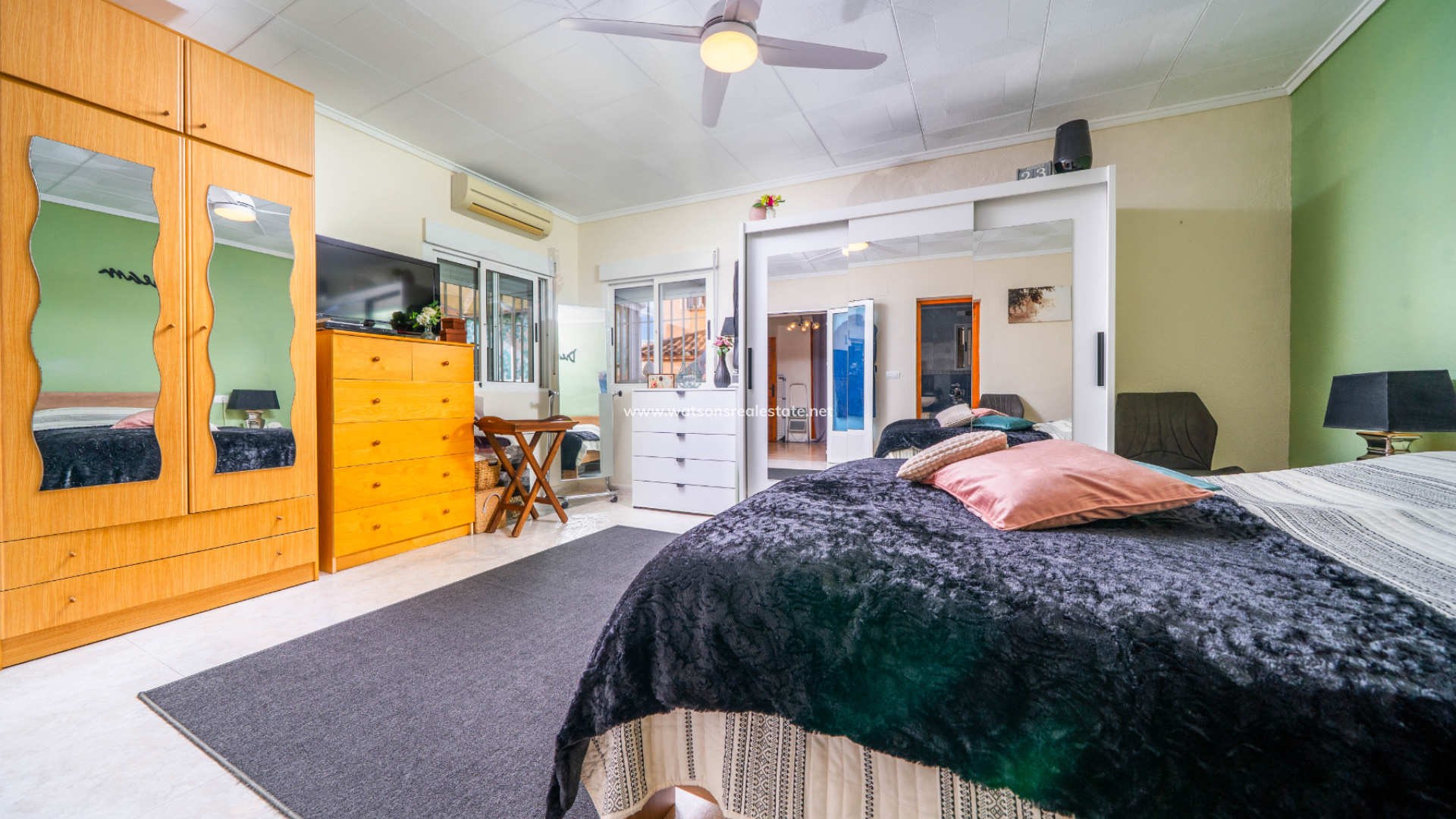 De villa beschikt ook over drie ruime tweepersoonsslaapkamers en twee badkamers. De hoofdslaapkamer is ruim en heeft een en-suite badkamer met een hoekdouche en bad. Er is een praktische opbergruimte tussen twee van de slaapkamers.