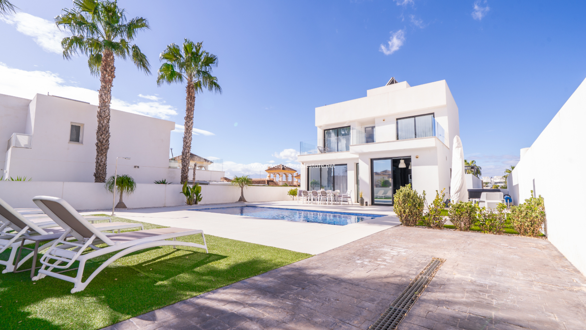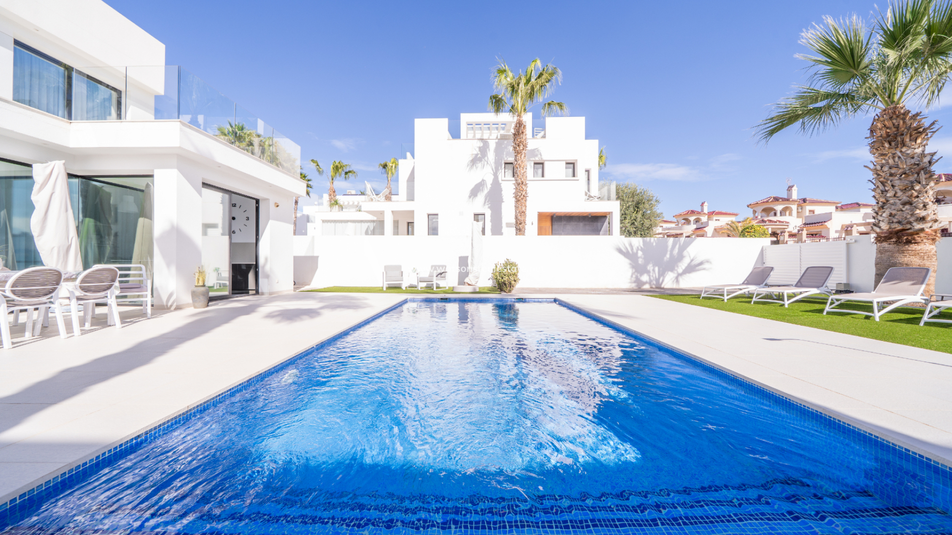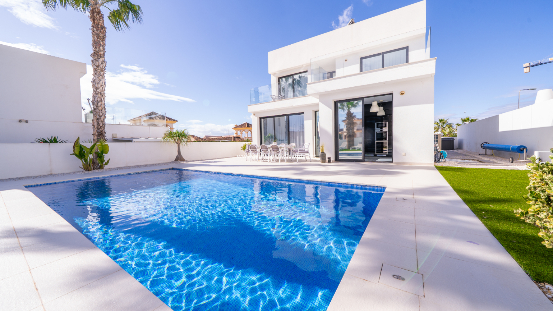 Introductie van deze indrukwekkende moderne vrijstaande luxe villa gelegen in Urb. La Marina, San Fulgencio, op slechts 5-10 minuten van lokale voorzieningen. ➡️ Gelegen op een perceel van 500m² met een mix van tegels, grind en kunstgras, biedt de woning 160m² aan lichte, moderne leefruimte met grote ramen en een oostelijke oriëntatie die optimaal profiteert van de ochtendzon.