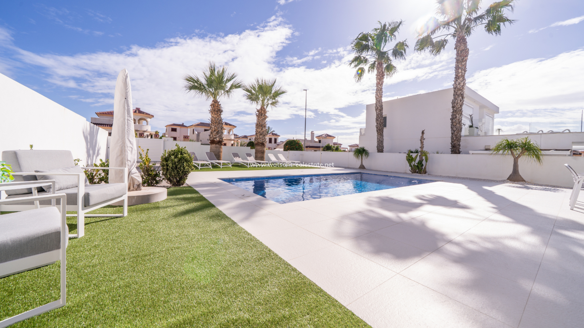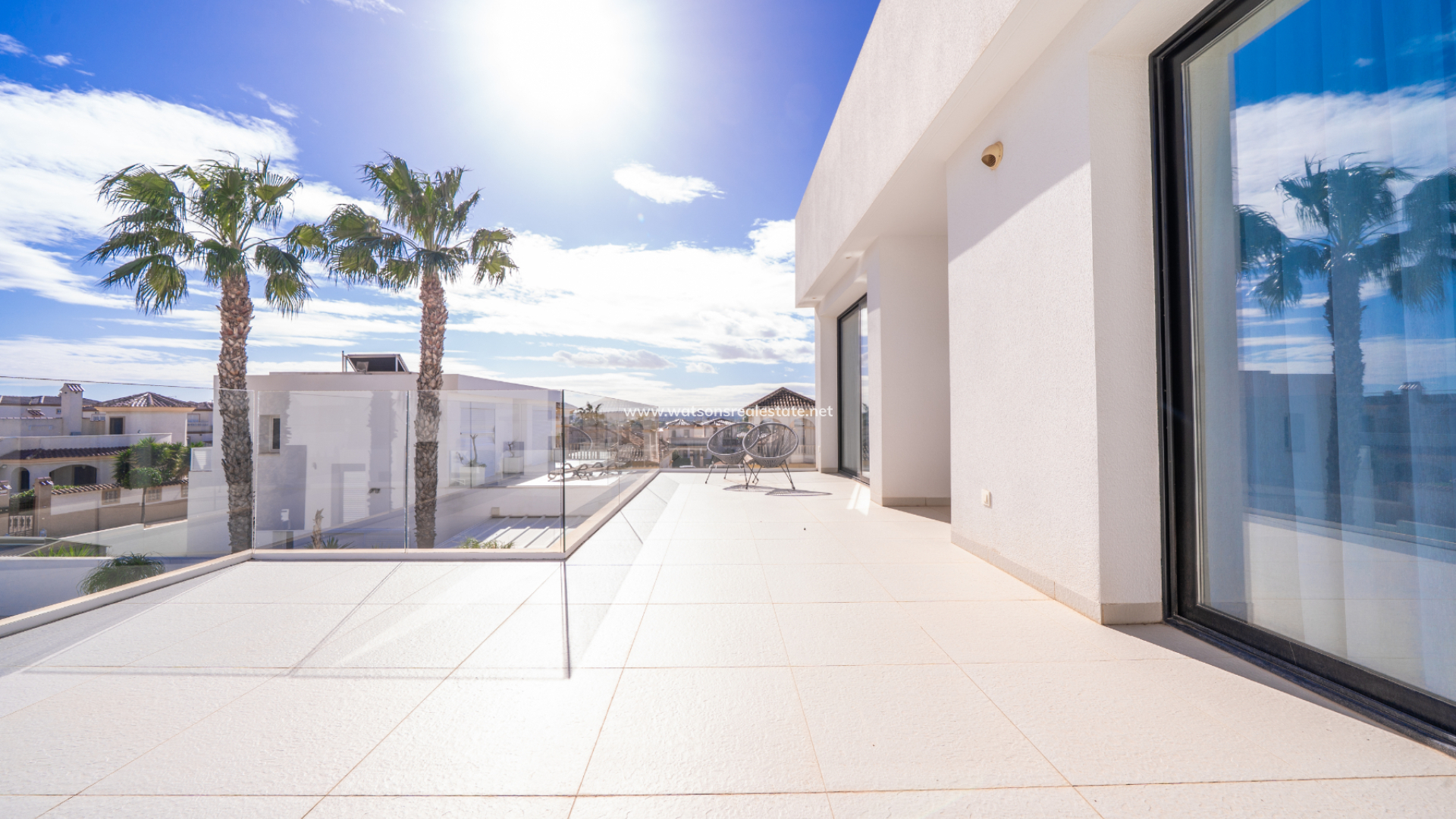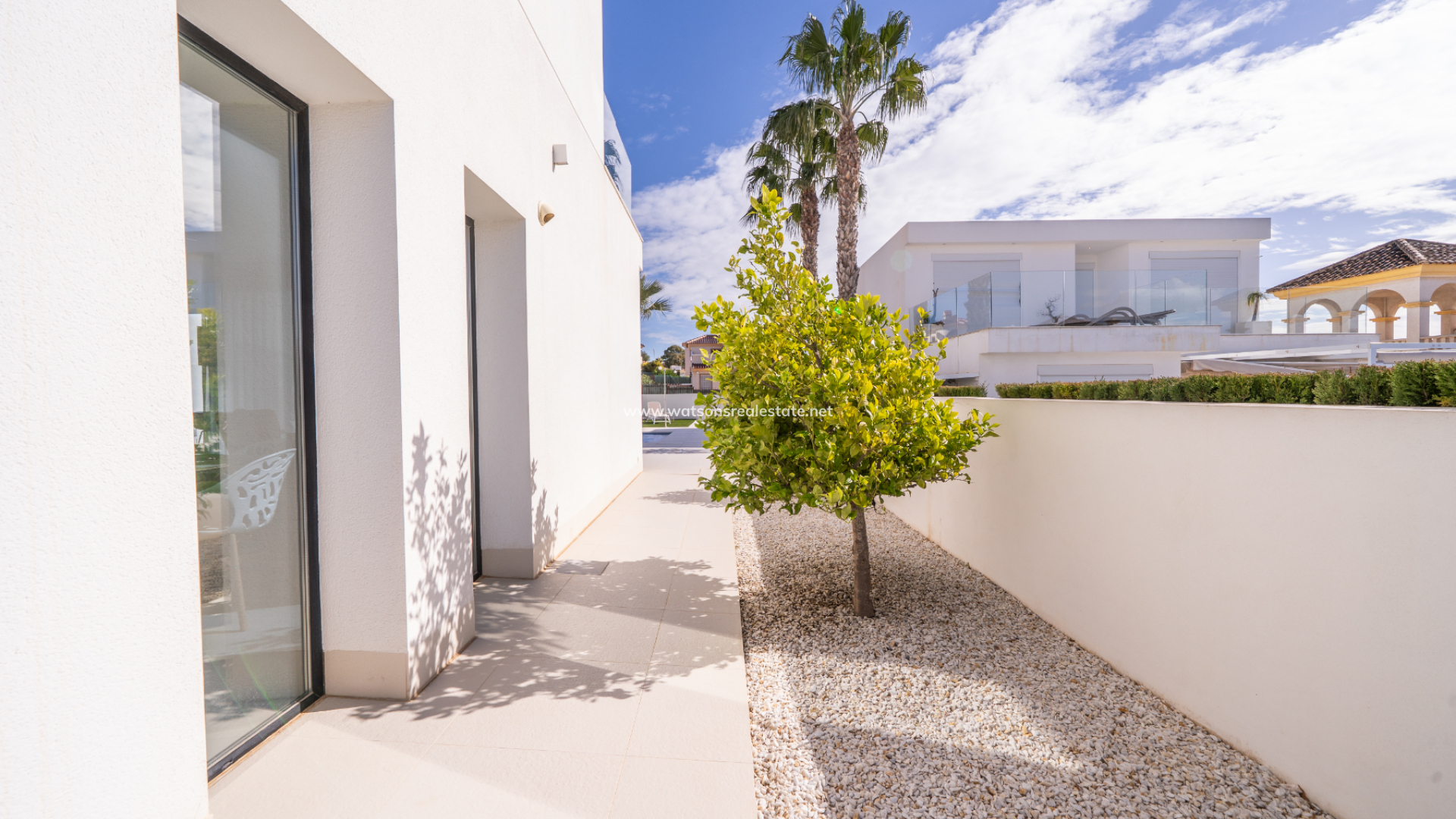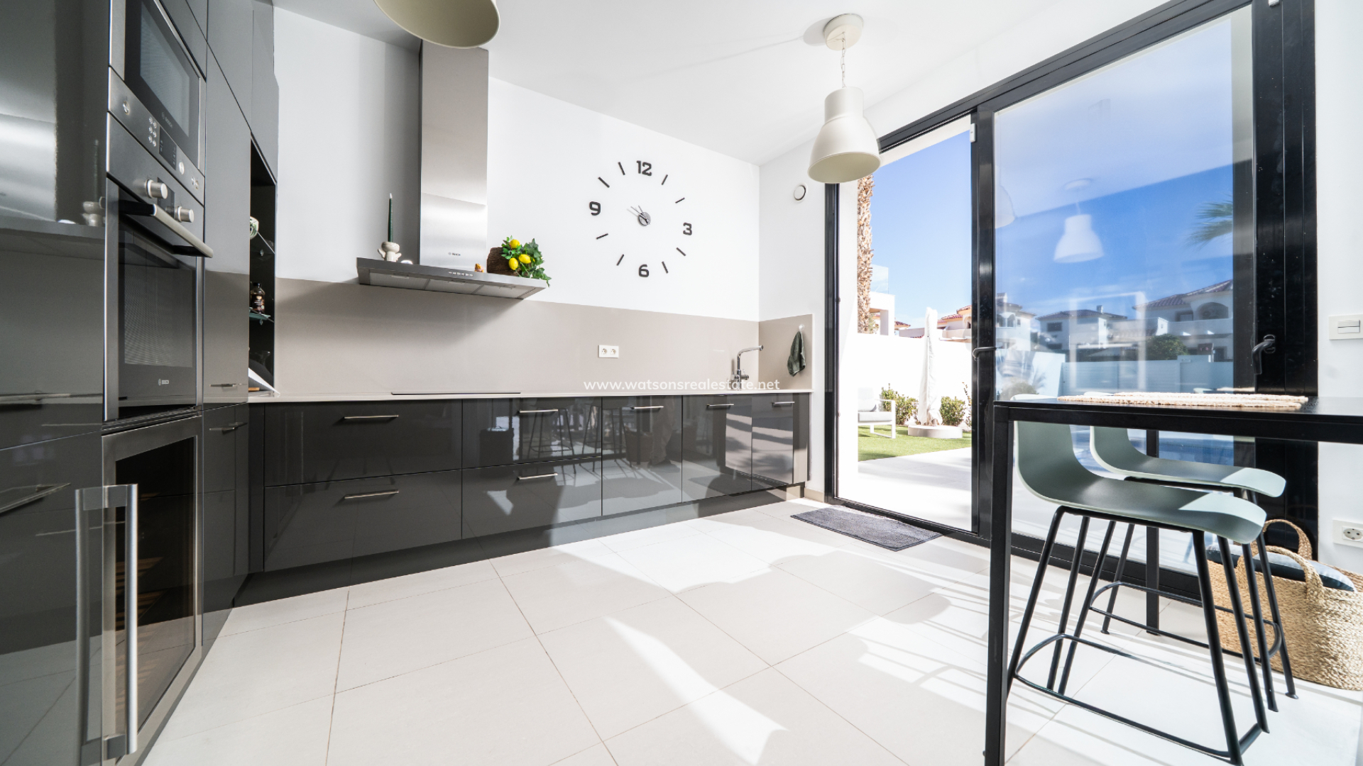 De villa beschikt over drie ruime slaapkamers en drie stijlvolle badkamers (waarvan 2 en-suite), allemaal afgewerkt volgens een hoge standaard met LED-spiegels, verhoogde toiletten en kamerbrede douches. De hoofdslaapkamer profiteert van een inloopkast en een van de en-suite badkamers. De open woon-, eet- en keukenruimte is volledig geïntegreerd en bevat een ontbijtbar, wat een praktische en sociale ruimte creëert, terwijl een aparte bijkeuken dagelijks gemak toevoegt. Op de bovenverdieping wordt de overloop gebruikt als studeer- of kantoorruimte, met toegang tot een zonneterras, dat ook toegankelijk is vanuit beide slaapkamers boven via openslaande deuren.
