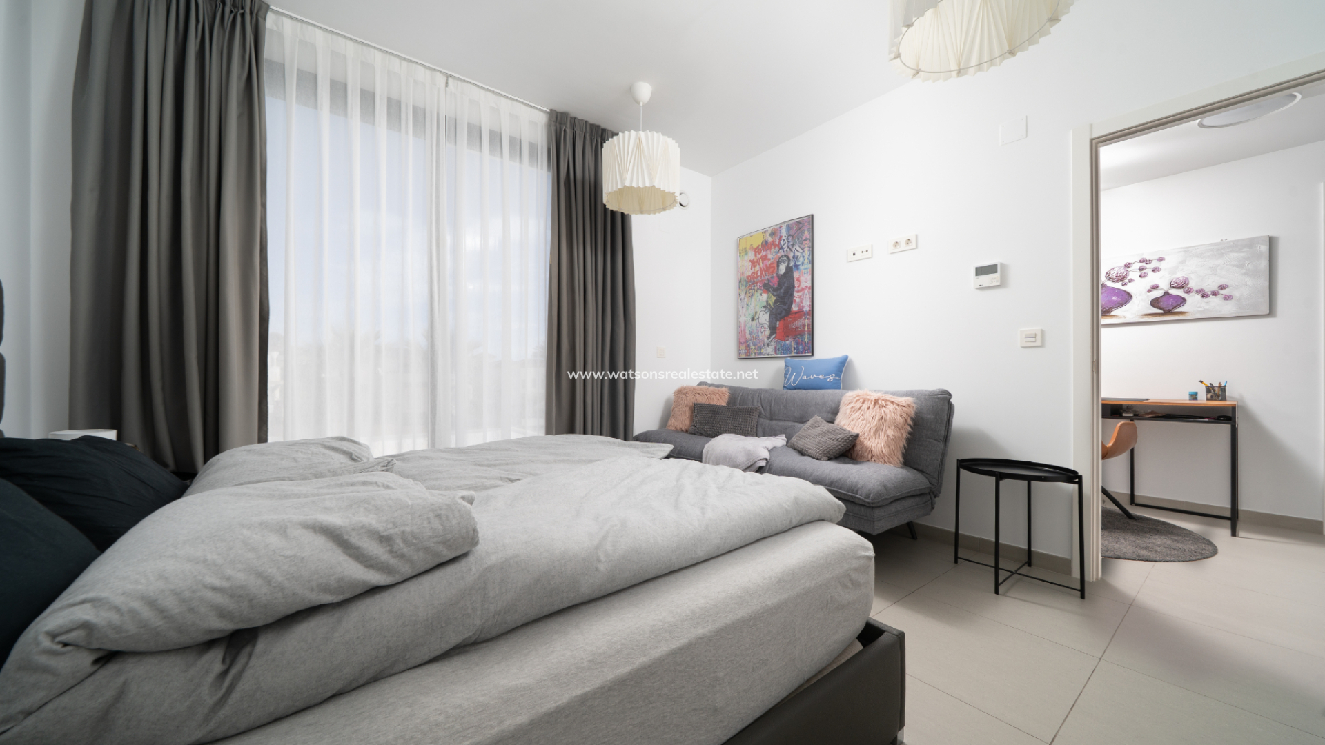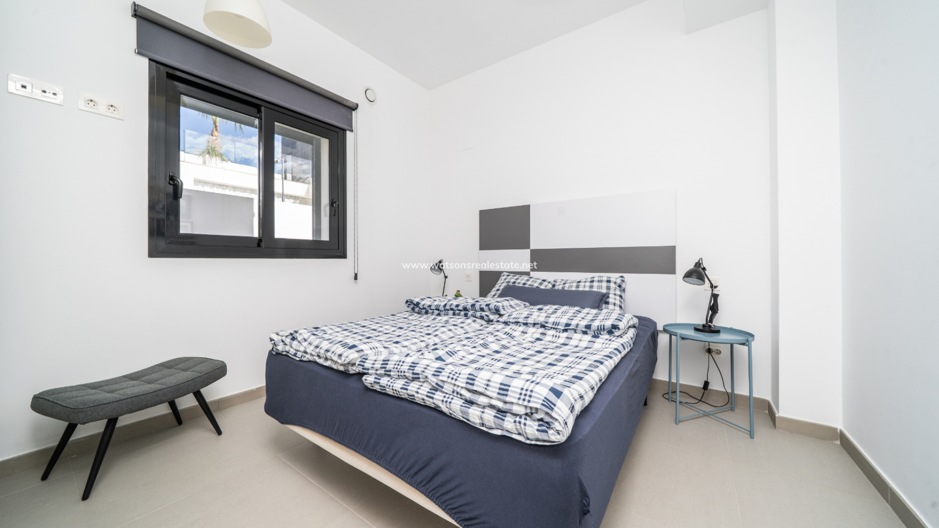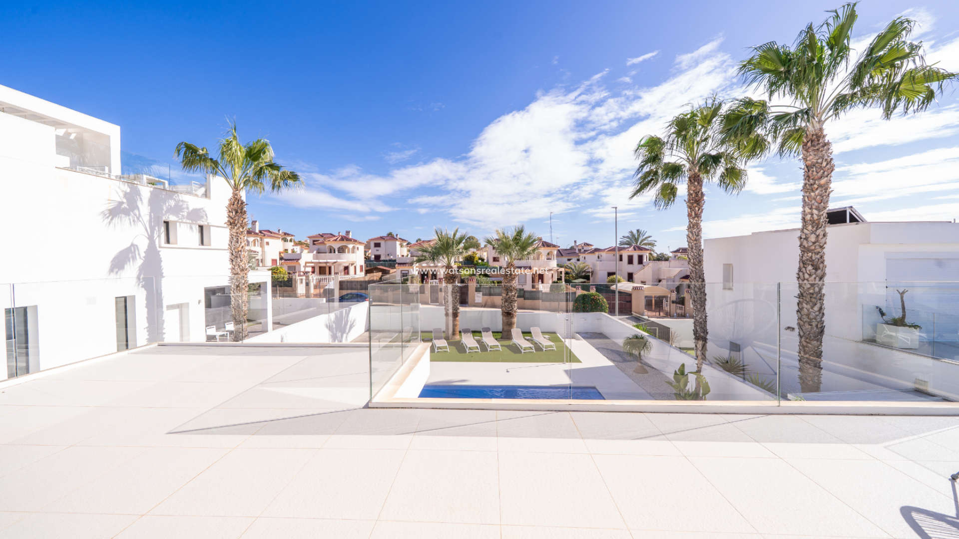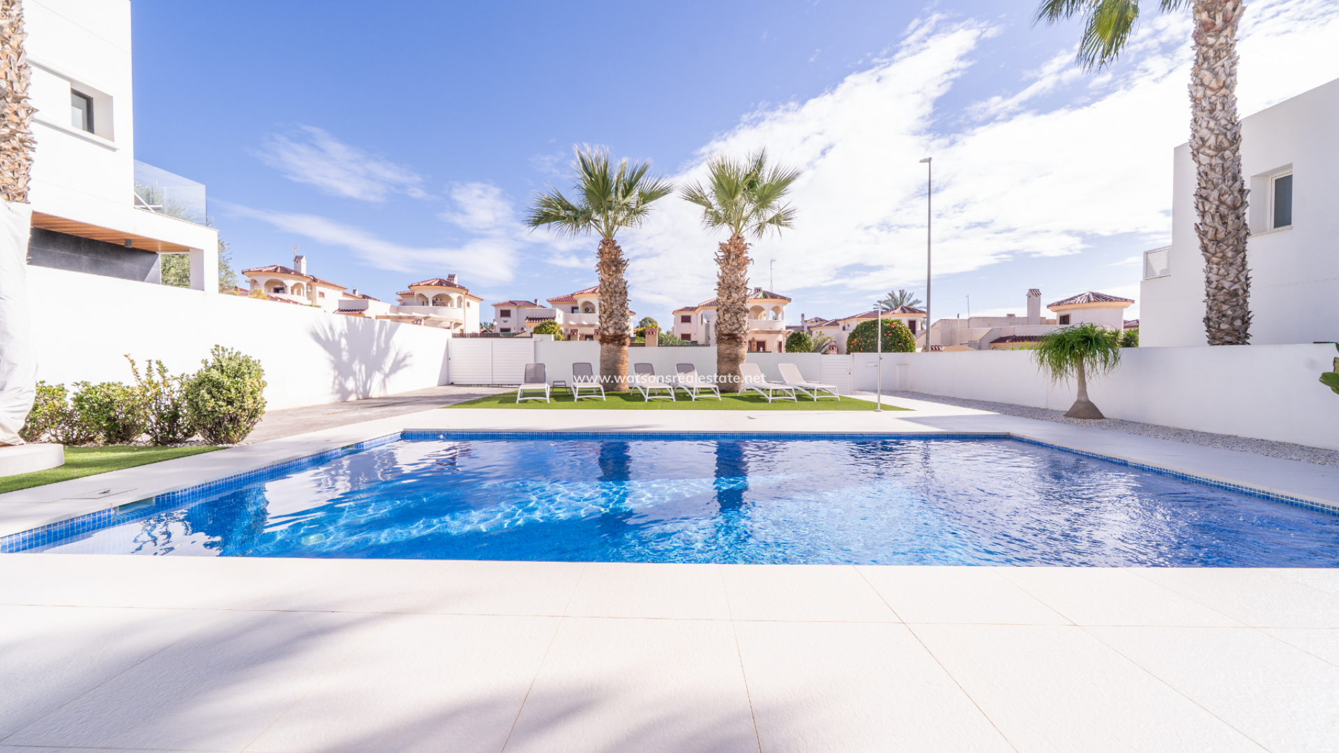 De villa beschikt over drie ruime slaapkamers en drie stijlvolle badkamers (waarvan 2 en-suite), allemaal afgewerkt volgens een hoge standaard met LED-spiegels, verhoogde toiletten en kamerbrede douches. De hoofdslaapkamer profiteert van een inloopkast en een van de en-suite badkamers. De open woon-, eet- en keukenruimte is volledig geïntegreerd en bevat een ontbijtbar, wat een praktische en sociale ruimte creëert, terwijl een aparte bijkeuken dagelijks gemak toevoegt. Op de bovenverdieping wordt de overloop gebruikt als studeer- of kantoorruimte, met toegang tot een zonneterras, dat ook toegankelijk is vanuit beide slaapkamers boven via openslaande deuren.