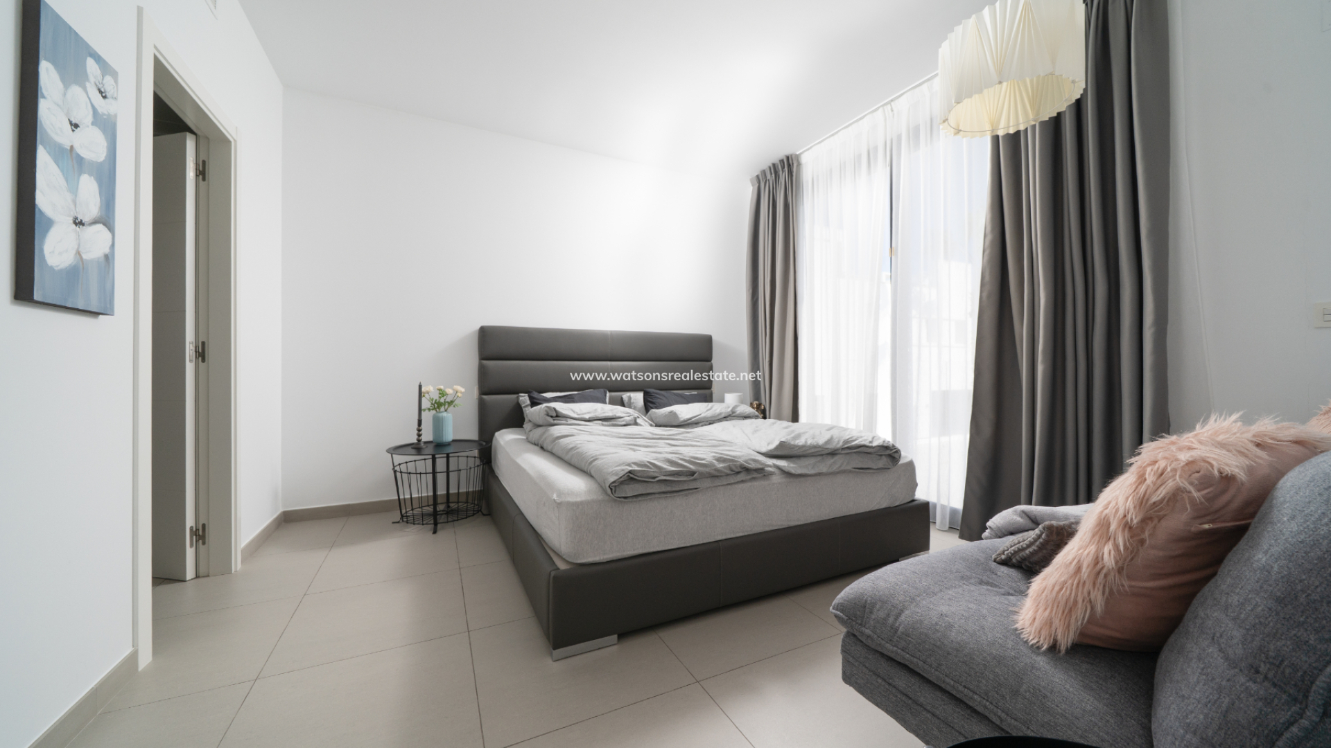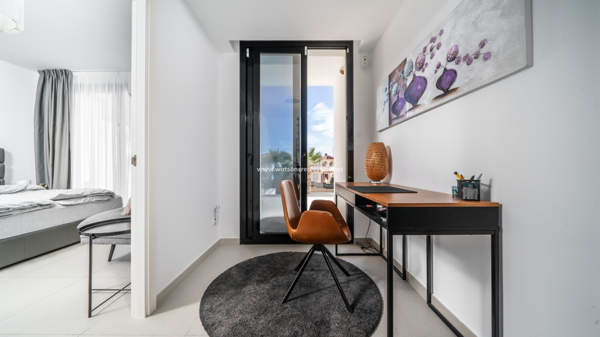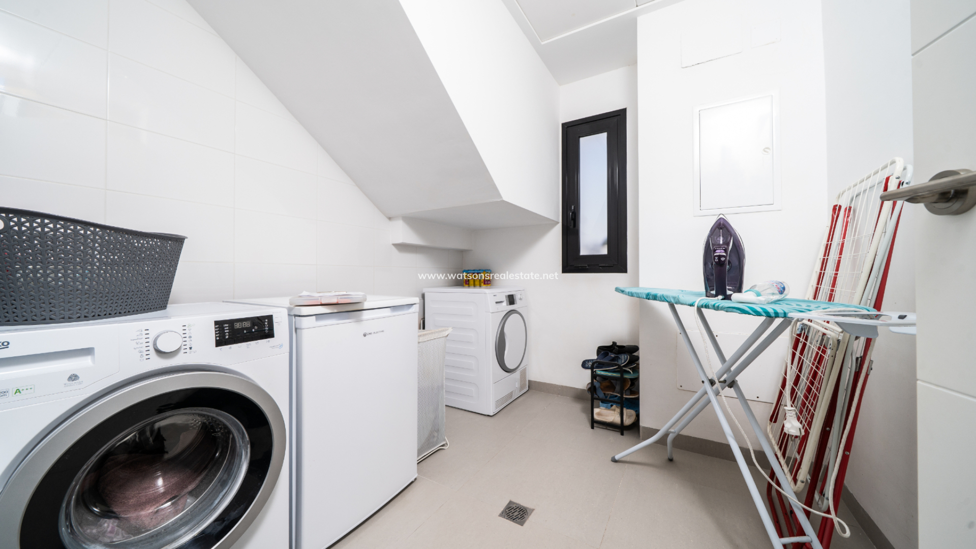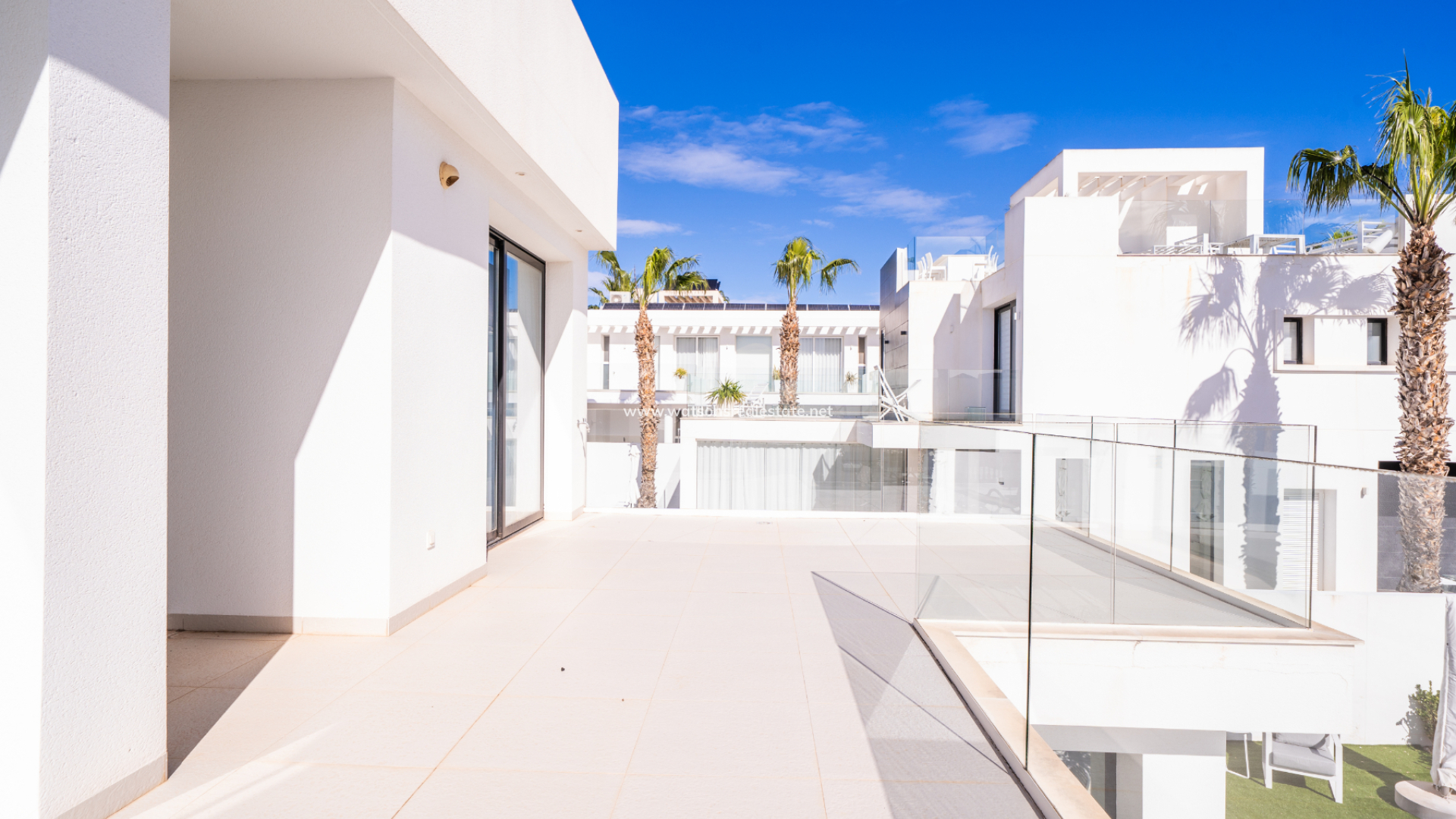 De villa beschikt over drie ruime slaapkamers en drie stijlvolle badkamers (waarvan 2 en-suite), allemaal afgewerkt volgens een hoge standaard met LED-spiegels, verhoogde toiletten en kamerbrede douches. De hoofdslaapkamer profiteert van een inloopkast en een van de en-suite badkamers. De open woon-, eet- en keukenruimte is volledig geïntegreerd en bevat een ontbijtbar, wat een praktische en sociale ruimte creëert, terwijl een aparte bijkeuken dagelijks gemak toevoegt. Op de bovenverdieping wordt de overloop gebruikt als studeer- of kantoorruimte, met toegang tot een zonneterras, dat ook toegankelijk is vanuit beide slaapkamers boven via openslaande deuren.