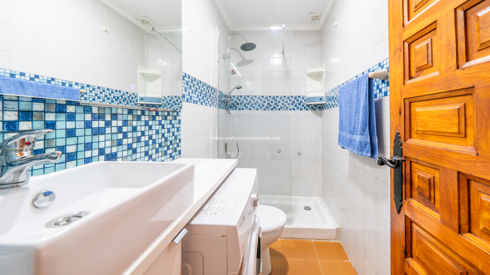 The bathroom features a modern walk-in shower, WC, and vanity unit, and also benefits from a washing machine, adding extra convenience for longer stays or rental guests.
