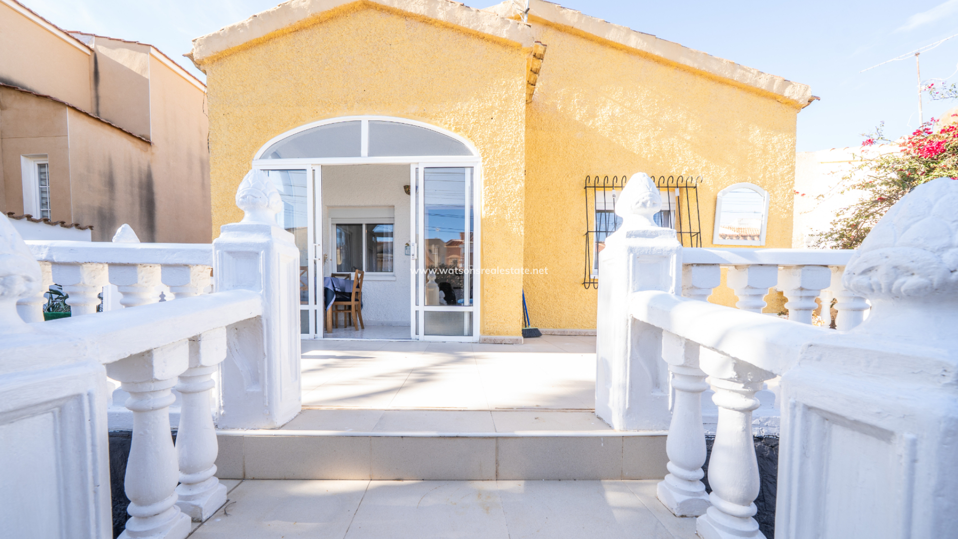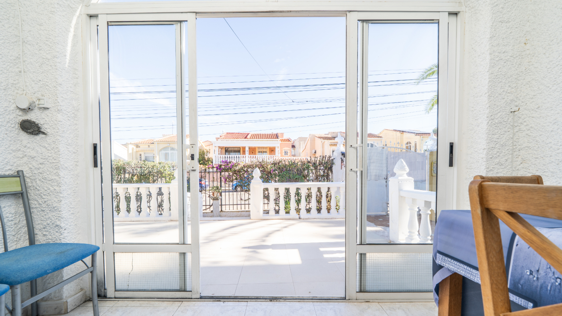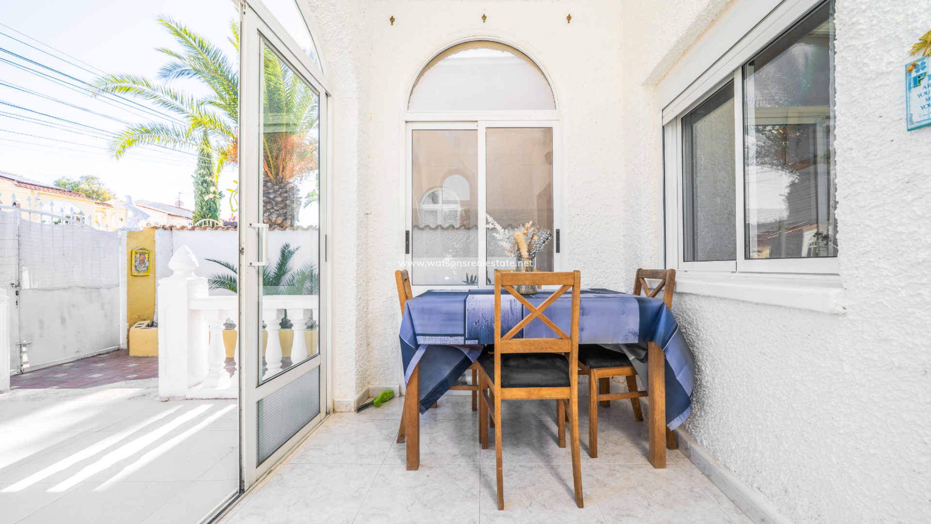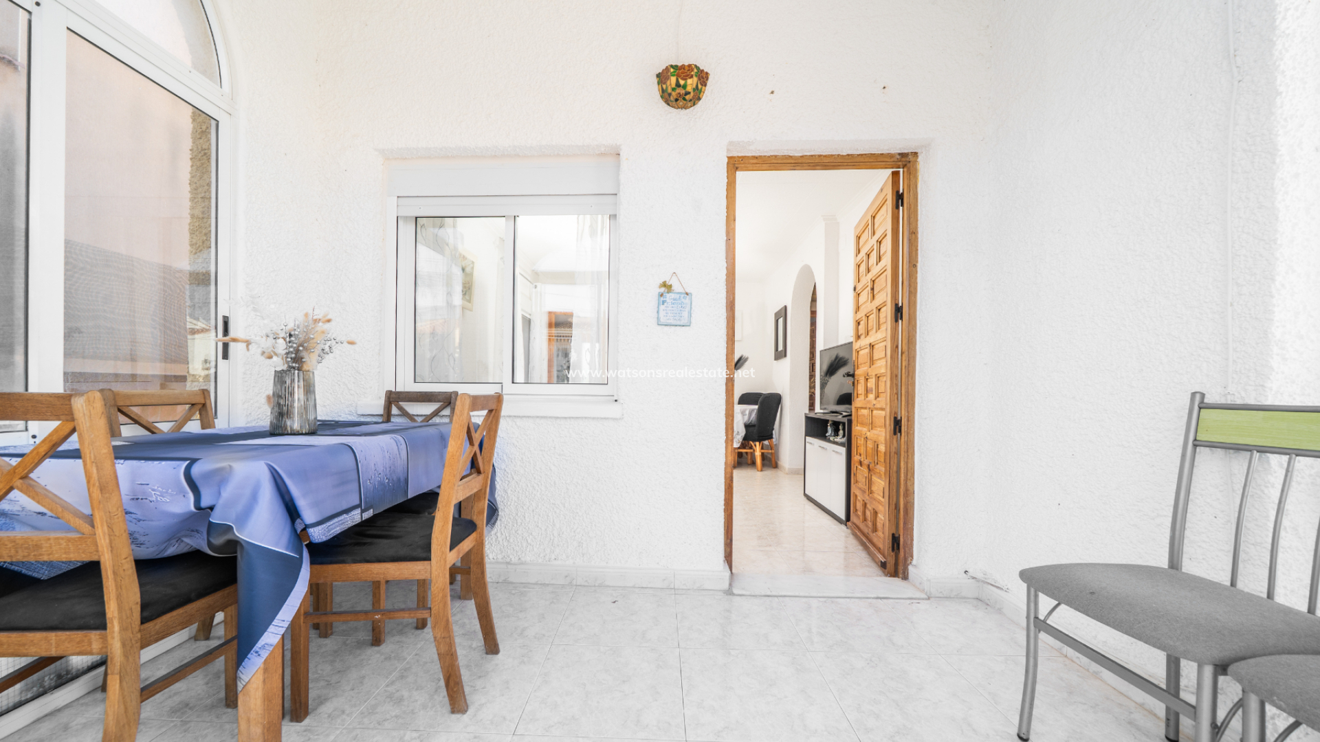 The property greets you with a generous front sun terrace, accented by elegant balustrades and accessible from multiple points. This outdoor space transitions into a bright, glazed porch currently used as a dining area, which serves as the gateway to the home’s interior.