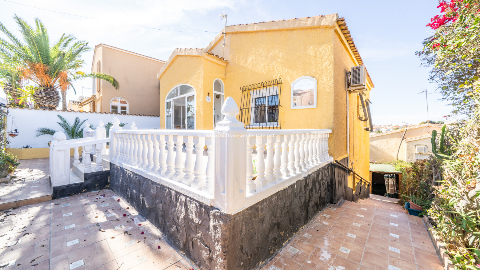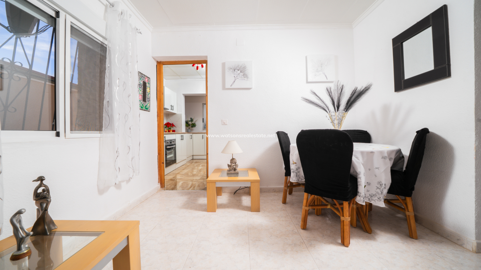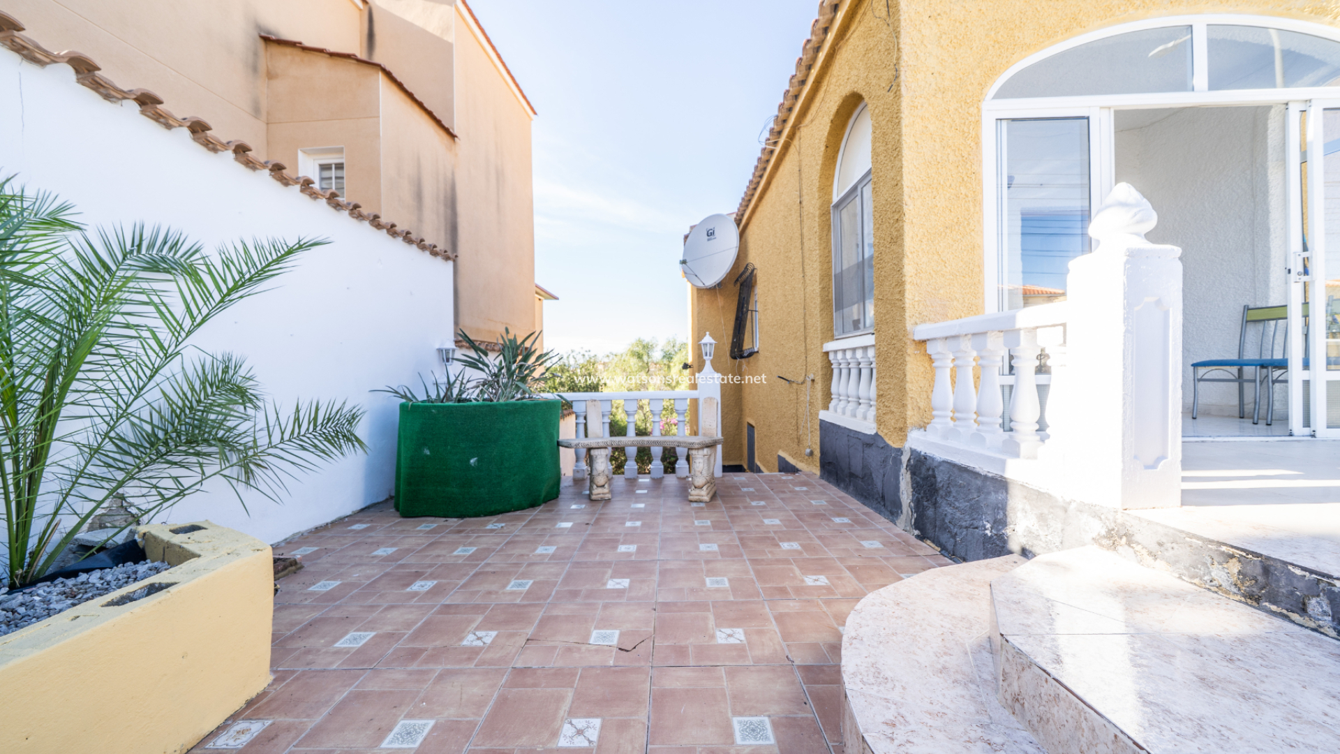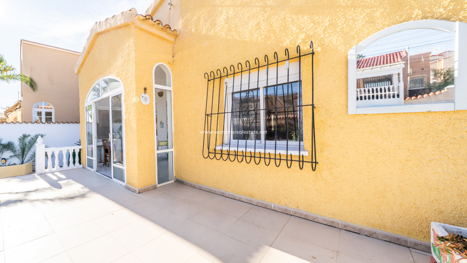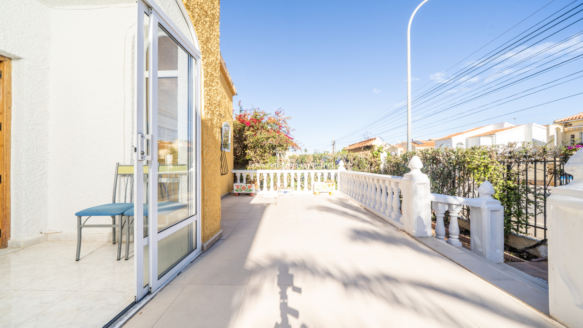 The property greets you with a generous front sun terrace, accented by elegant balustrades and accessible from multiple points. This outdoor space transitions into a bright, glazed porch currently used as a dining area, which serves as the gateway to the home’s interior.