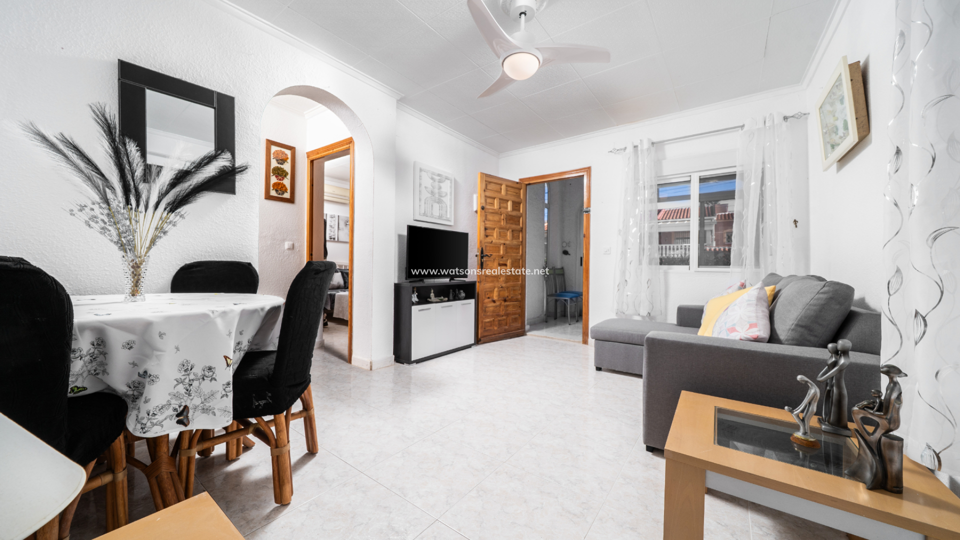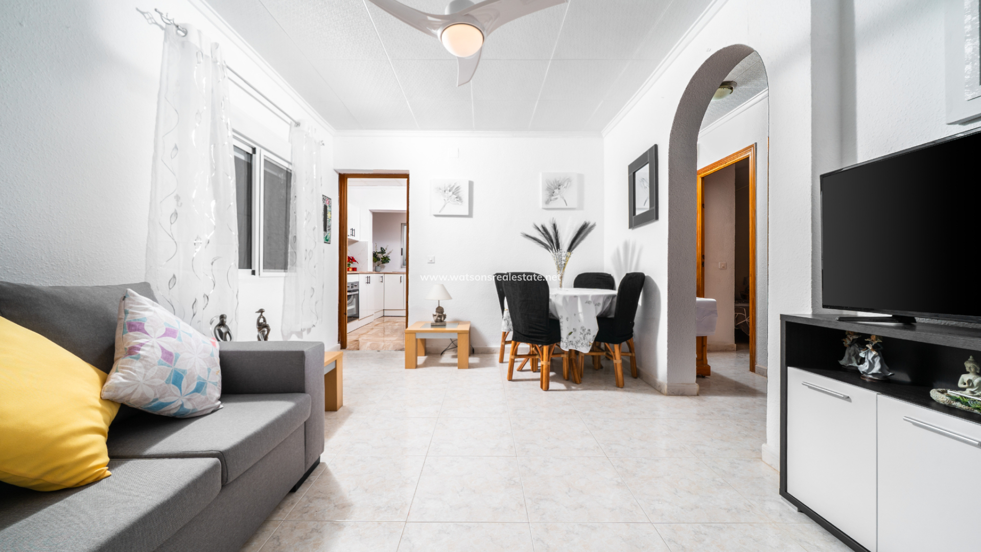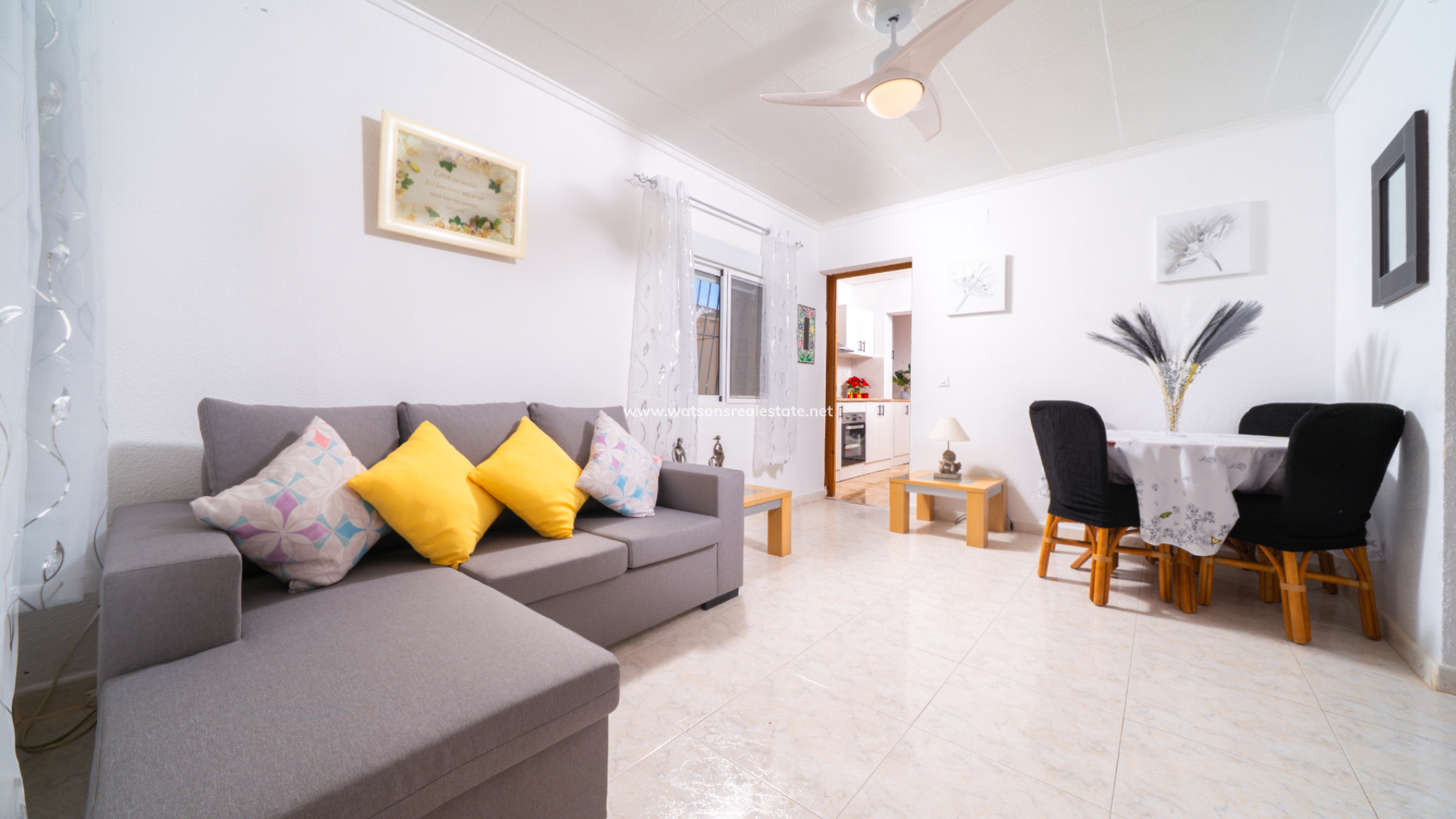 Inside, the inviting living room comes equipped with a ceiling fan and a dedicated dining space, flowing seamlessly into a separate, modernized kitchen that feels both airy and spacious.