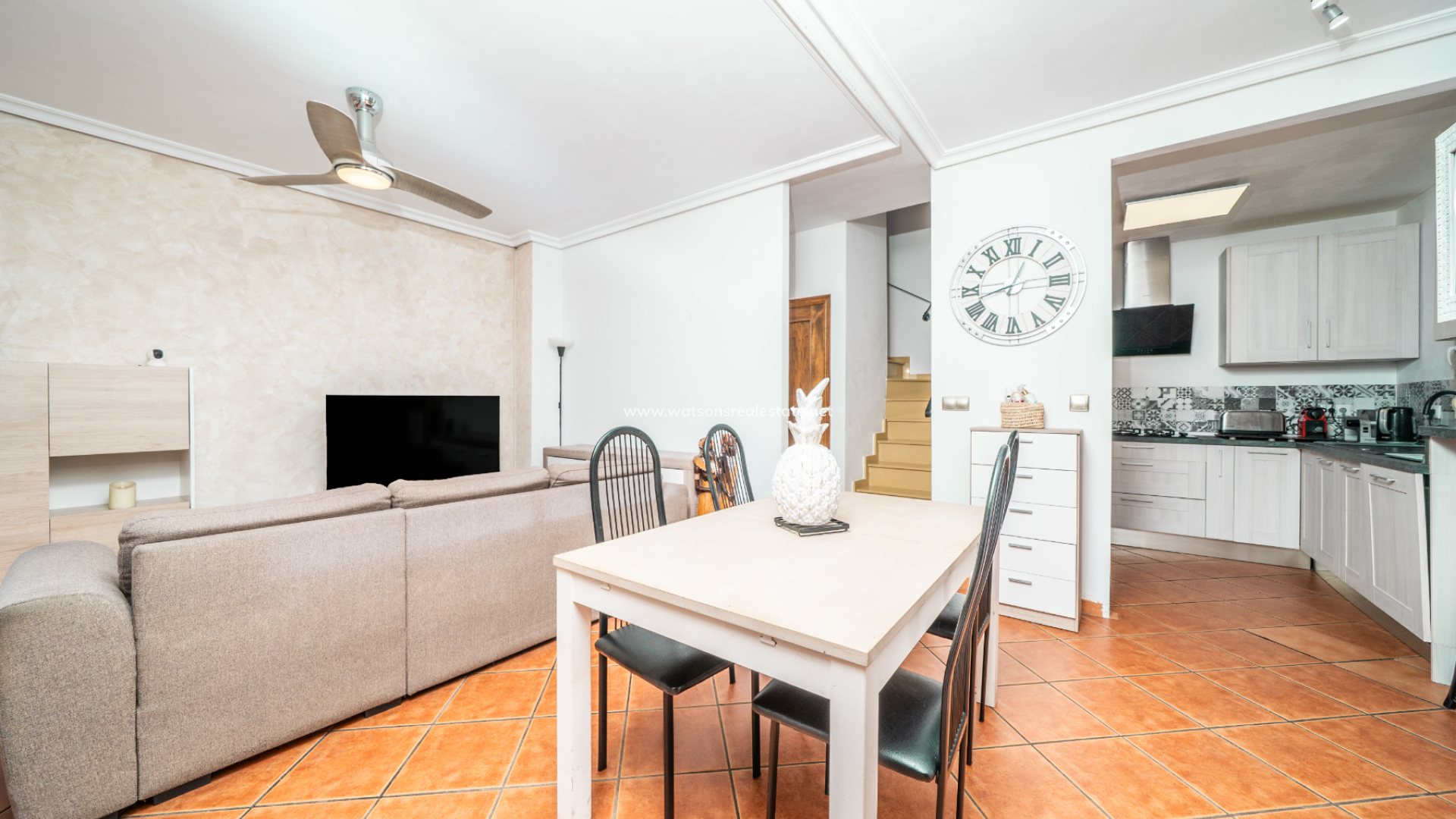Inside, the living room is bright and inviting, complete with air conditioning and a ceiling fan for year-round comfort. The open-plan kitchen features a gas hob and breakfast bar, creating a sociable space that connects seamlessly with the main living area. There is also a convenient storage cupboard on the ground floor.