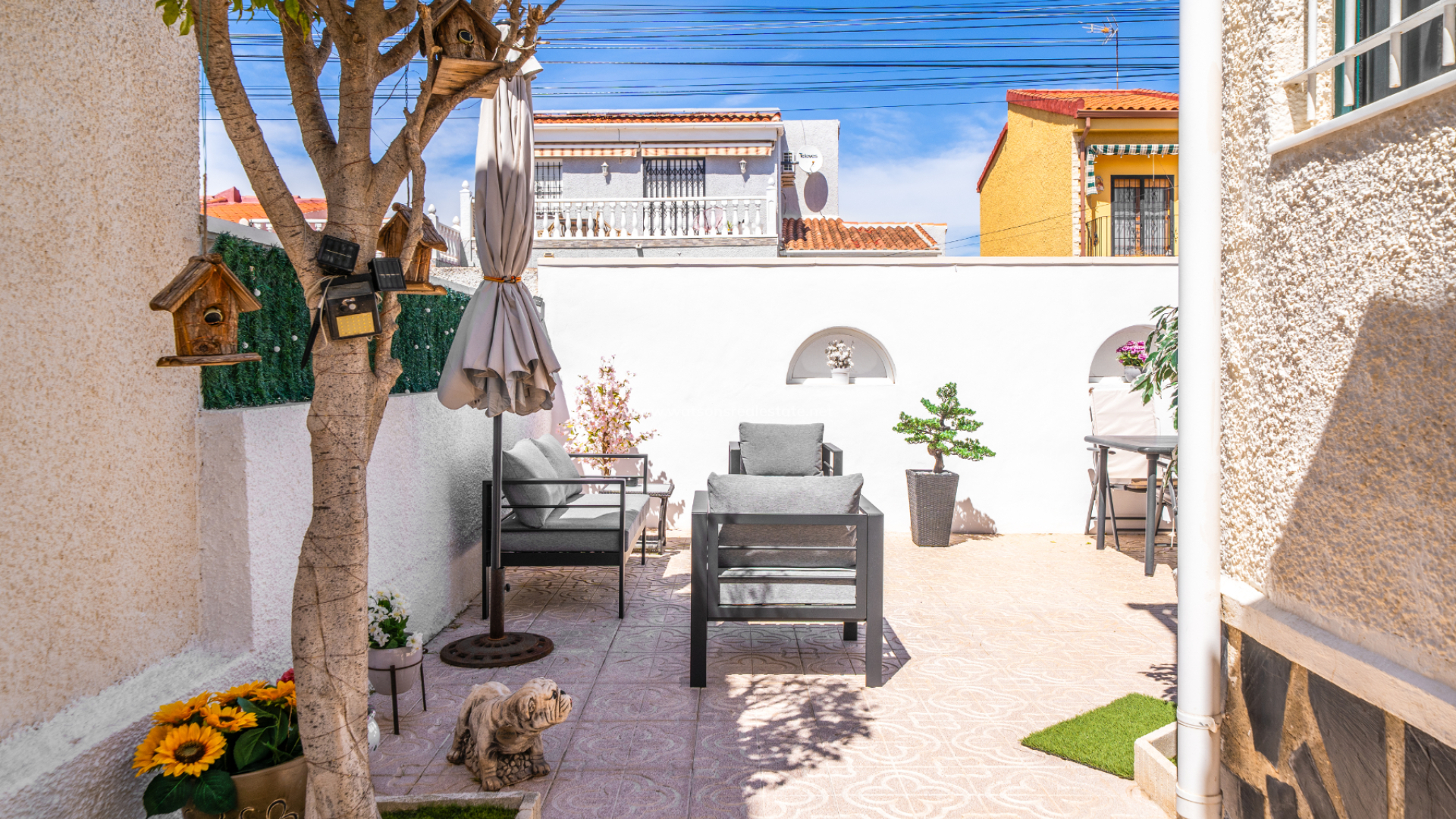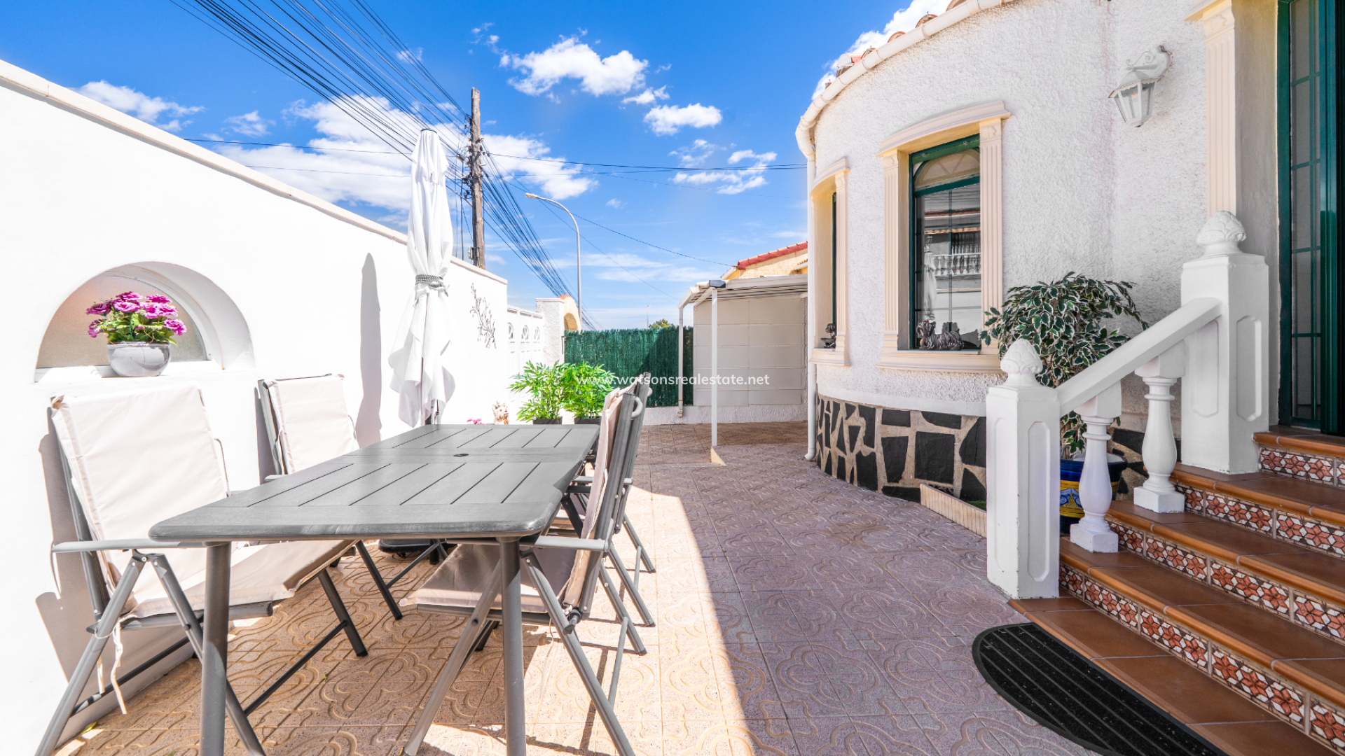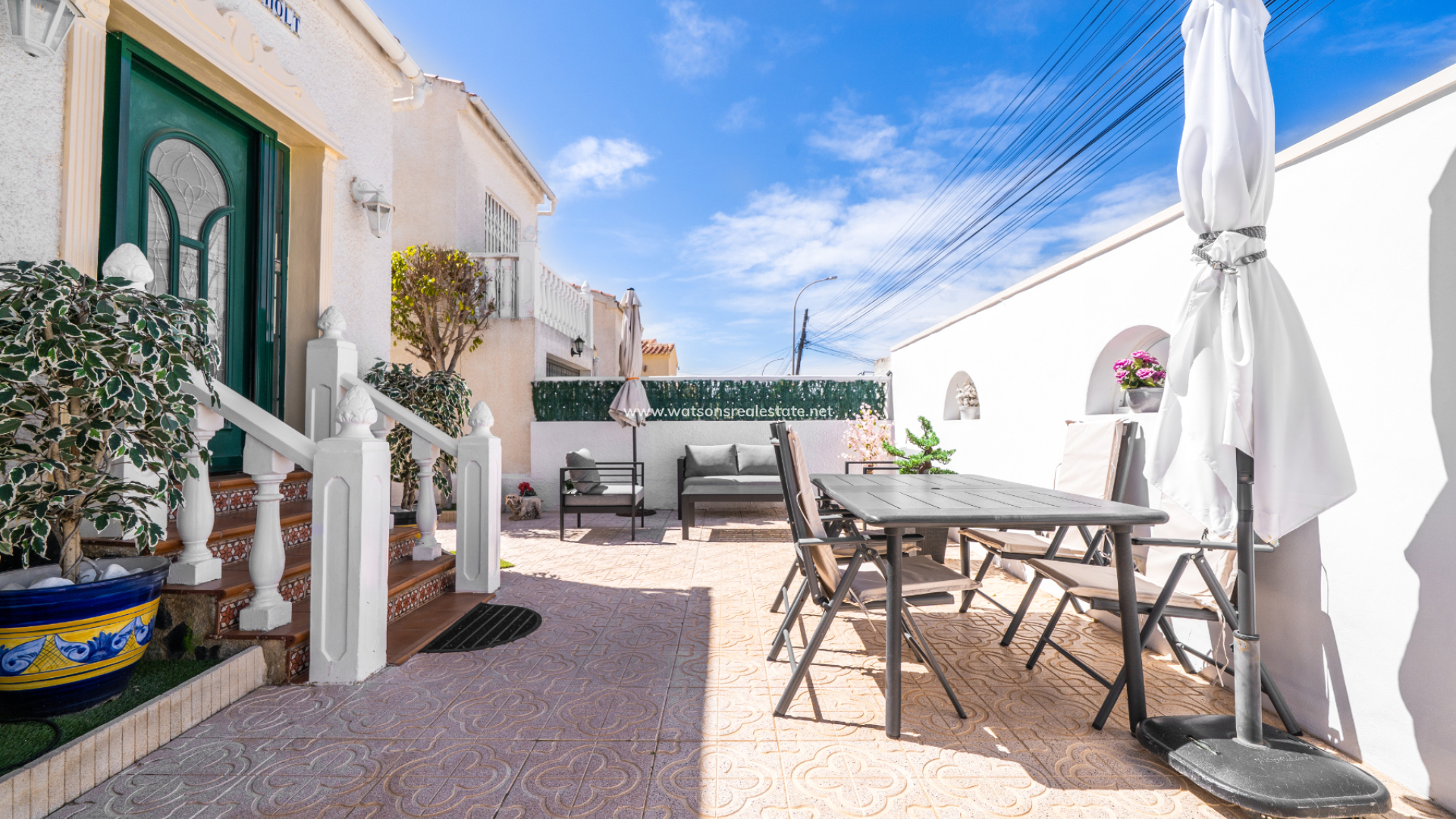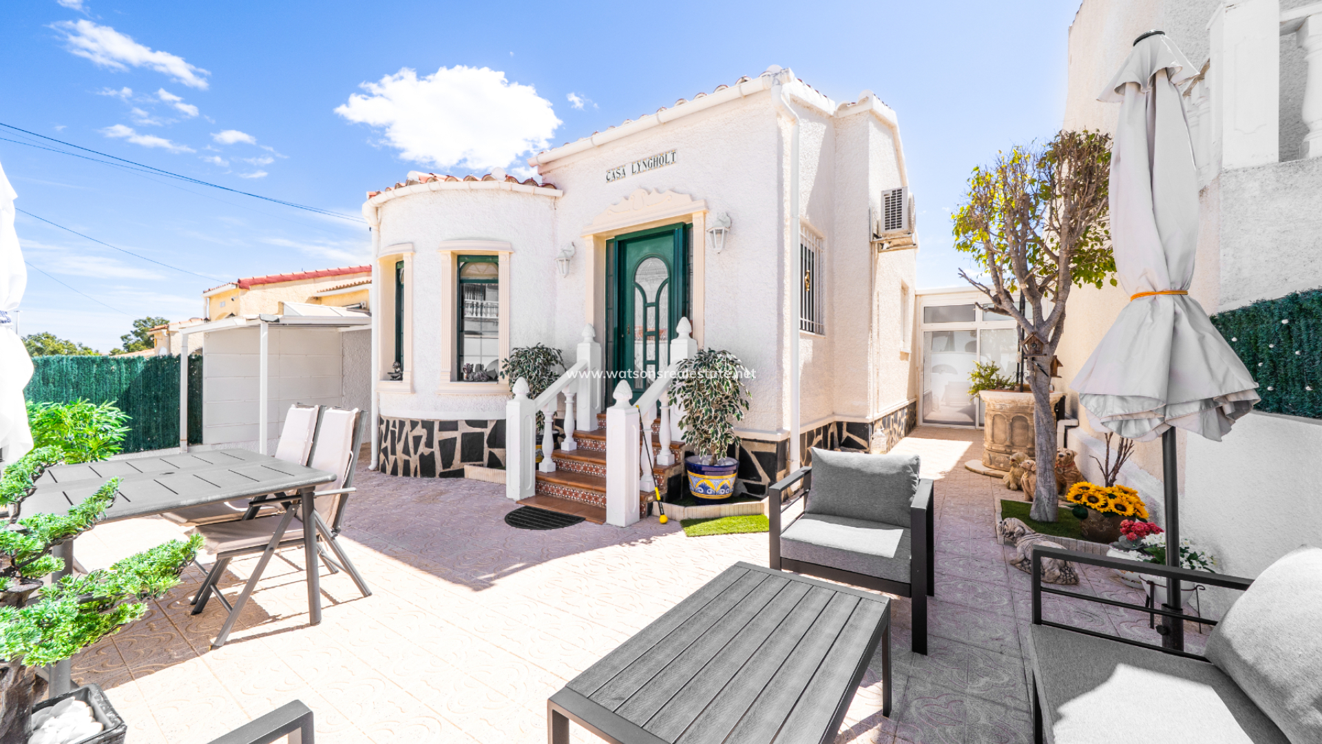 This charming detached “Lola” model property is located in the sought-after Urb. La Marina, This home features a fully paved front garden and a south facing terrace equipped with sun awnings for comfort. This property is located ➡️ only 5-10 minute stroll to the popular “Consum Square” area with supermarkets and an array of bars and restaurants. Further along the road is “The Grey Area” with more eateries and bars, all-in-all a great choice for everyone.