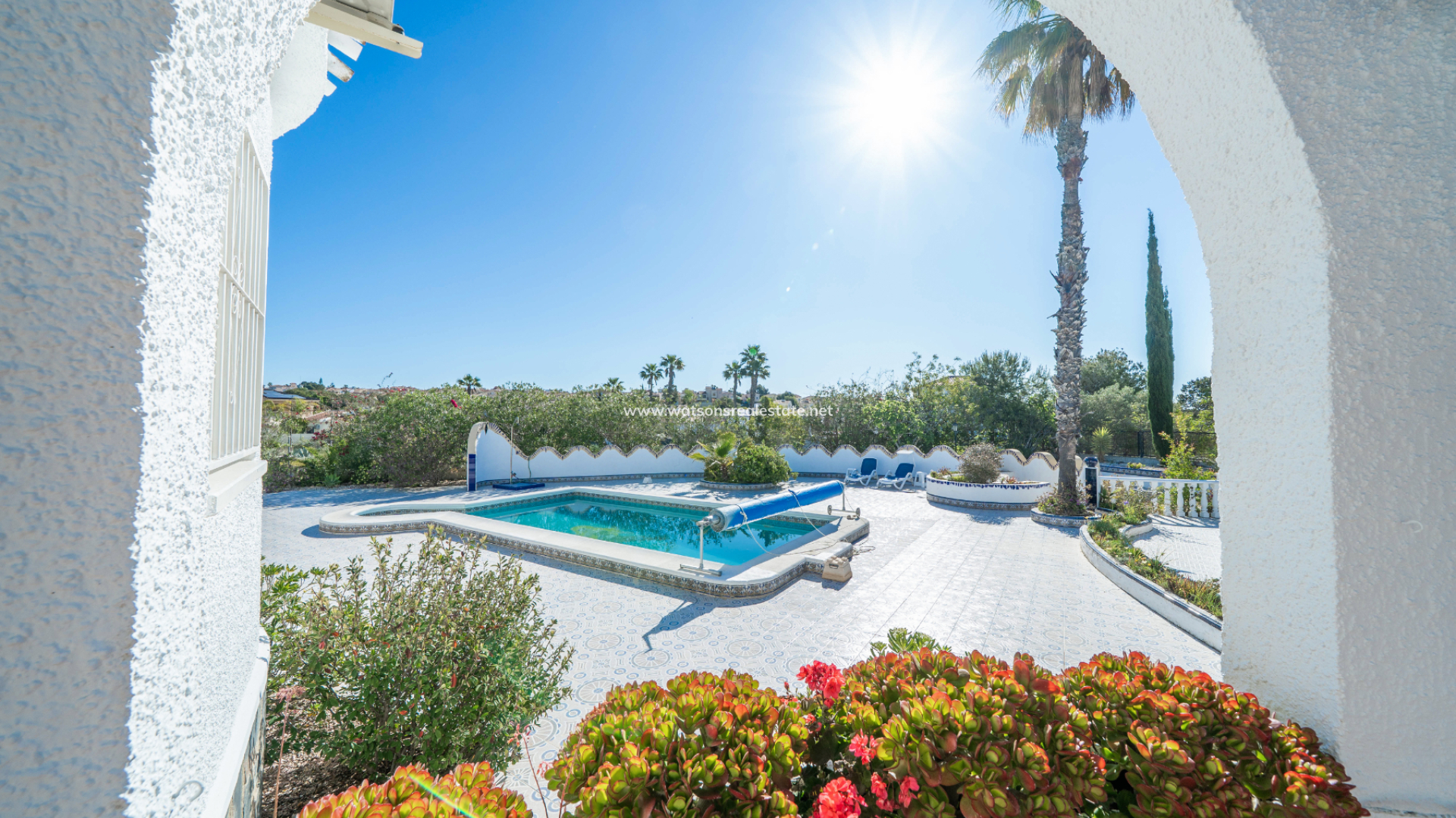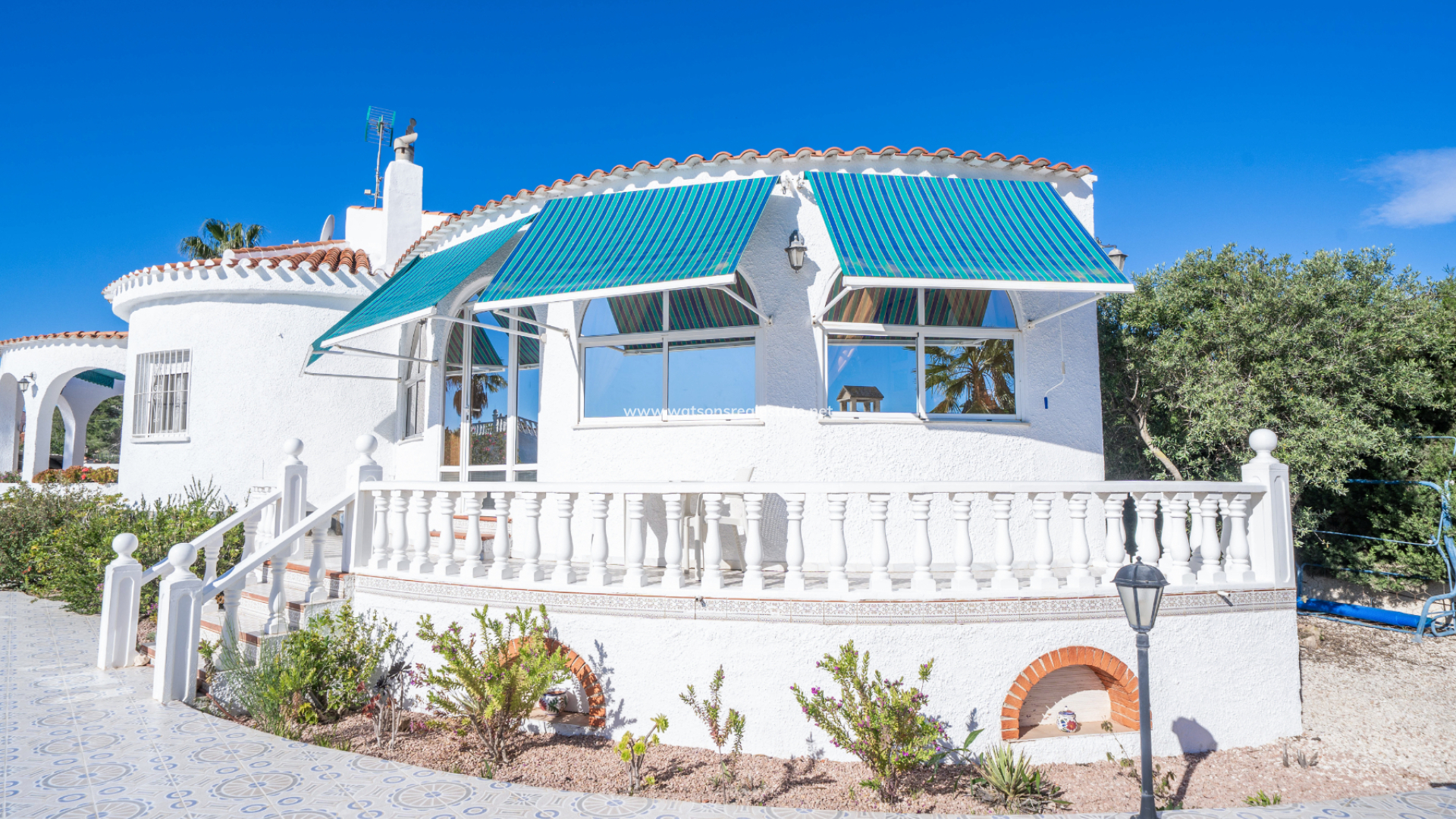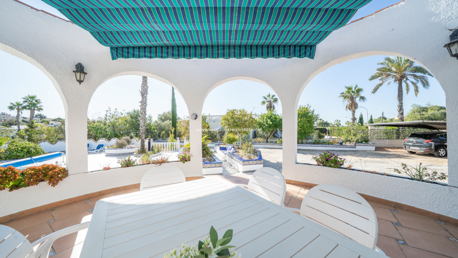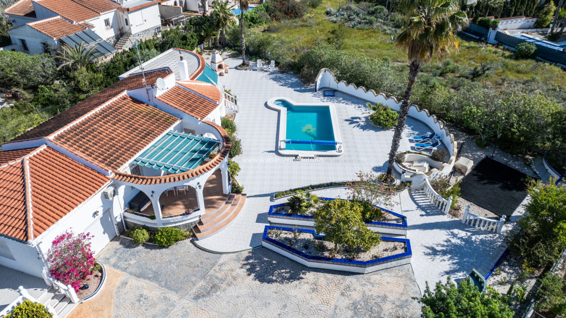 Accessed through an electric gate, the villa sits on beautifully maintained grounds with an irrigation system and enjoys views over the surrounding green area. The expansive plot provides excellent privacy and features ➡️ a superb heated 8 x 3.5 metre swimming pool with exterior shower, ideal for year-round enjoyment. A dedicated BBQ area creates the perfect setting for entertaining family and friends, while the attractive round terrace and additional west-facing terrace, both fitted with sun awnings, offer lovely spaces to relax and enjoy the sunshine throughout the day.