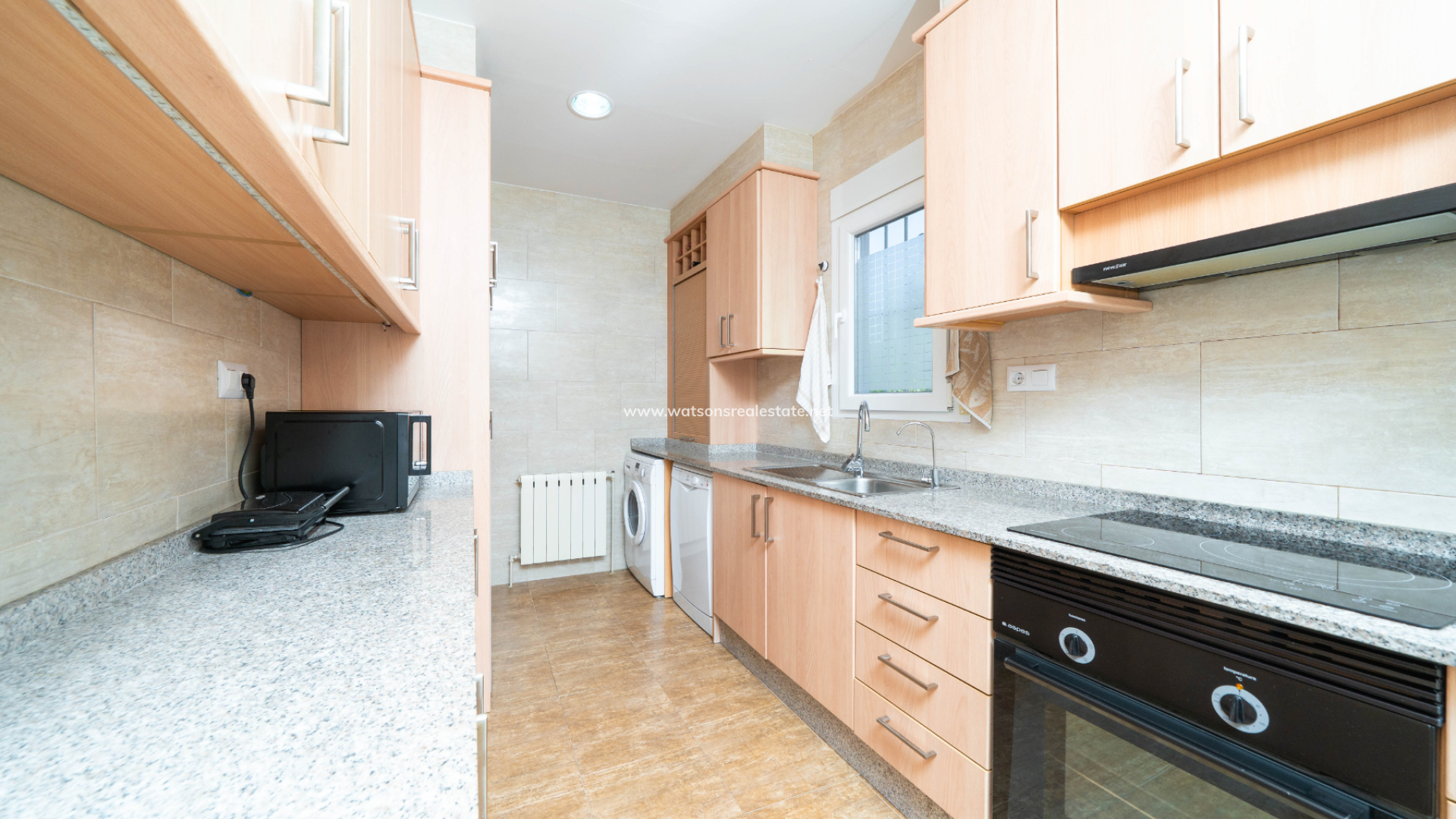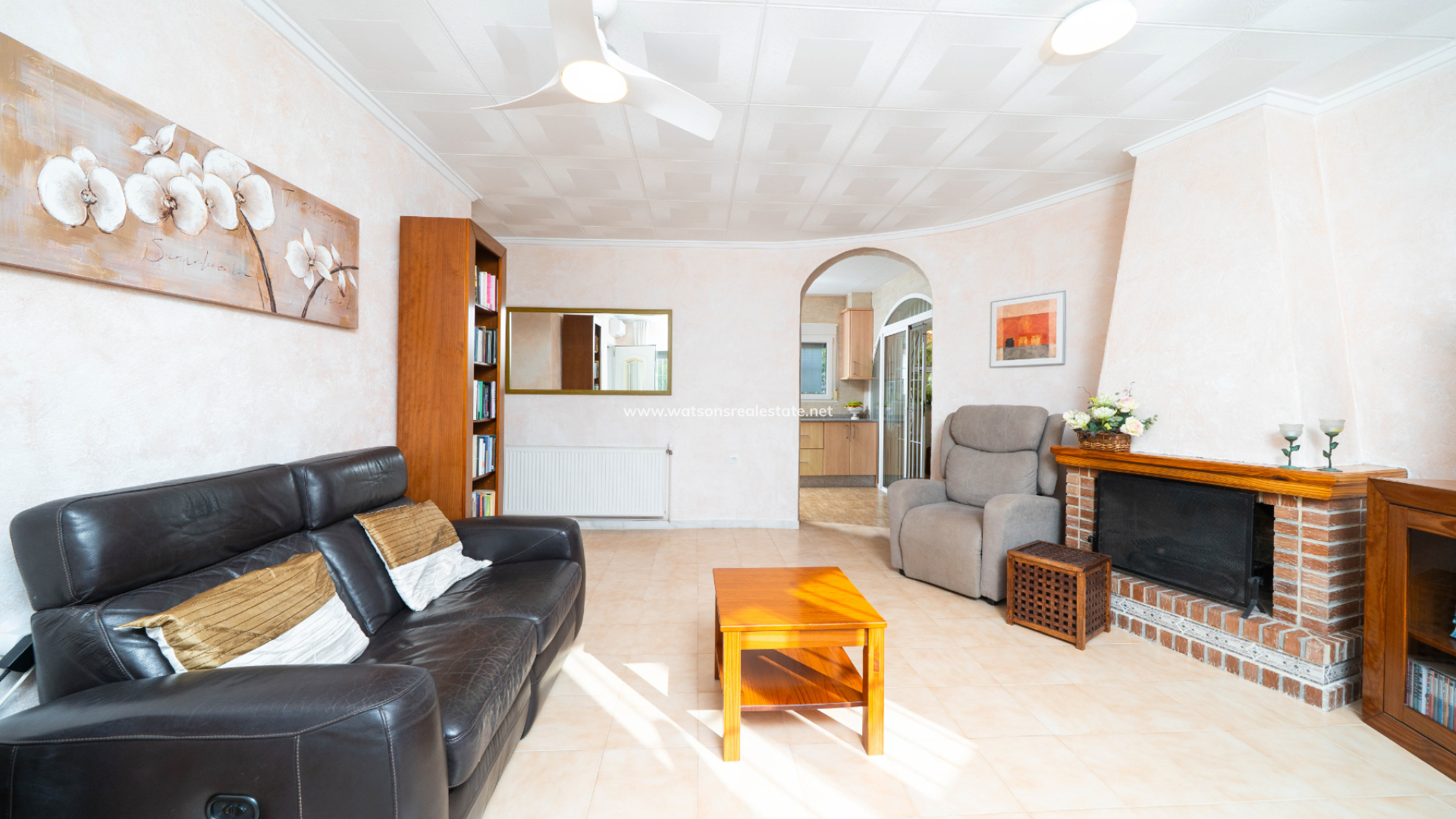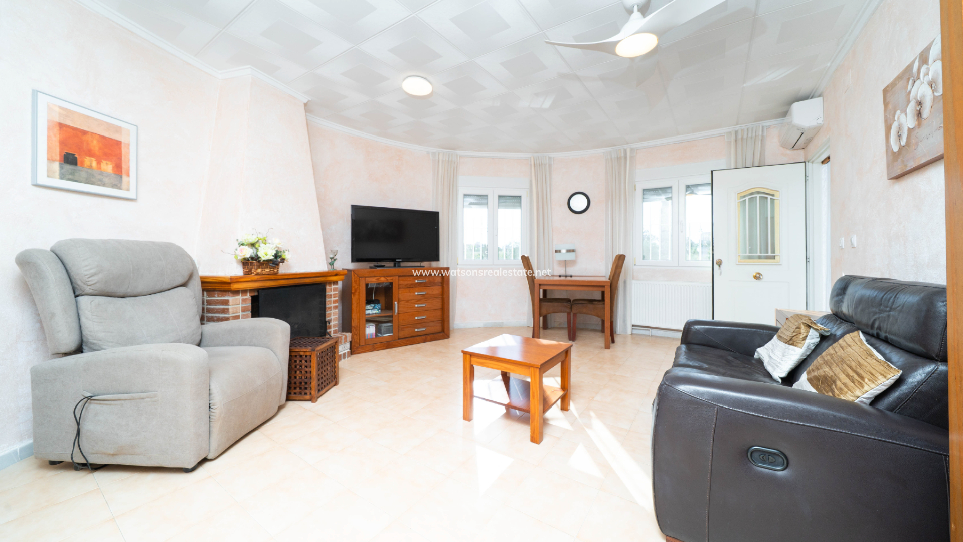 Inside, the property offers a bright and comfortable living room complete with an open fireplace, ceiling fan, and air conditioning, creating a welcoming atmosphere in every season. The kitchen has been tastefully modernised with new units, granite worktops, and all-electric fittings, combining style with practicality.
