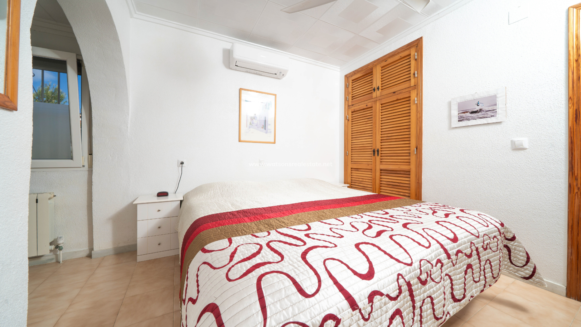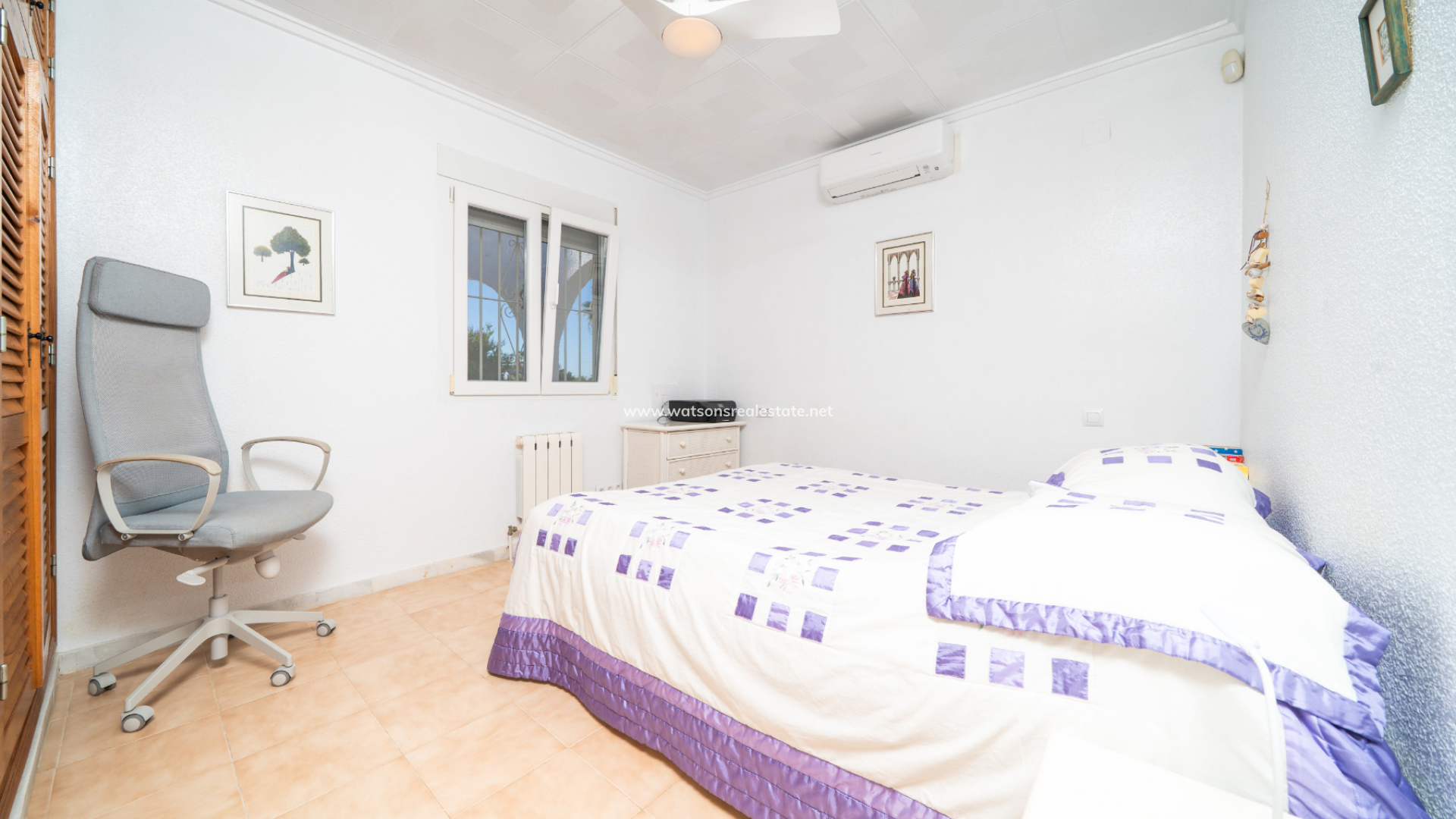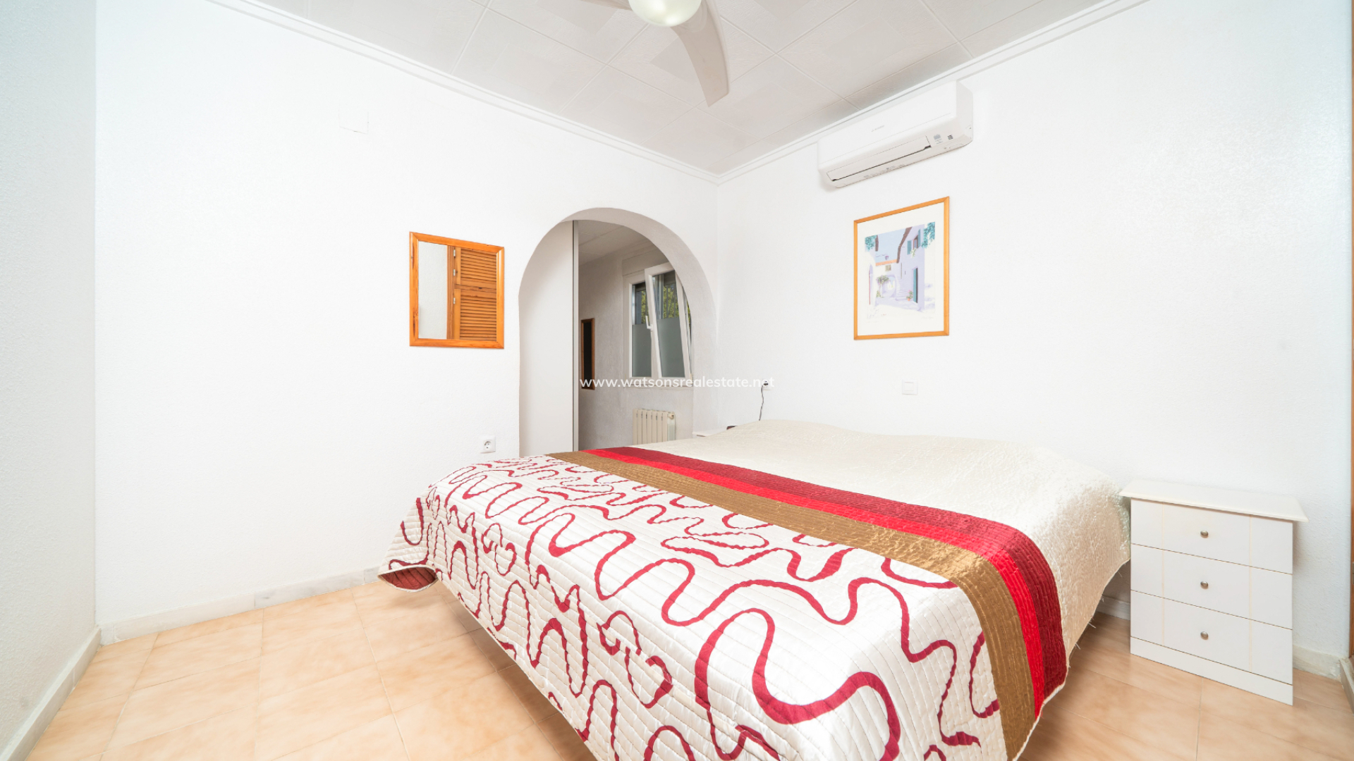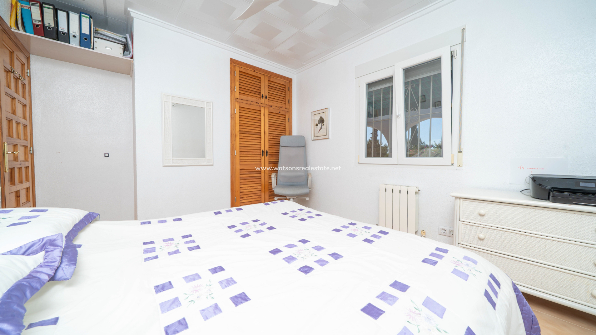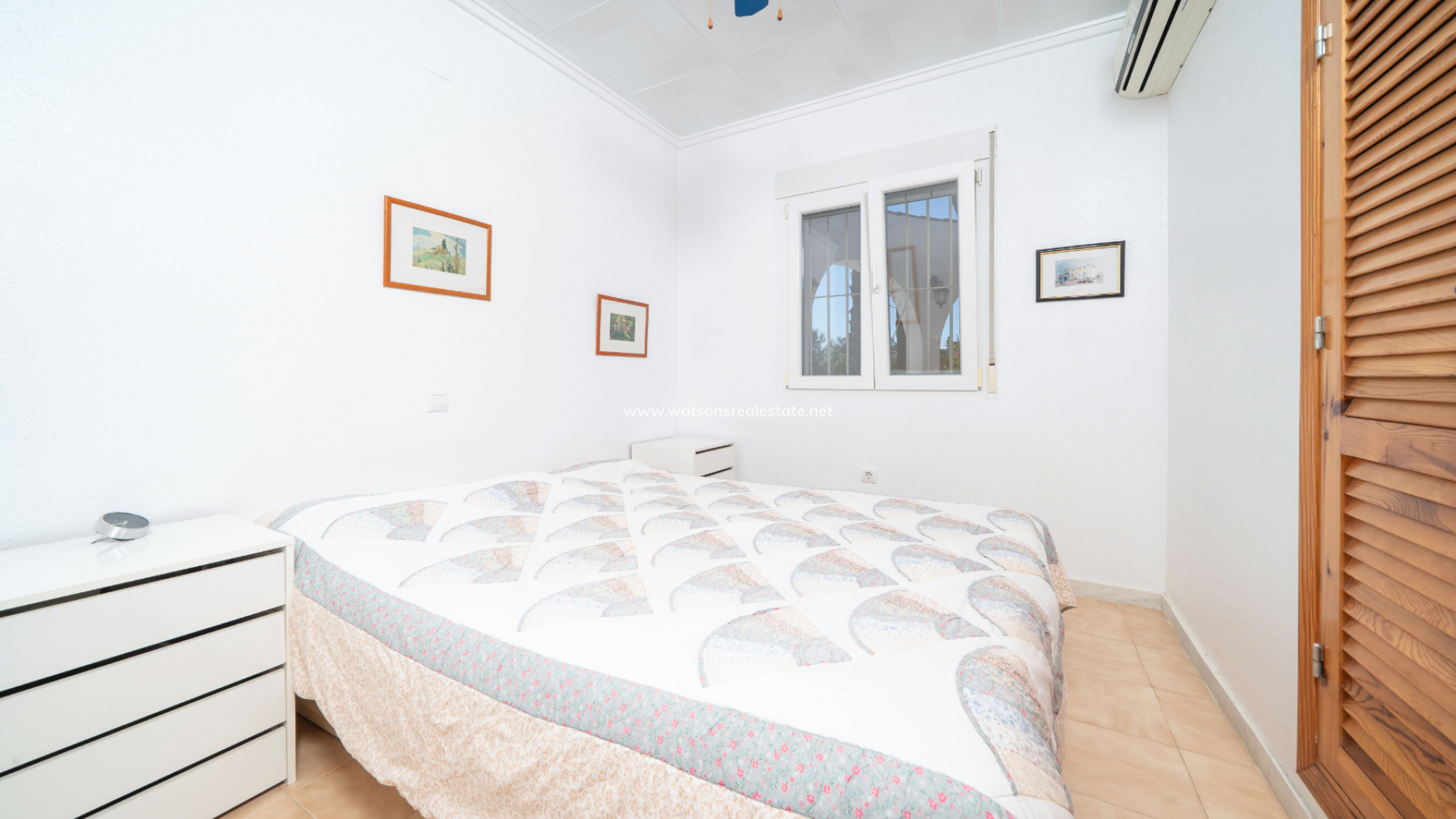 The villa offers three well-proportioned double bedrooms, all fitted with ceiling fans, air conditioning, and fitted wardrobes. The principal bedroom is particularly spacious and benefits from a large fitted wardrobe along with a private en-suite bathroom featuring a corner shower, WC, and vanity unit. The remaining two double bedrooms are served by a modern family bathroom with walk-in shower, WC, vanity unit, and useful storage.