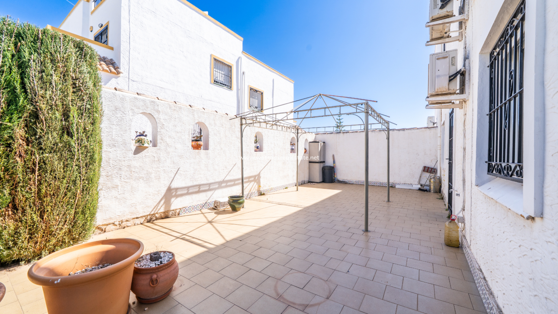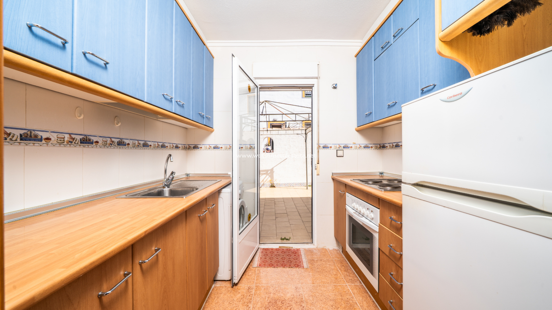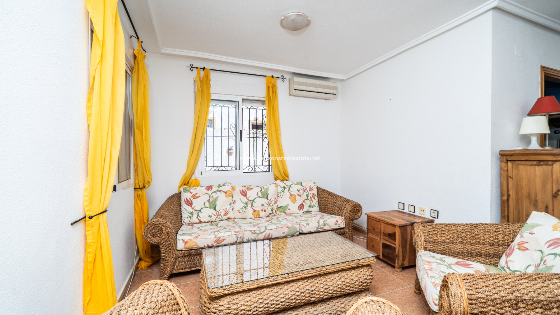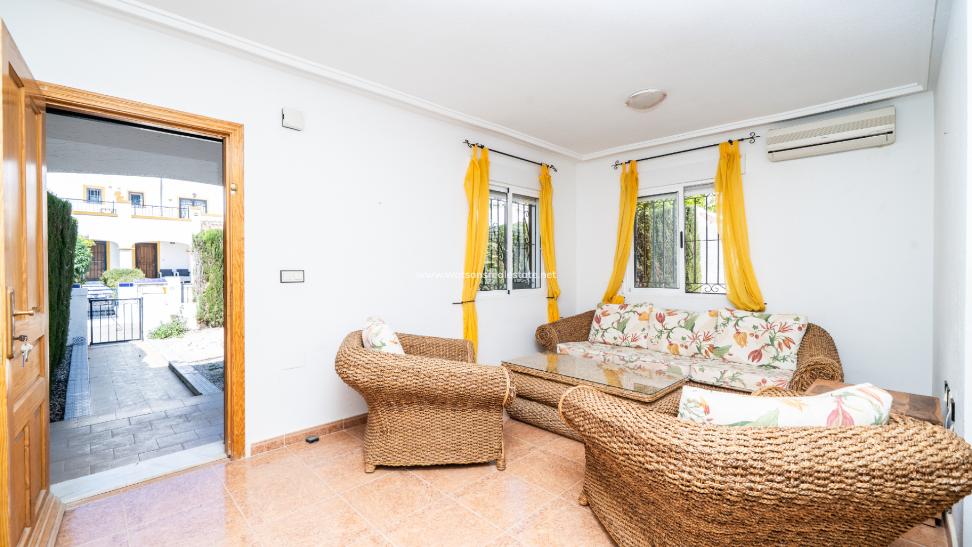 Inside, the living room with dining area is fitted with air conditioning, creating a comfortable environment year-round. The kitchen is independent and fully fitted, with a door leading out to the side garden.