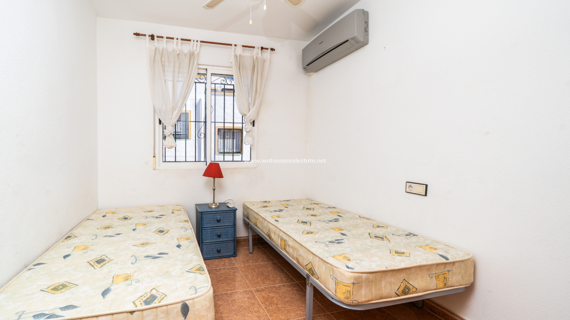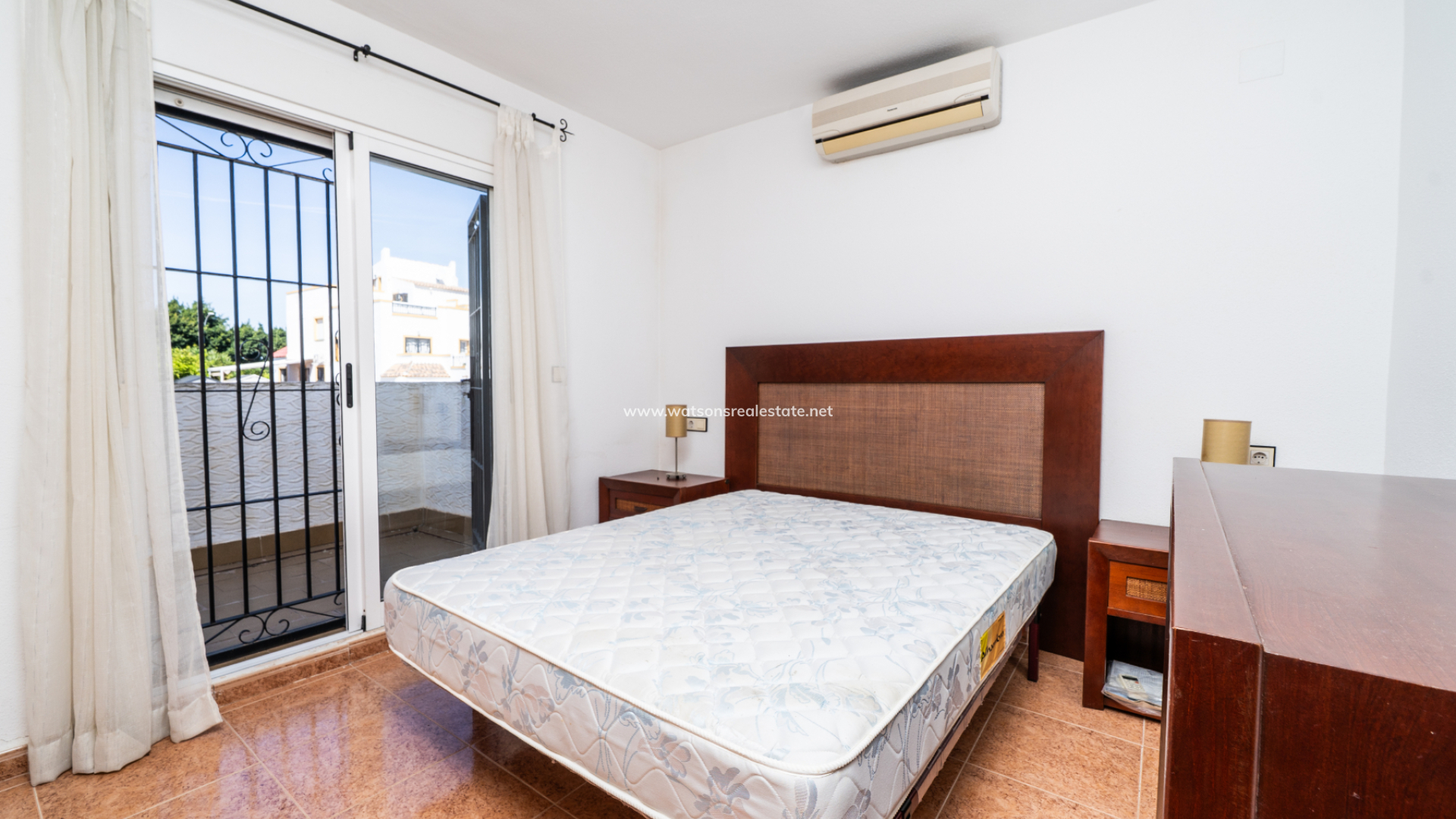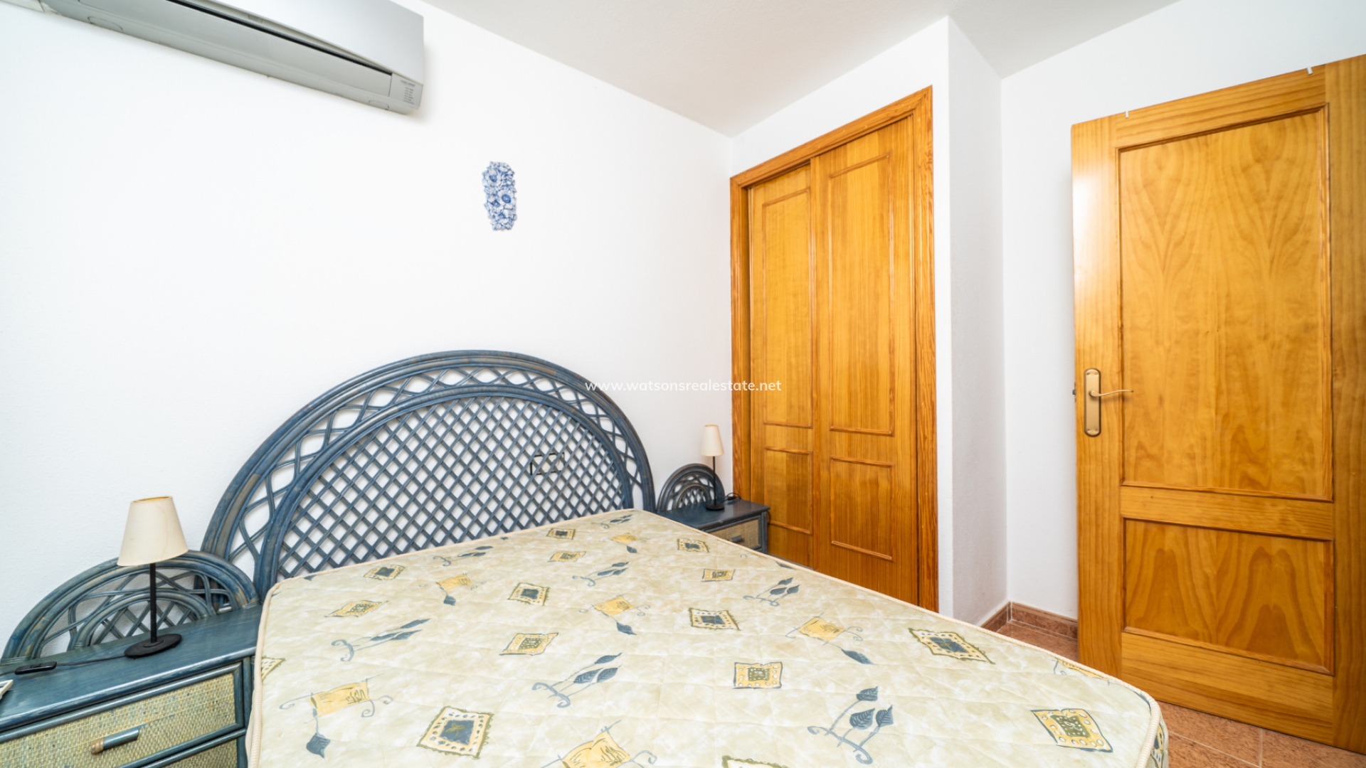 The property offers three bedrooms. The main bedroom includes air conditioning and a fitted wardrobe as well as sliding patio doors to a private balcony. The second bedroom is a twin room with a fitted wardrobe, air conditioning, and a ceiling fan. The third bedroom is a double, also with a fitted wardrobe and air conditioning.