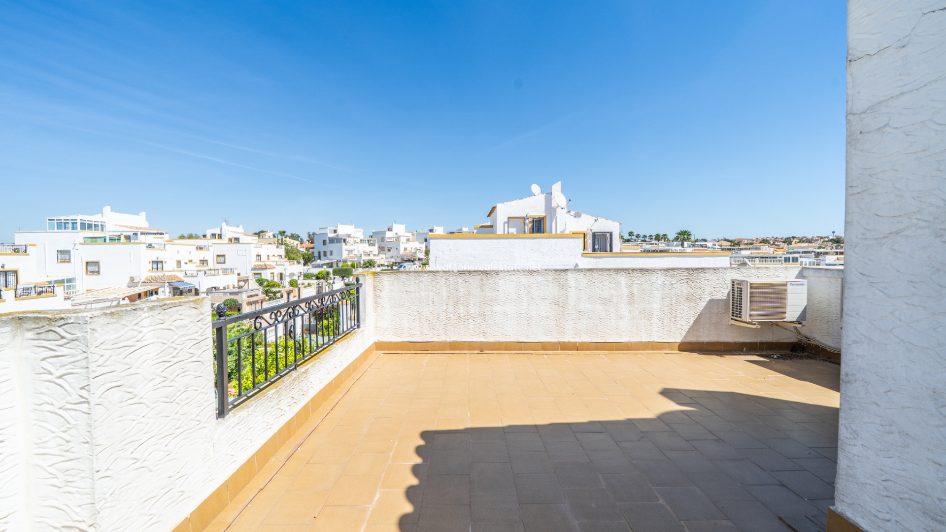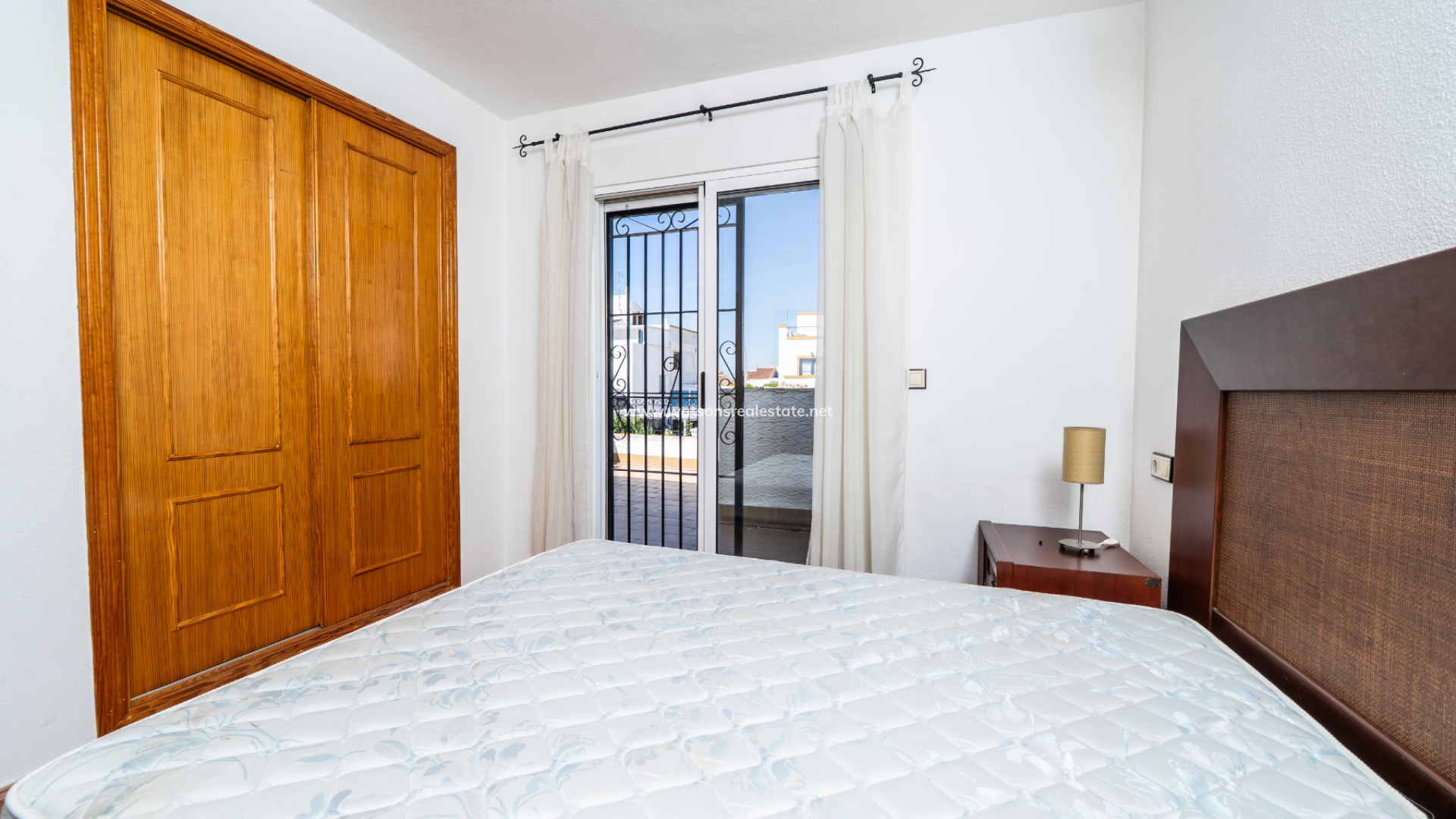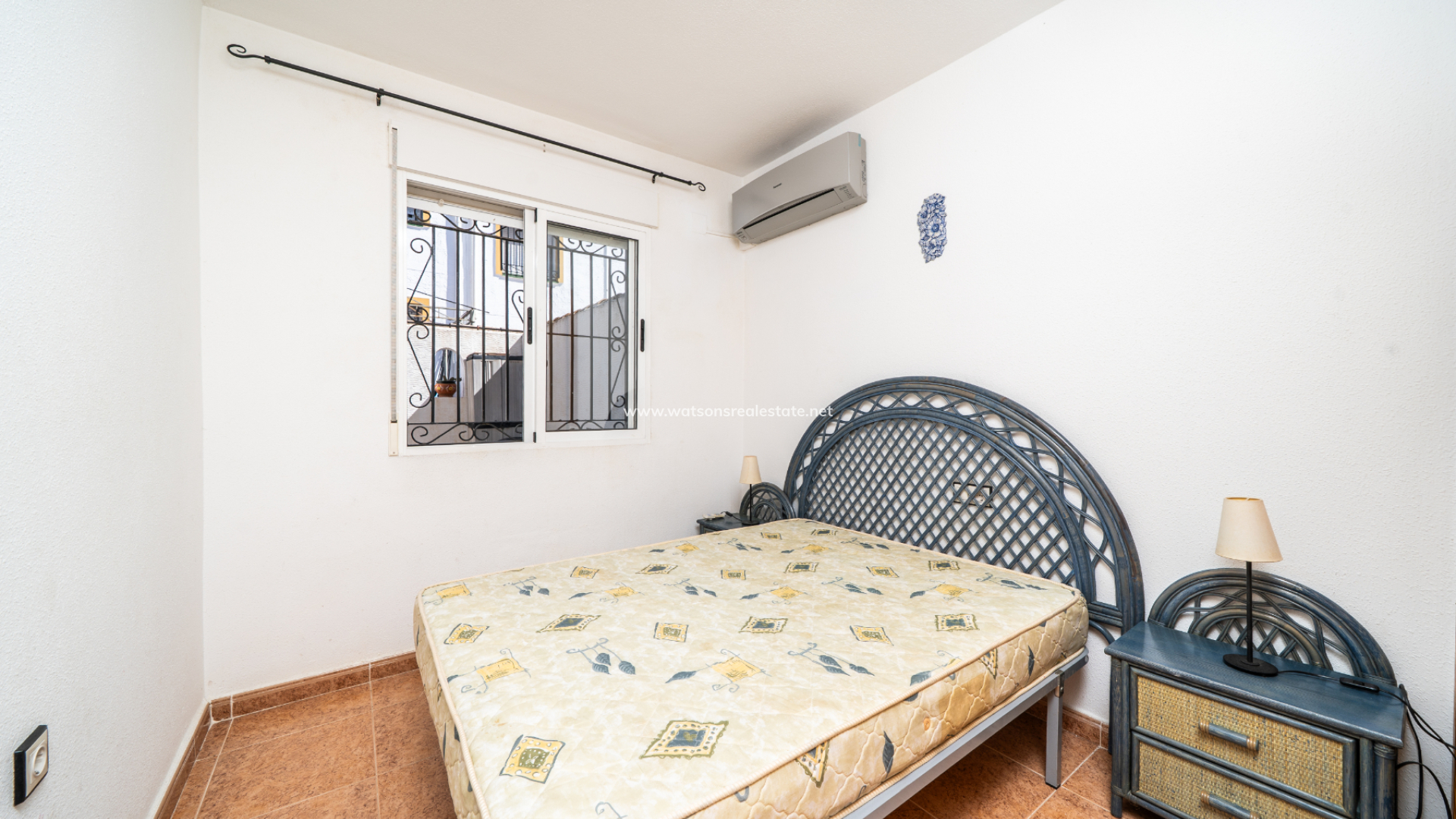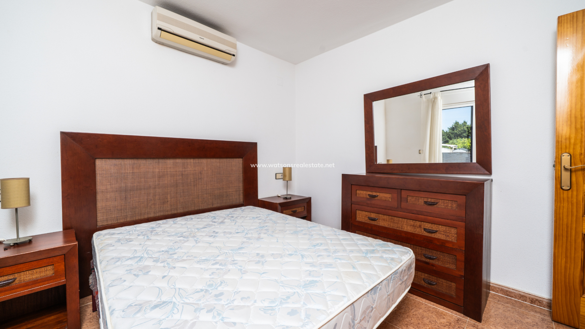 The property offers three bedrooms. The main bedroom includes air conditioning and a fitted wardrobe as well as sliding patio doors to a private balcony. The second bedroom is a twin room with a fitted wardrobe, air conditioning, and a ceiling fan. The third bedroom is a double, also with a fitted wardrobe and air conditioning.